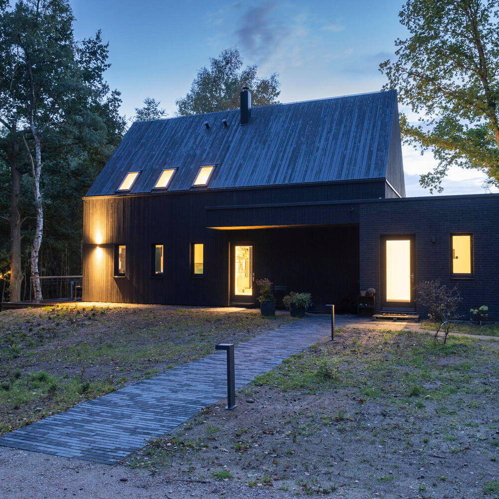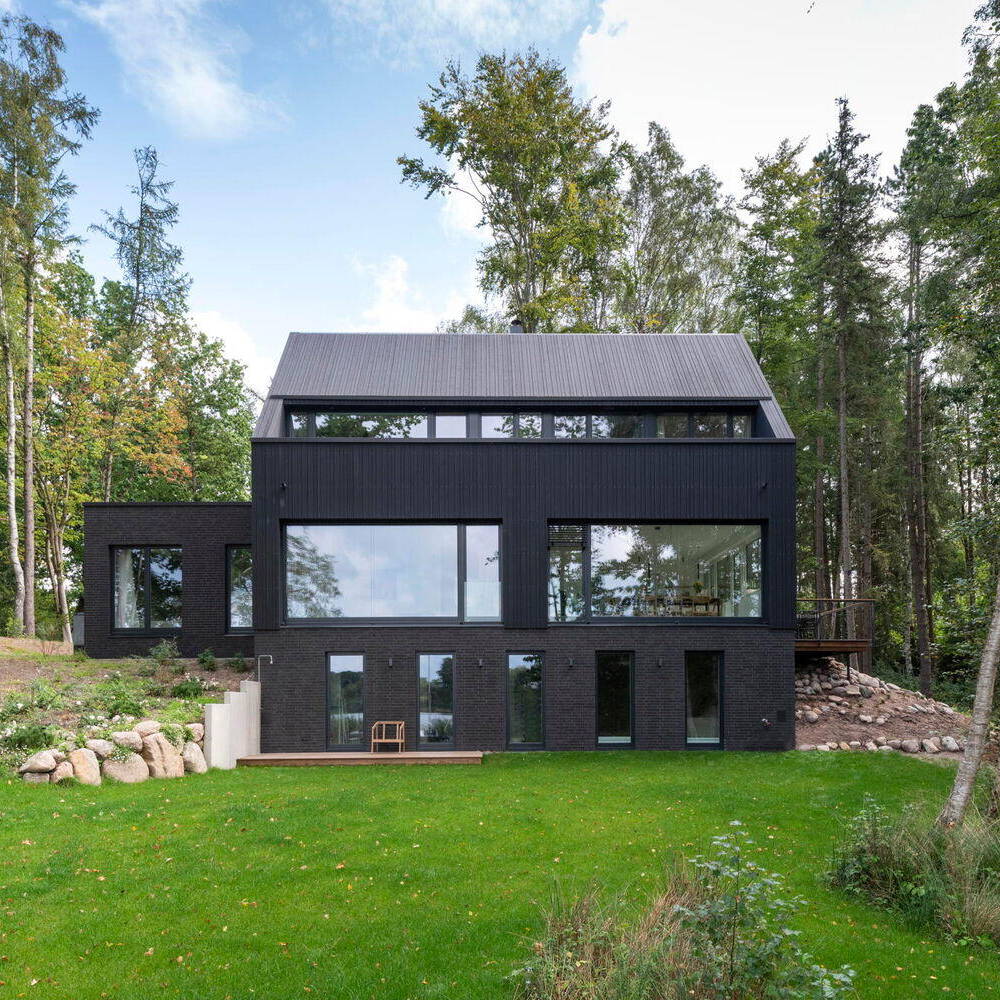 Das Design des Hauses folgt der Grundidee, dass Architektur nicht gegen die Natur arbeitet, sondern mit ihr kooperiert. Die Fassade und das Dach bestehen aus schwarz behandeltem Kiefernholz, das sich perfekt in die dichte Vegetation und die Atmosphäre des Waldes einfügt. Die markante schwarze Holzoptik betont die natürliche Schönheit der Umgebung und verleiht dem Haus zugleich eine schlichte Eleganz. Durch eine bewusst reduzierte Gestaltung – ohne Dachüberstand und mit Regenrinnen und Fallrohren, die in die Wand integriert sind – wirkt das Haus wie ein in die Landschaft eingebettetes Kunstwerk. Die klare, funktionale Architektur berücksichtigt gezielt unterschiedliche Bedürfnisse an Sichtschutz und Ausblick. Die geschlossene Fassade auf der Ostseite erinnert an die Silhouette einer traditionellen Scheune: robust, schlicht und zurückhaltend. Auf der Westseite öffnet sich das Haus jedoch großzügig. Die breite Fensterfront des Wohnraums im Erdgeschoss bietet einen unverstellten, atemberaubenden Blick auf den See und schafft so eine beeindruckende Verbindung zwischen Innenraum und umgebender Natur. Besonders hervorzuheben ist die Terrasse auf der Südseite. Diese teilweise freitragende Außenfläche bietet nicht nur einen direkten Zugang zur Küche, sondern auch einen unverbauten Blick auf den See – ein perfekter Ort, um den Sonnenuntergang zu genießen.
