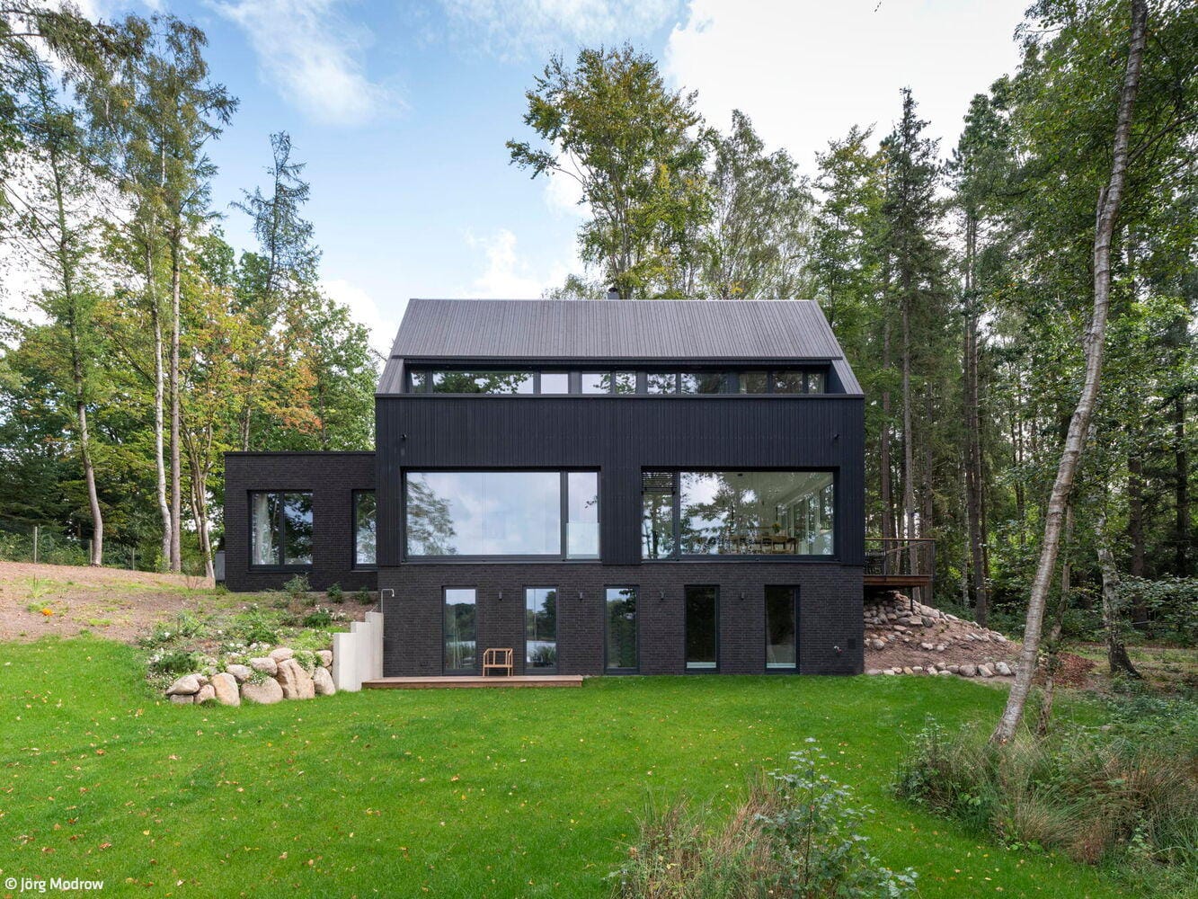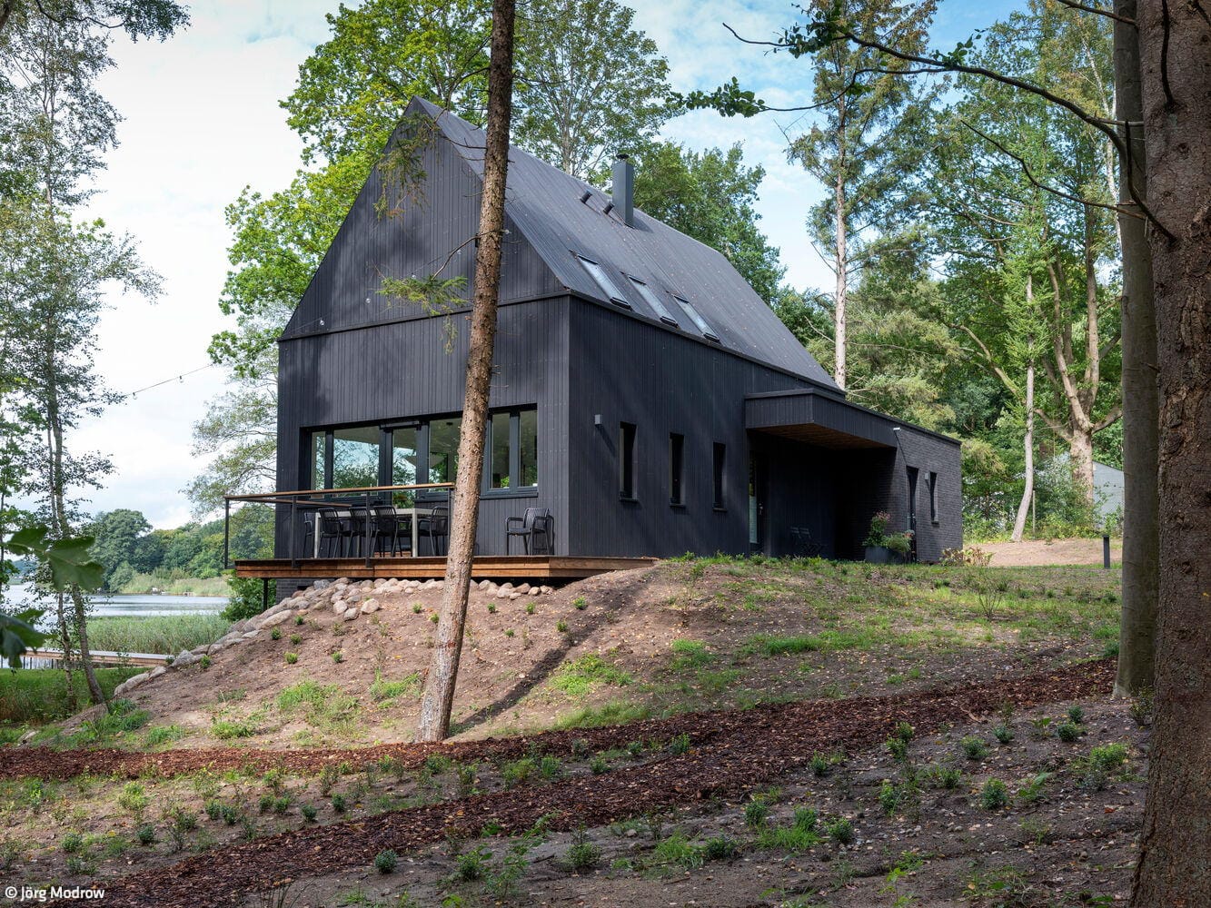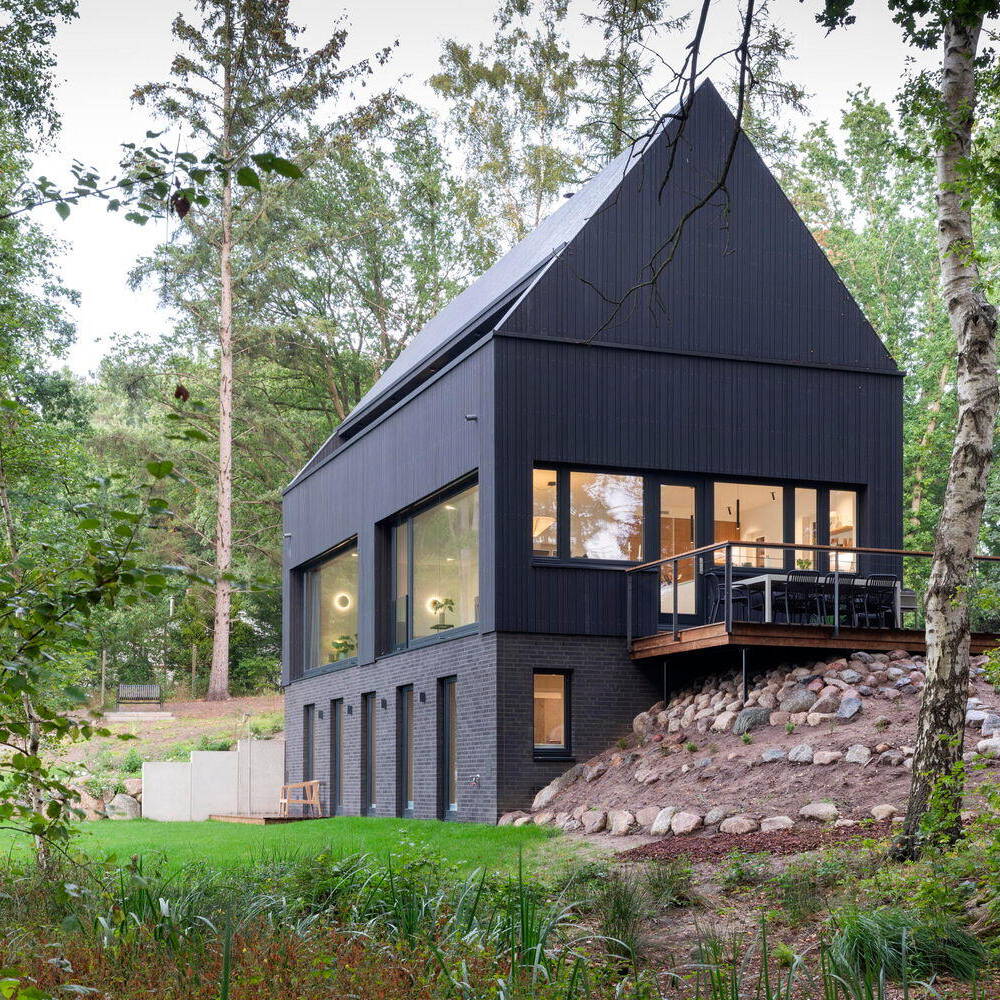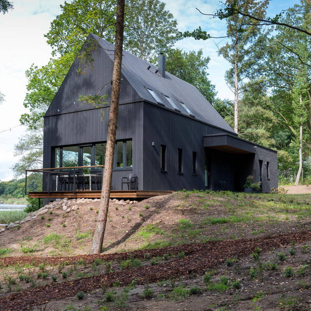 Dieses Wochenendhaus verkörpert die perfekte Symbiose von Natur und Architektur. An einem Hang direkt am Ufer des malerischen Wardersees, eingebettet in eine idyllische Waldlandschaft, wurde unter der Leitung des Architekten Matthias Mecklenburg ein Holzhaus realisiert, das so wirkt, als als habe es schon immer dorthin gehört. Die Architektur wurde mit dem Ziel entwickelt, das Gebäude harmonisch in die umgebende Natur zu integrieren und eine Atmosphäre zu schaffen, die Ruhe und Verbundenheit zur Umgebung ausstrahlt.
