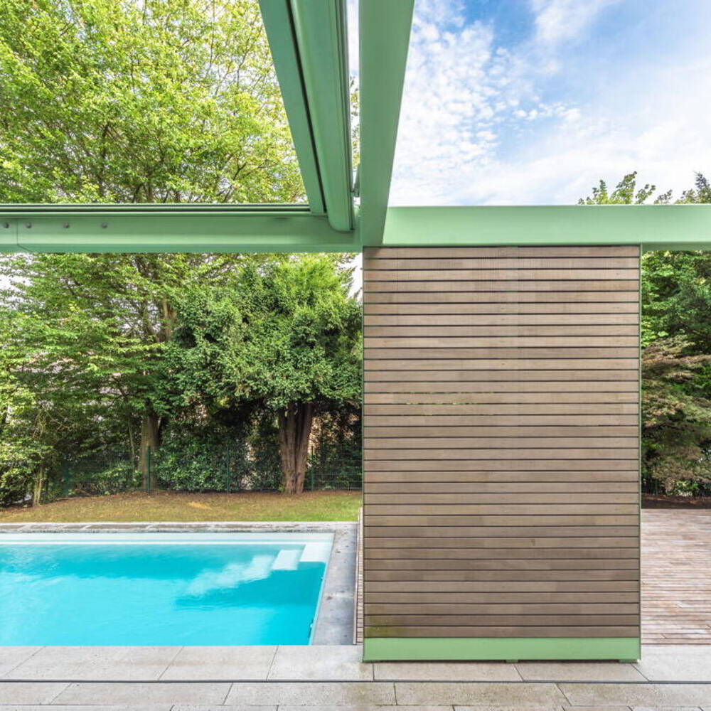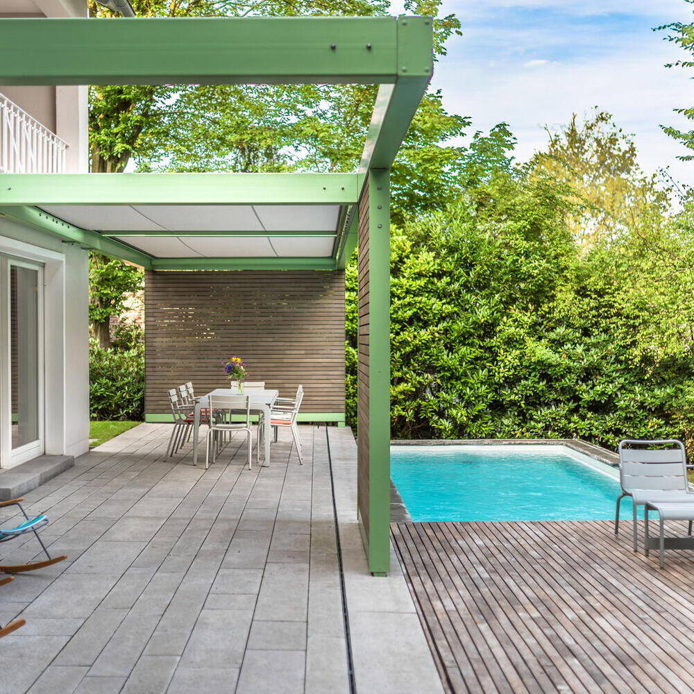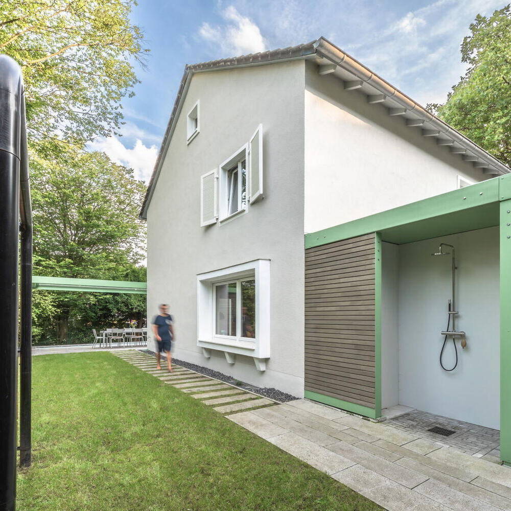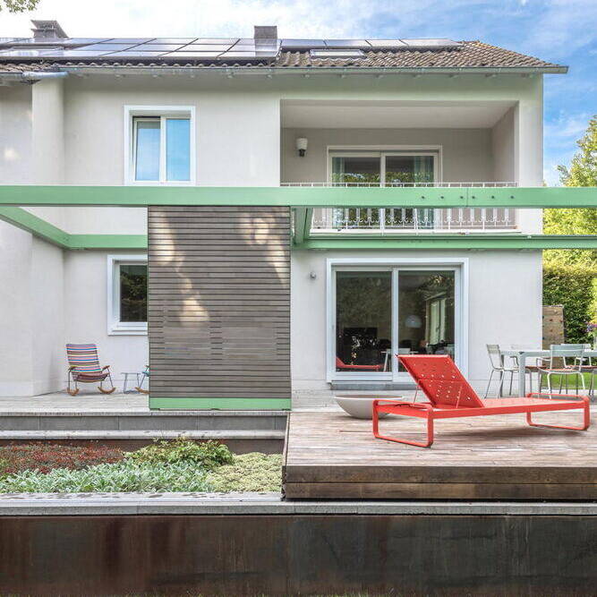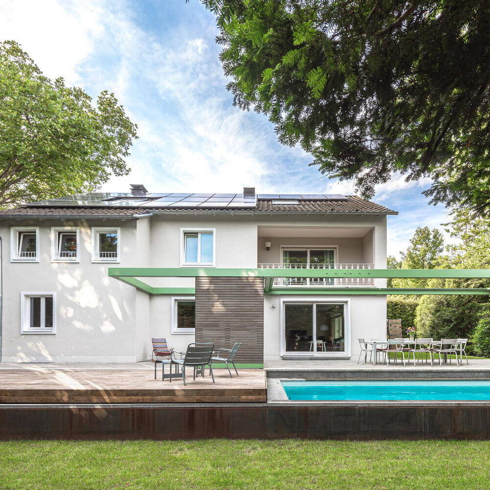 Grundsätzliche Ordnung in den Garten bringen und alles ein wenig „hübscher machen“ war der Wunsch, den Ole Wetterich vom Typ A. Architektenteam in die Praxis umsetzten sollte. Betrachtet man das Ergebnis, so ist ihm dies gelungen. Mehr noch, der Garten passt sich der Architektur des Hauses perfekt an, wirkt, als sei er schon immer da gewesen und bereichert das Domizil um ein Freiluft-Wohnzimmer mit Terrasse, Pool und Pooldeck. Der gewachsene Baumbestand und neu hinzugekommene Stauden und Gräser setzen das rund 843 m² große Grundstück zu jeder Jahreszeit in Szene. Die Grundstruktur des Gebäudes wurde bereits in den 1980er-Jahren angepasst und der ursprüngliche Eingang zum Nebenraum der Treppe umfunktioniert. Das Haus wird seitdem durch den seitlich gelegenen ehemaligen Bediensteteneingang betreten. Um dem ursprünglichen Zugang seine Bedeutung zurückzugeben, wurden die bewachsenen Flächen davor freigeschnitten und der Eingang zur Straße hin geöffnet. Ein inszenierter Zugang durch blühende Stauden und im Wind wiegende Gräser stellt nun den Auftakt zu Neuem im alten Gefüge dar. Pergolarahmen bilden und fassen zugleich den Raum und übernehmen je nach Standort verschiedene Funktionen: mal mit geschlossenem Feld als Vordach über der Haustür, mit Querholm als Haltepunkt für Markisen oder mit geschlossenen Seitenteilen als Technikraum für den Pool. Durch geschicktes Integrieren der Tragstruktur scheinen die Rahmen in ihrem strahlenden Grün über den Dingen zu schweben. Nicht weniger raumprägend bilden das großzügige Staudenbeet sowie der der Terrasse vorgelagerte Pool das Herzstück des Gartens und erweitern das anliegende Wohnzimmer neben der Terrasse um ein weiteres Element. Das verschiebbare und begehbare Pooldeck bietet eine zusätzliche Liegefläche am Beckenrand und Schutz vor ungewolltem Bad. Mit seinem neuen sandig-grauen Anstrich mit weiß abgesetzten Faschenrahmen, dem warmen Grau der Bodenplatten sowie dem kräftigen Grün der Pergolen ergibt sich ein elegantes Gesamtbild.