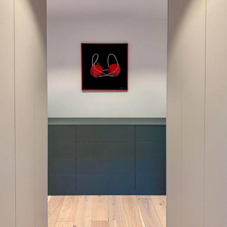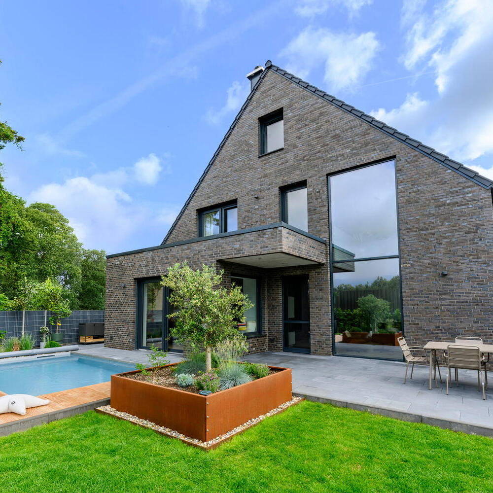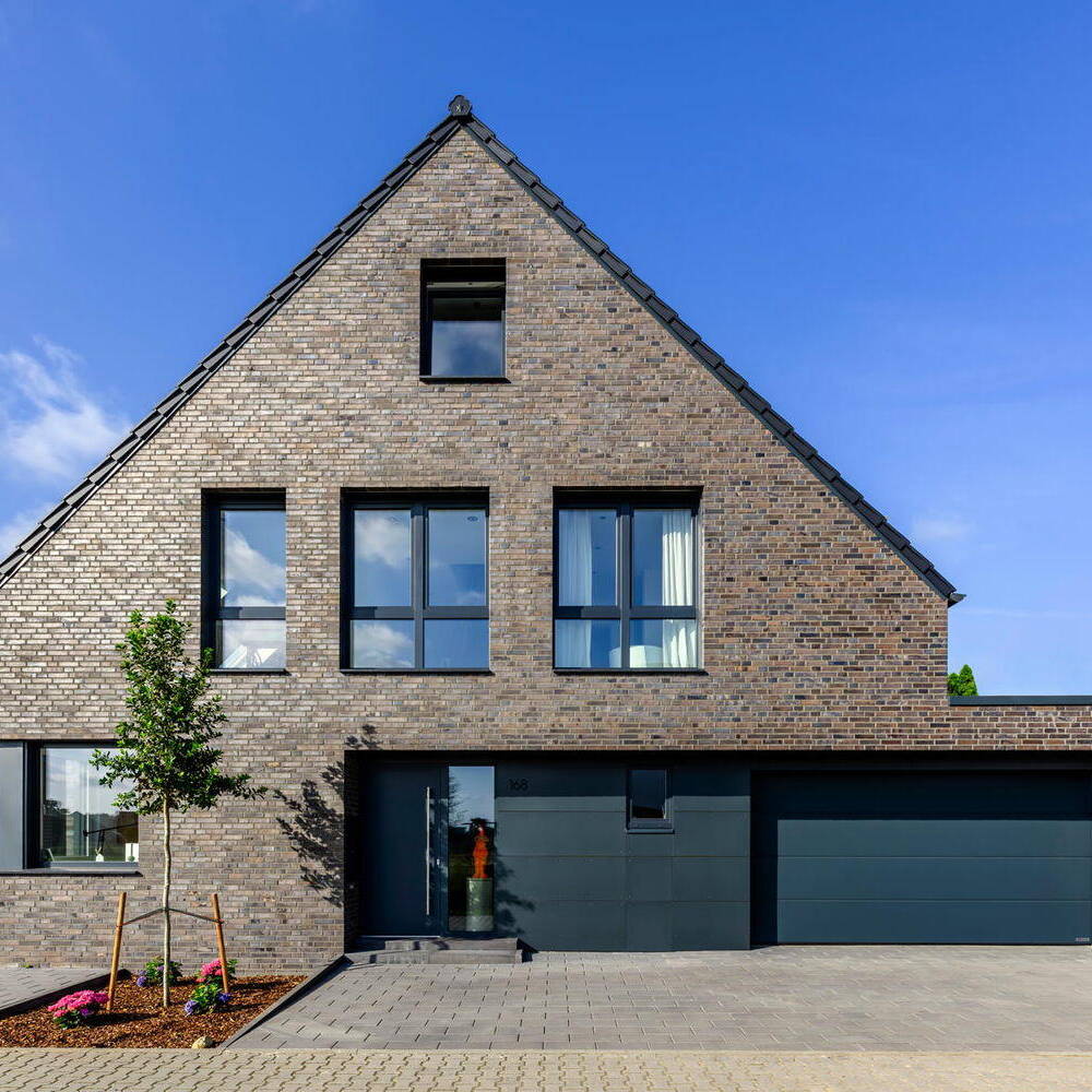 Das Wohnviertel im ländlich geprägten Ortsteil Rheindahlen ist durch eine dichte Bebauung geprägt. Entsprechend vorgezeichnet waren das Baufenster und die baurechtlichen Vorgaben nach BGB §34. Um in der relativ kleinteiligen Bebauung dennoch genügend Privatsphäre zu erhalten, trennt das Haus mit einer integrierten Doppelgarage den Garten vom Erschließungsbereich zur Straße klar. Dabei hat der Neubau eine robuste, hochwertige Fassade erhalten: Der verwendete Klinker von Gillrath zeichnet sich durch eine lebendige Wirkung aus, die durch den individuellen Brennvorgang eines jeden einzelnen Steins erzeugt wird. Mit dieser haptischen Fassade erscheint das Gebäude selbstbewusst neben den Nachbarhäusern mit vergleichbarer Kubatur.