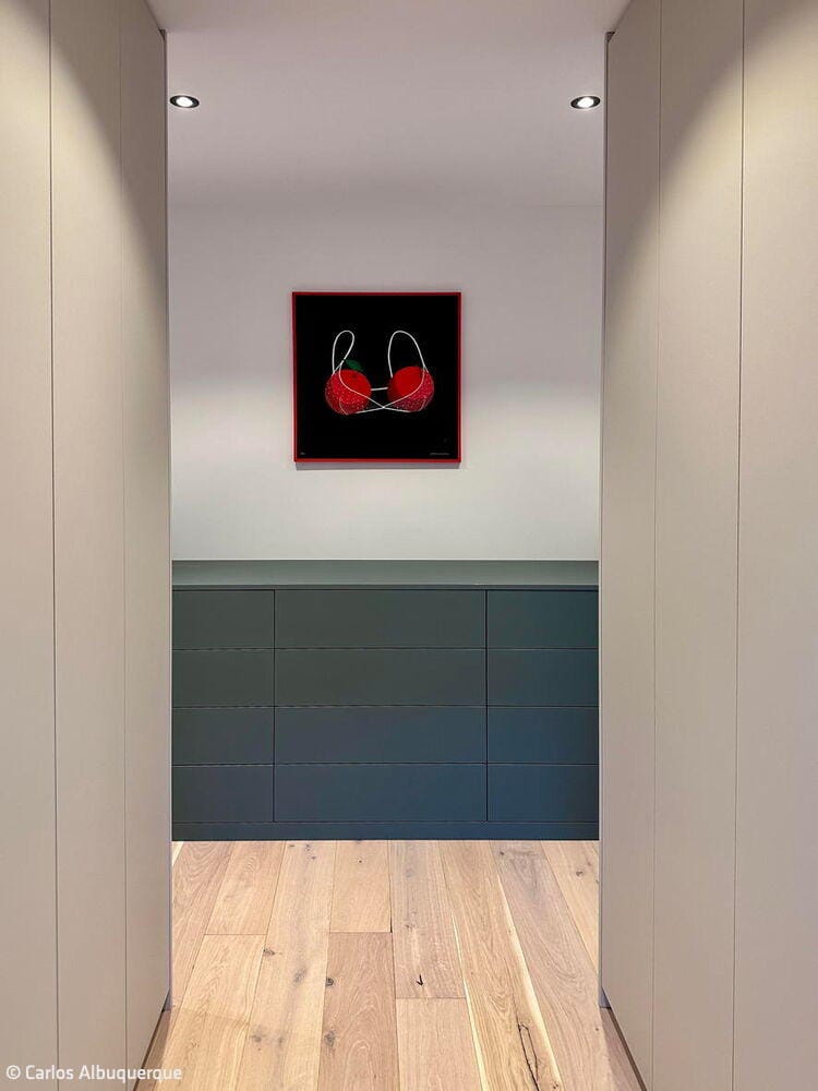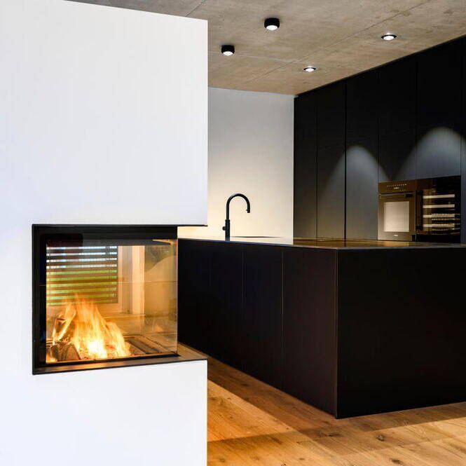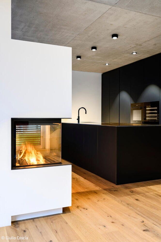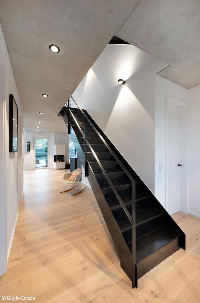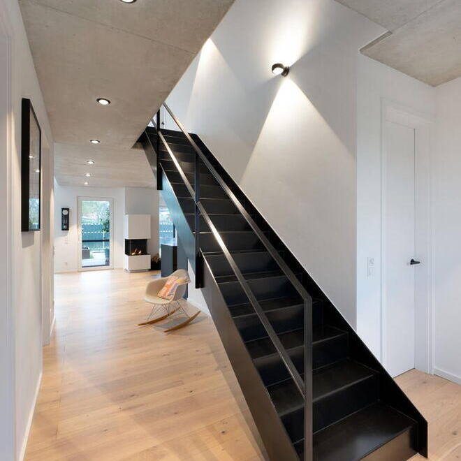 Im Inneren beeindruckt die durchgängige Sichtbetondecke im Erdgeschoss durch ihre Helligkeit und Einheitlichkeit. Die Ortbetondecke, frei von Weißpigmenten oder anderen Zusatzstoffen, war eine anspruchsvolle baulogistische Herausforderung: Um Farbunterschiede durch unterschiedliche Mischungen zu vermeiden, mussten alle Betonlieferungen exakt aufeinander abgestimmt werden. Außerdem kamen dabei großformatige Schaltafeln zum Einsatz, mit der eine fugenreduzierte Betonästhetik aus einem Guss entstehen konnte – mit klaren Linien und ruhiger Oberfläche. Zusätzlich erforderte das Lichtkonzept eine millimetergenaue Planung der Elektroauslässe beim Betonieren, sollten alle Leitungen und Einbauorte doch unsichtbar in die Sichtbetondecke integriert werden. Die großzügigen Innenräume des Hauses sind flexibel organisiert, um sowohl offene als auch zonierte Nutzungen zu ermöglichen – mit fließenden Übergängen zwischen Innen und Außen, kommuniativen etagenübergreifenden Bereichen, aber auch Rückzugsorten. Die Materialwahl ist bewusst reduziert und geprägt von natürlichen, rohen Materialien, die in ihrer rohen Sichtigkeit eine ehrliche Ästhetik vermitteln: Sichtbeton für die Decke, Rohstahl für die freistehende Treppe sowie viel Holz prägen das Raumgefühl. Sämtliche Einbauten, vom Waschtischunterschrank bis hin zur minimalistischen Kücheninsel, wurden in enger Zusammenarbeit mit der Schreinerei Zimmermanns geplant und ausgeführt. Die Innenausbauten sind so nicht nur funktional durchdacht, sondern auch wesentlicher Bestandteil des architektonischen Gesamtkonzepts, das den Charakter des Hauses prägt.