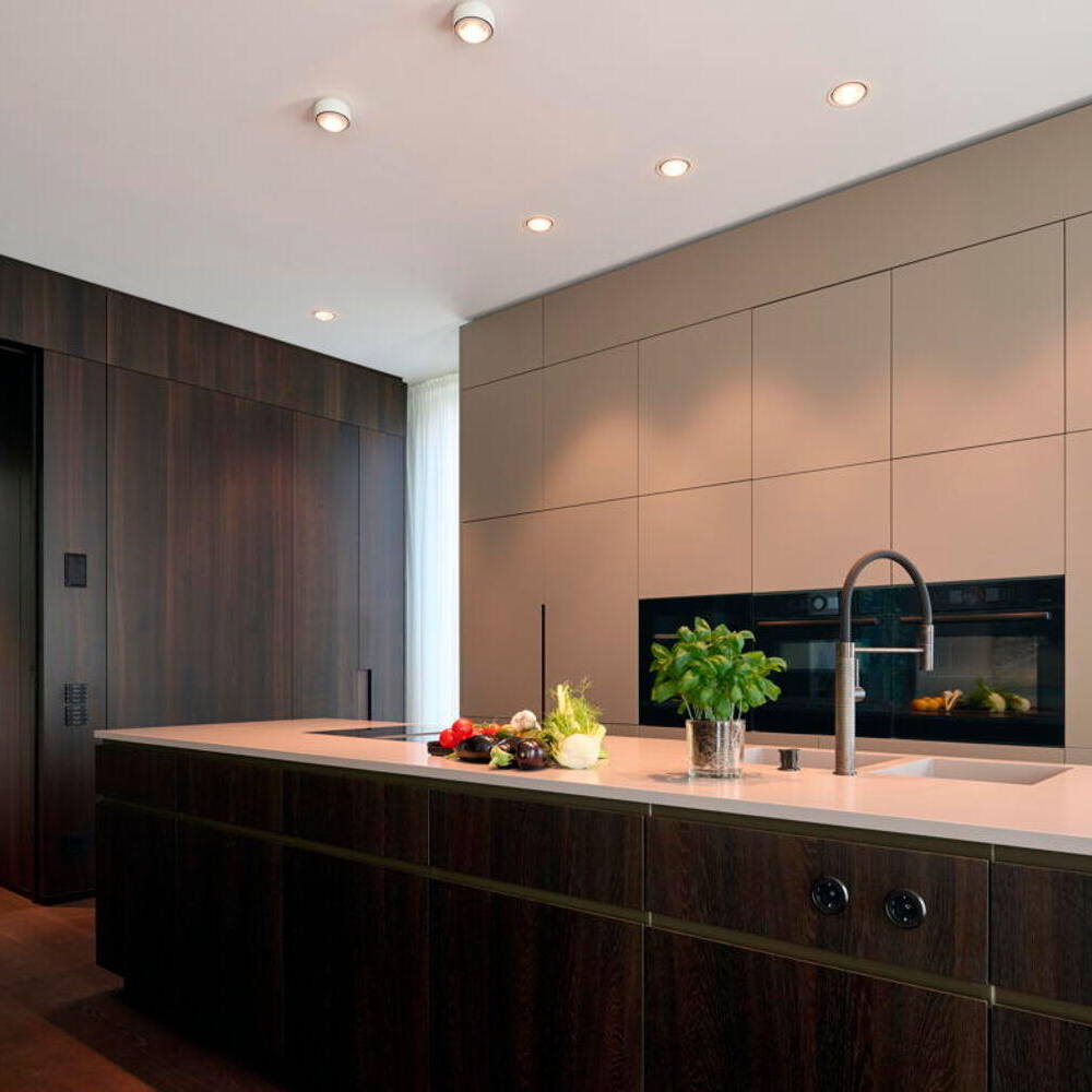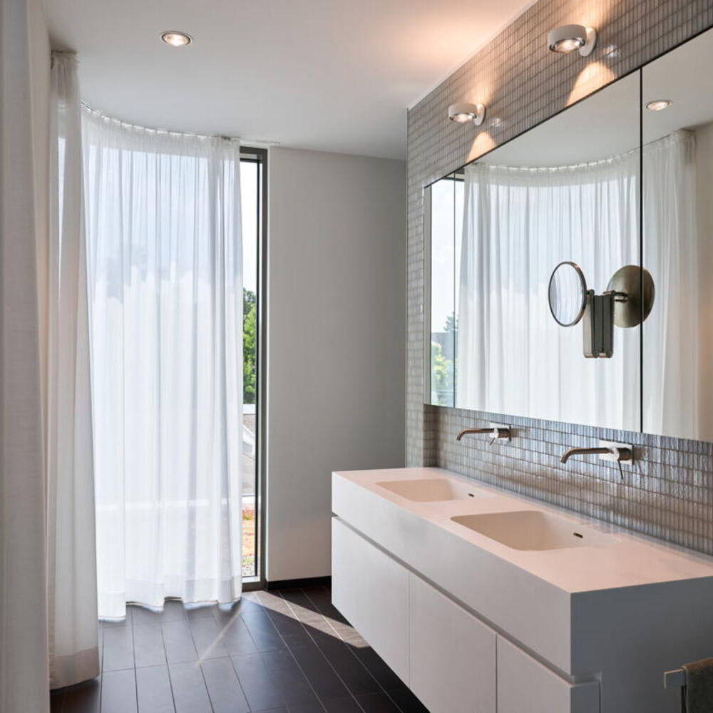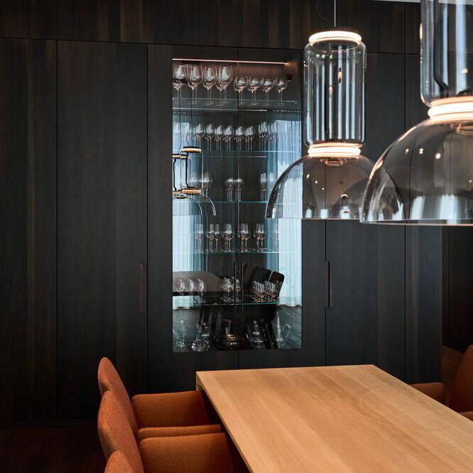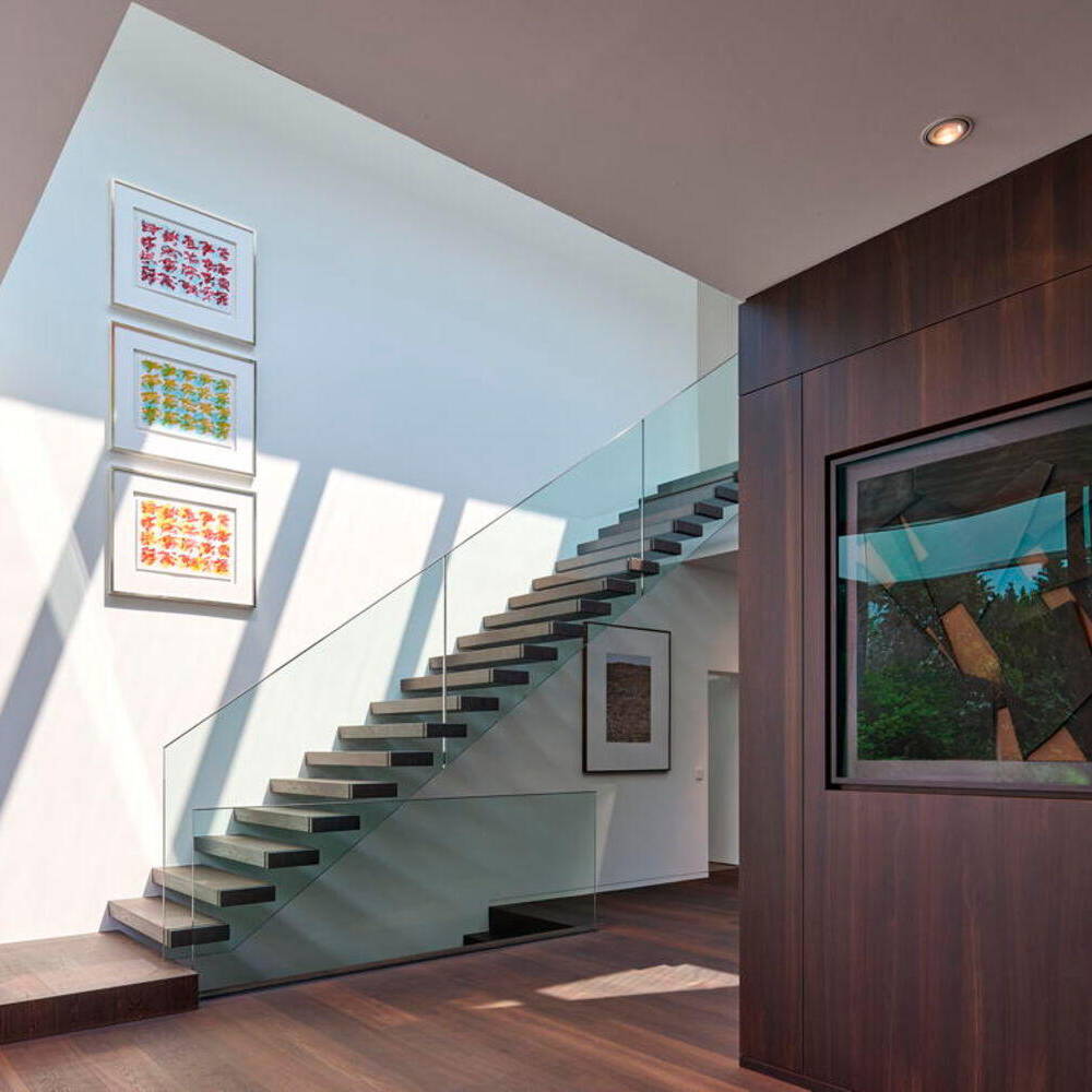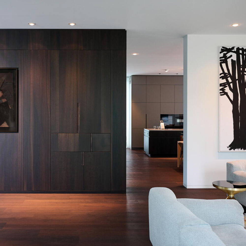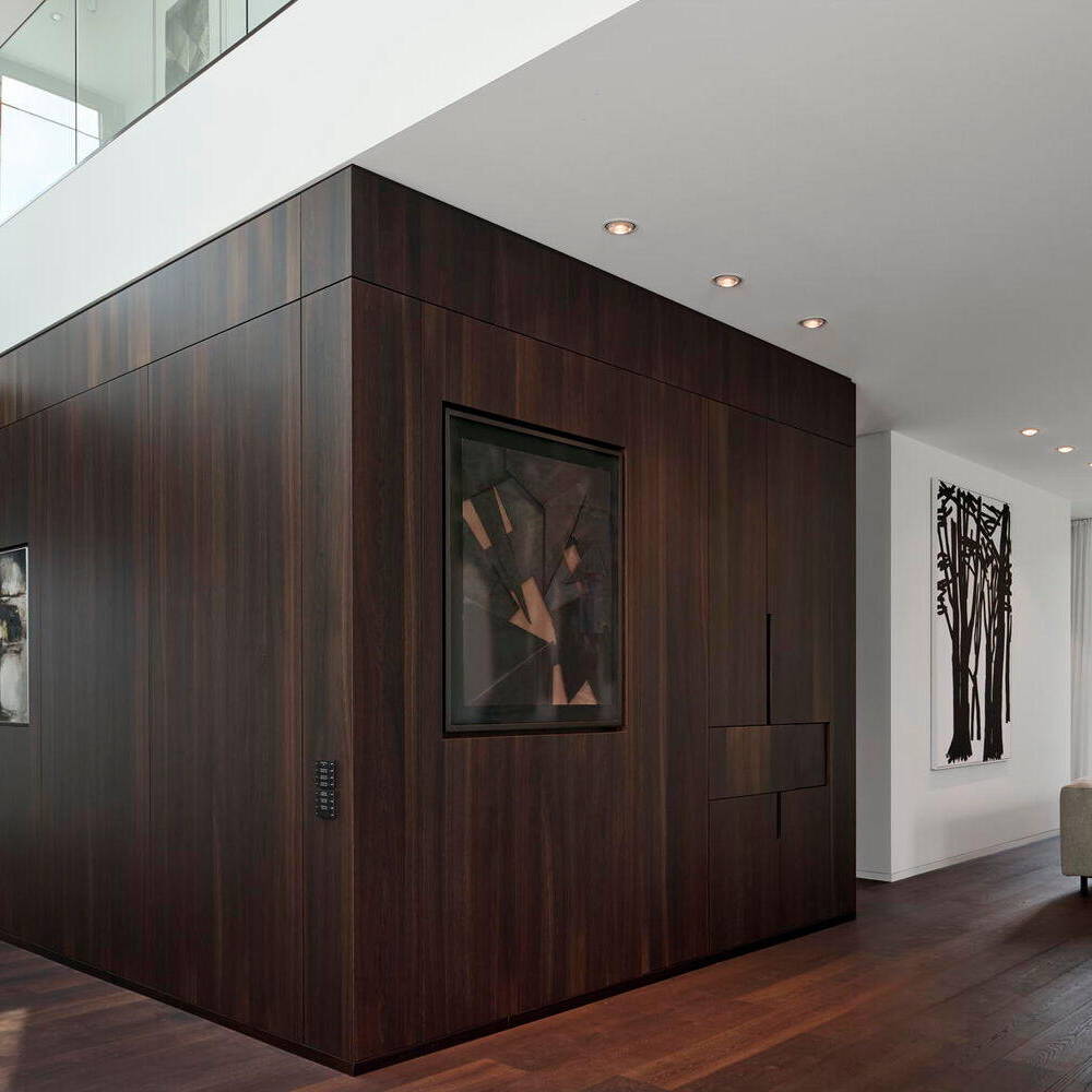 Der Neubau präsentiert sich von der Straßenseite her zurückhaltend. Beim Betreten offenbart sich jedoch eine beeindruckende zweigeschossige Eingangshalle, die die Etagen miteinander verbindet. Ins Auge fällt dabei ein markanter Kubus, in den neben einer Bar und diversen Geschirrschränken auch die Garderobe und ein Gäste-WC integriert sind. Diese durchdachte Einbaulösung ermöglicht eine großzügige und klare Gliederung der unterschiedlichen Wohnbereiche. Durch seine allseitige hölzern-dunkle Materialität in einer hochwertigen Makassar-Ebenholz-Optik verleiht der Kubus dem Erdgeschoss zudem ein prägnantes Erscheinungsbild, das zugleich Eleganz ausstrahlt. Kühn ergänzt ein gradliniger Treppenlauf aus wandhängenden Stufen, der in das Obergeschoss zu den privaten Bereichen des Hauses führt die Eingangshalle. Die einladende Wohnatmosphäre wird zusätzlich durch das einfallende Licht verstärkt: Die großen Fensterflächen sorgen dafür, dass die Räume im Rhythmus des Tageslichts erlebt werden. Das Licht wird fließend durch die offenen Grundrisse gefiltert und akzentuiert, so dass sich die Räumlichkeiten über den Tagesverlauf dynamisch verändern. Auf diese Weise entstehen abgestimmte Lichtszenarien, mit denen die Oberflächen und Texturen der Materialien in vielfältiger Weise herausgearbeitet werden. Eine besondere sinnliche Präsenz ist das Ergebnis. Die ruhige Materialität und die individuell ausgeführten Details lassen Innenarchitektur und Architektur zum Ausdruck einer subtilen Ästhetik werden.