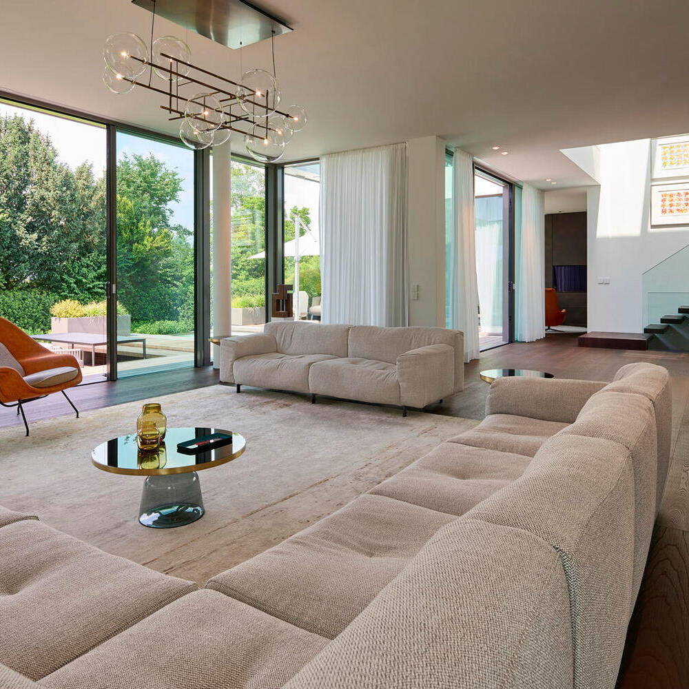 Lichtdurchflutet und offen – im doppelten Sinne – präsentiert sich das Wohninterior, das vomDüsseldorfer Innenarchitekturbüro raumkontor gestaltet wurde. Sowohl architektonisch als auch emotional entstand ein einladender Ort für Freunde und Gäste. Ein großzügiger Ort zum Leben, der zugleich persönlicher Rückzugsort ist: Jedes der über die Jahre vom Bauherren zusammengetragenen Kunstwerke erzählt eine eigene Anekdote, verbindet sich mit einer persönlichen Geschichte und trägt zur lebendigen Atmosphäre der Räume bei, die zurückhaltend, aber äußerst differenziert gestaltet wurden.