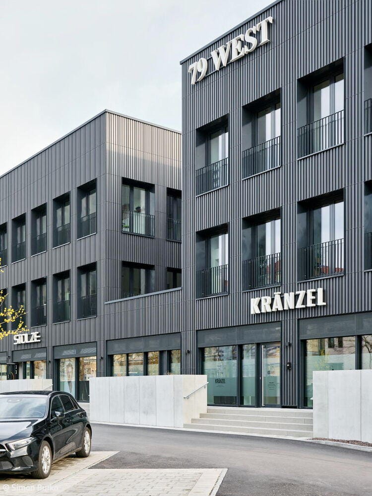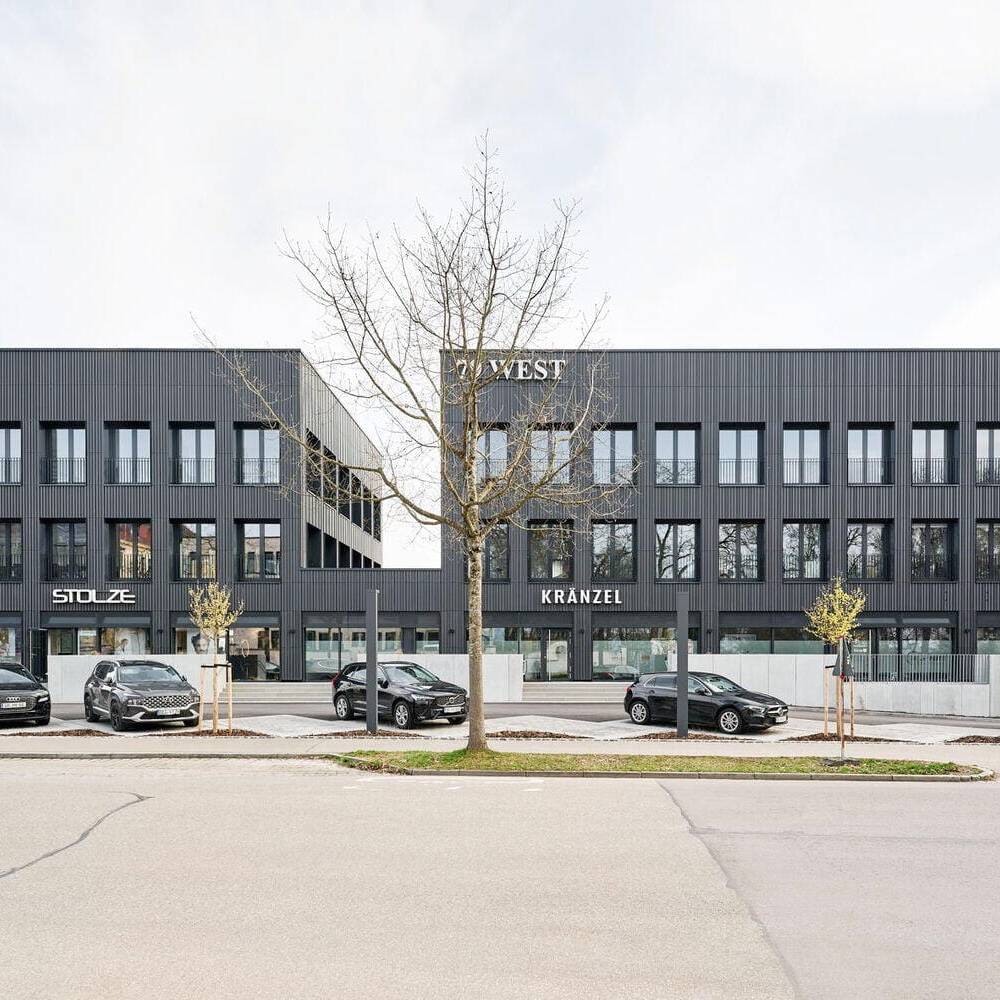 Wo bis vor wenigen Jahren ein Autohaus mit Werkstatt stand, befindet sich heute ein Gewerbegebäude mit flexiblen Nutzungsmöglichkeiten. Den Namen „79 West“ verdankt es seiner Lage an einer Ausfallstraße im Westen von Straubing. Das ortsansässige Büro Pielmeier Architekten erhielt den Auftrag für die Planung und Umsetzung der neuen Immobilie. Planungsbeginn war 2022 und schon im Frühjahr 2025 konnten die Gebäude in Betrieb genommen werden. Heute beherbergt es neun Mietparteien unterschiedlicher Branchen.