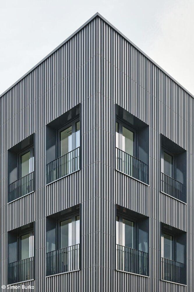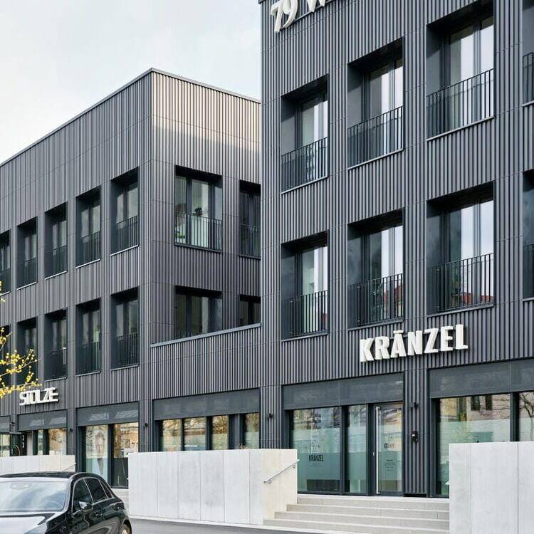 Gewählt wurde hierfür eine anthrazitfarbene vorgehängte und hinterlüftete Keramikfassade, deren Elemente eine gerillte Oberflächenstruktur aufweisen, um Licht- und Schatteneffekte zu erzielen. Die Art der Befensterung ist ebenfalls ein zusätzliches gestalterisches Element: Die Fenster sind in den zwei Obergeschossen des Bestands innenbündig und im Erdgeschoss außenbündig eingesetzt, da sich hier Gewerbe mit Publikumsverkehr niedergelassen hat und hierfür auch die „Schaufenster“ des Autohauses erhalten blieben.