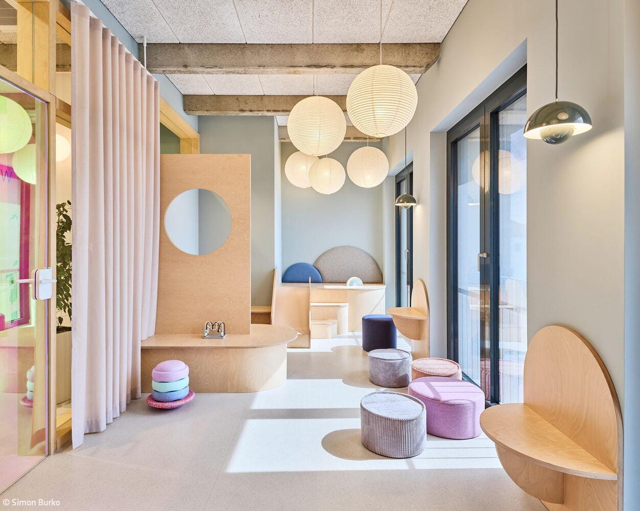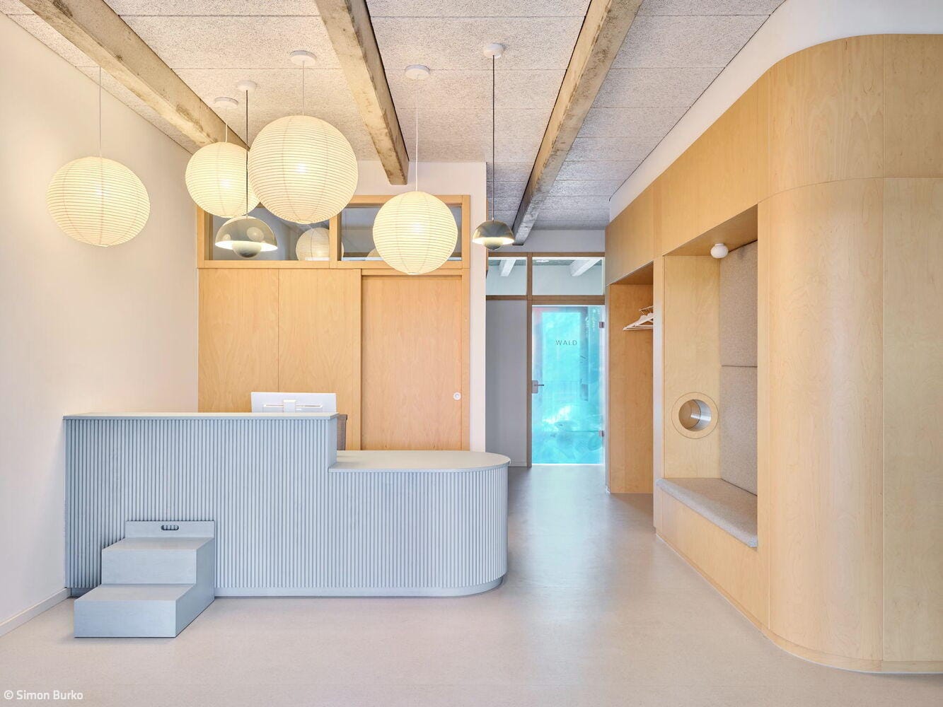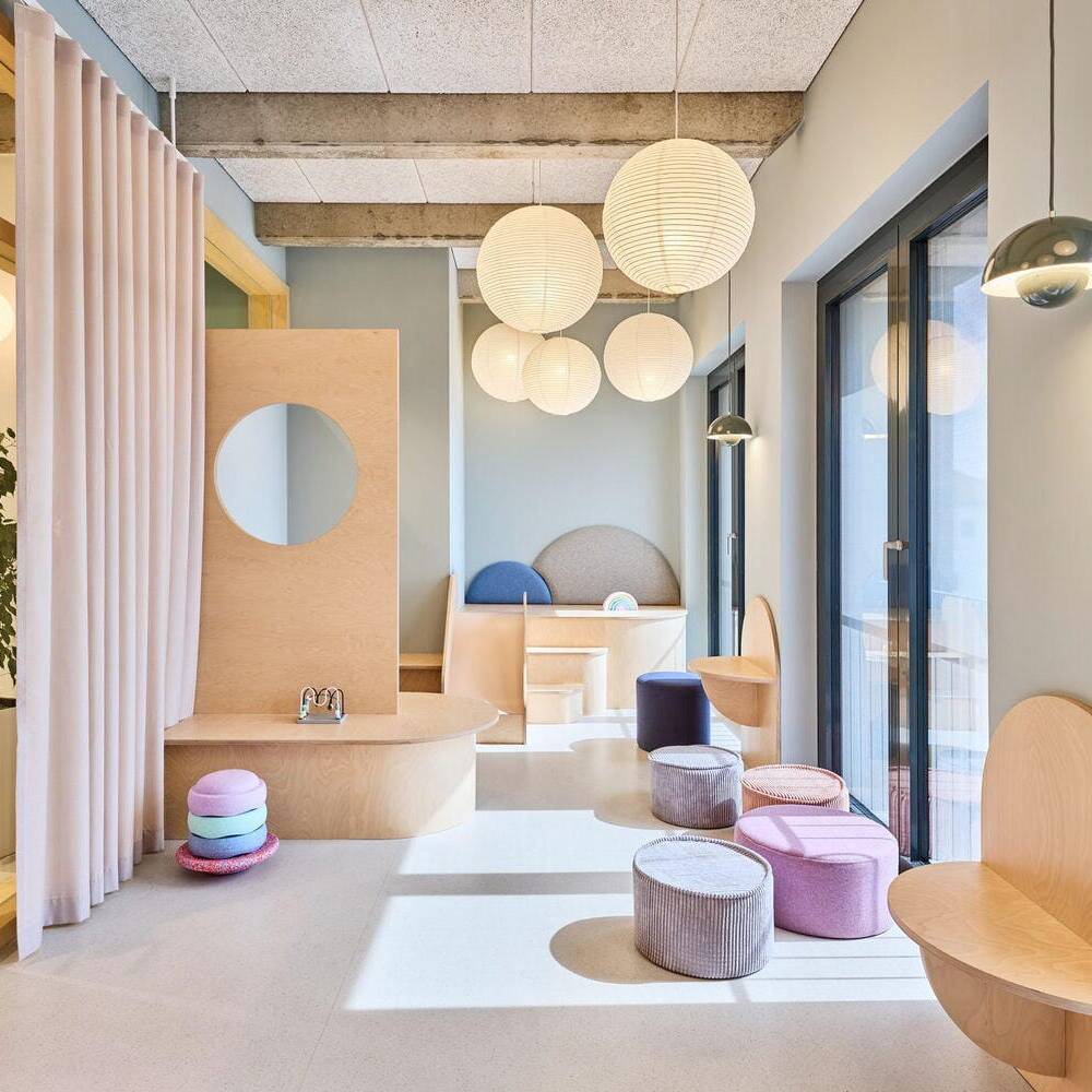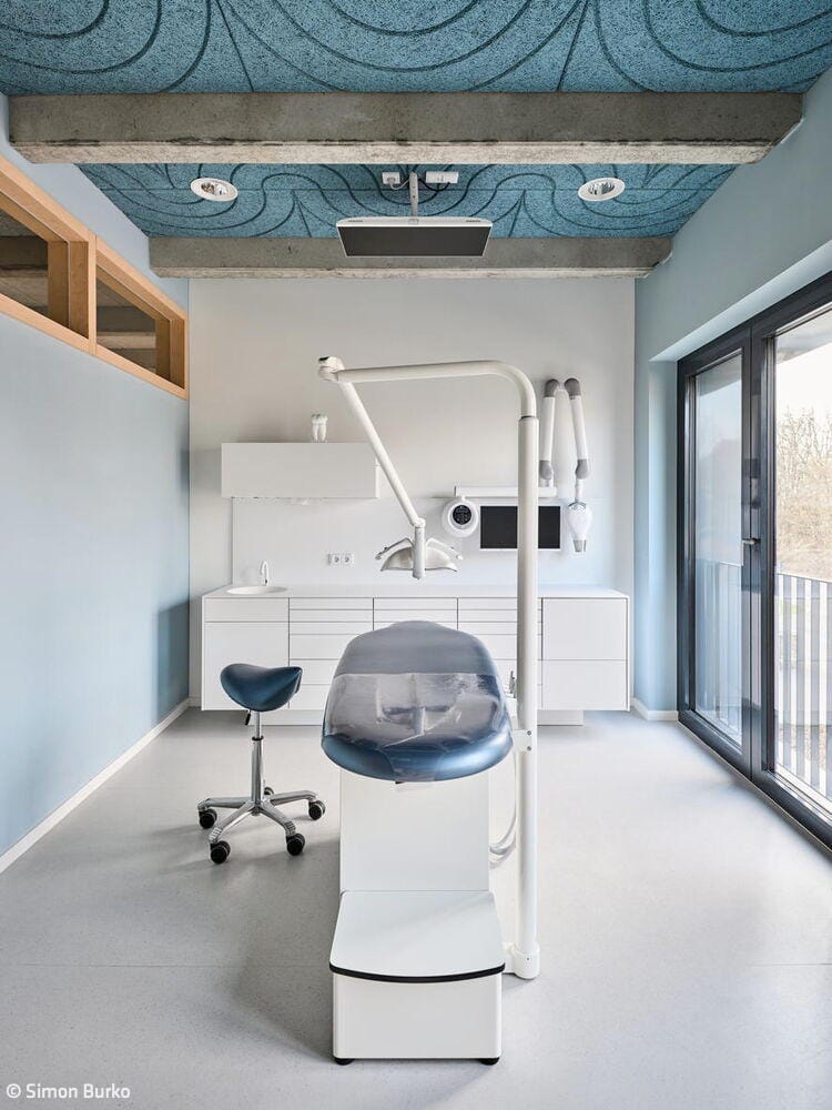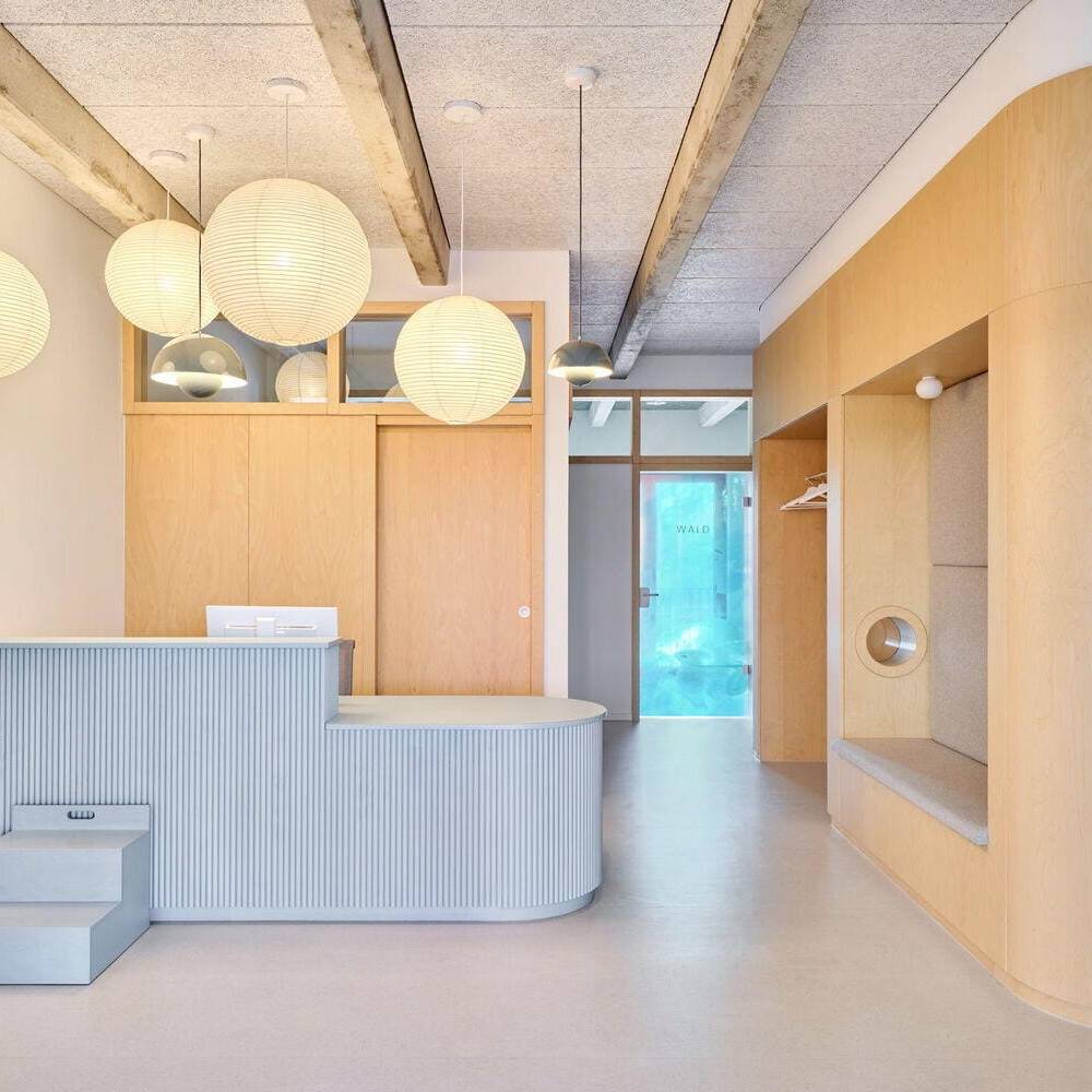 Für die Mieteinheit einer Kinderzahnarztpraxis wurde die Innenarchitektin Sarah Knauer, büro aestäs, hinzugezogen. Sie entwarf eine auf die kleinen Patient:innen bezogene Raumgestaltung, wie beispielsweise Wald-, Wasser- und Wolkenmotive in den zugehörigen Farbwelten Grün, Blau und Grau sowie eine irisierende Folierung der Türen. Dies alles in einer gewissen unperfekten Rauheit, um sich dem industriellen Look der Betonrippen anzupassen.
