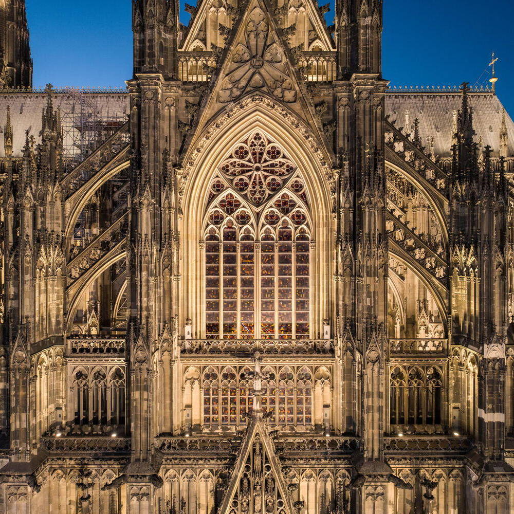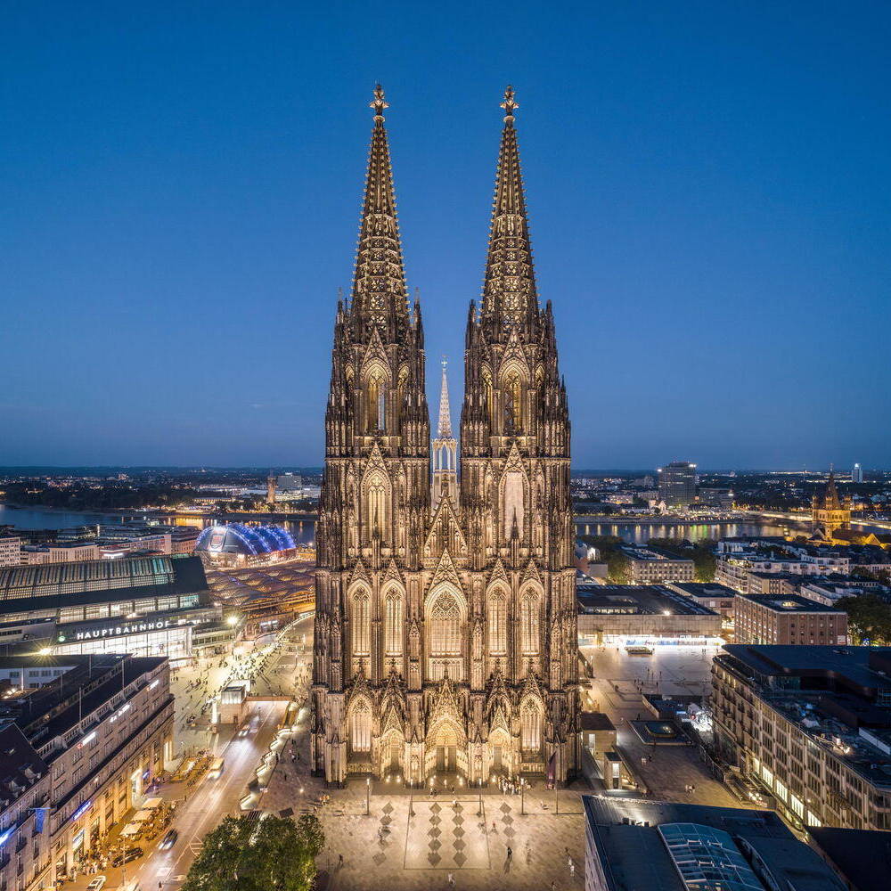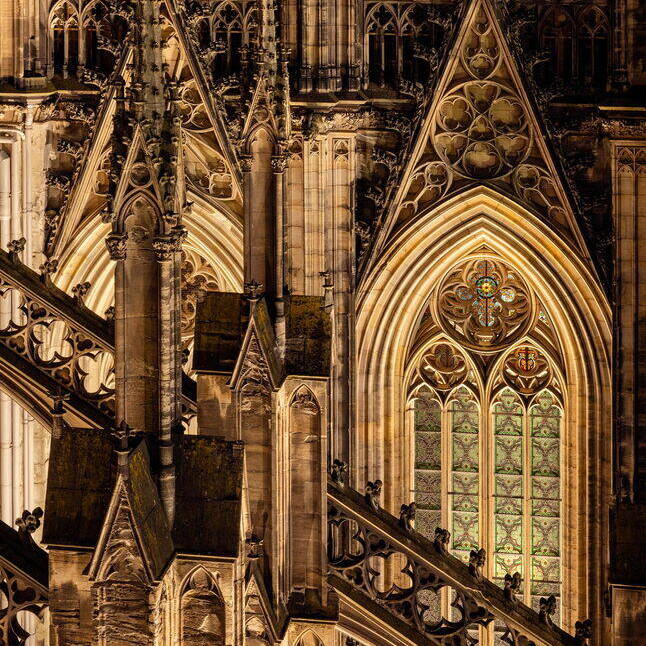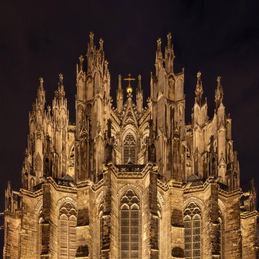 Eine neue Außenbeleuchtung am Kölner Dom setzt das Bauwerk eindrucksvoll in Szene und reduziert die Lichtverschmutzung sowie den Energieverbrauch signifikant. Das für das Konzept verantwortlich zeichnende Lichtplanungsbüro Licht Kunst Licht (LKL) arbeitete nach dem Konzept, das Medium Licht als integralen Bestandteil der Architektur zu betrachten. Ziel war eine sichtbare, aber zurückhaltende Präsenz, die die architektonische Vielfalt auch aus der Ferne wahrnehmbar macht. Das Fehlen architektonischer Unterlagen erforderte eine langwierige analytische Untersuchung der Fassade und der gotischen Elemente. In enger Abstimmung mit der Dombauhütte, RheinEnergie und dem Außenleuchtenhersteller WE-EF entstand ein System von über 700 Leuchten, dezent platziert und so konzipiert, dass sie als Objekte nicht sichtbar sind. Spotlighting betont Fialen, Strebepfeiler und Türme, besonders die markanten 157 Meter hohen Türme. Filigranes Innenlicht lässt das Maßwerk durchscheinen und verankert den Dom als nächtliches Wahrzeichen im Stadtbild. Lichtstelen auf der Domplatte erhellen Verkehrszonen, ohne zu blenden. Die Anlage ist durchgängig dimmbar, die Farbtemperatur bis 2.700 K kompatibel mit dem Sandstein, und entspricht modernen ökologischen Vorgaben. Die neuinstallierten Leuchten von WE-EF sind vollständig reversibel und nicht-invasiv montiert: Klemmsysteme statt Bohrungen, druckverteilende Halterungen schützen die Substanz. Zwei zentrale Schaltzentralen – am Boden und im Vierungsturm – sowie eine Fernsteuerung ermöglichen individuelle Lichtstimmungen. Der Energieverbrauch sank durch den Verzicht auf gebäudeferne Leuchten von 80 auf 10 Prozent, während die Lichtqualität deutlich zunahm.