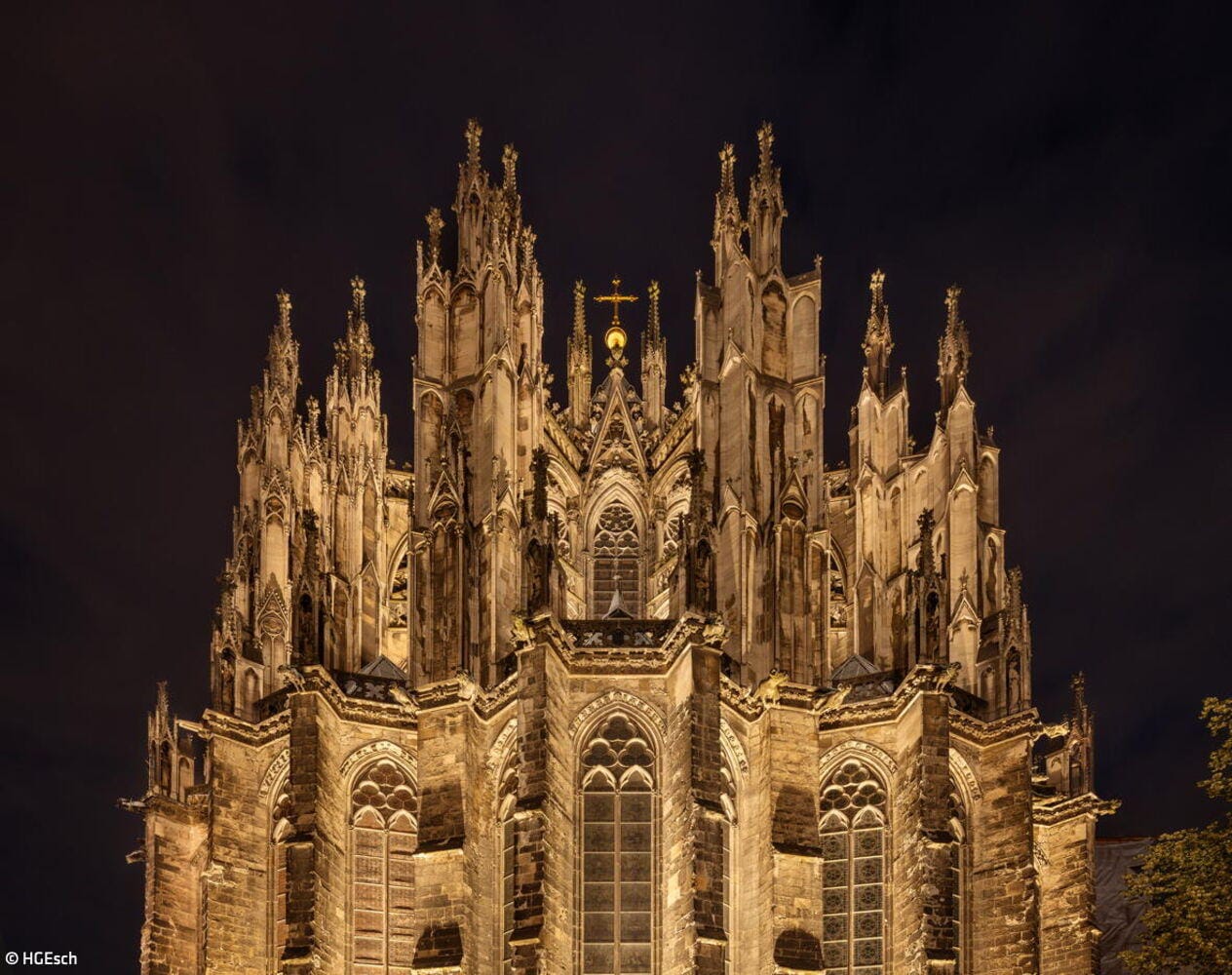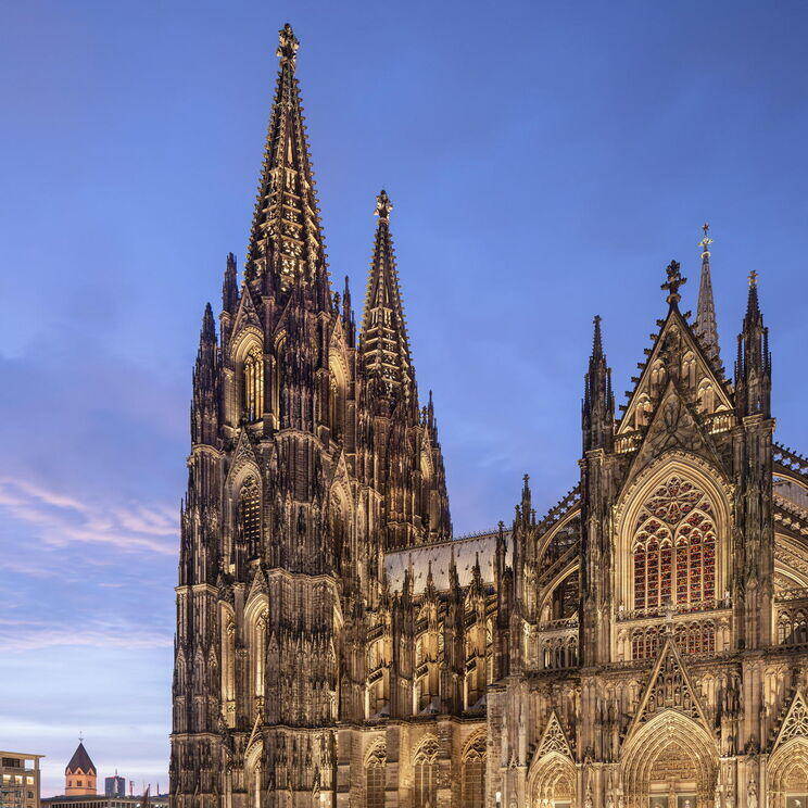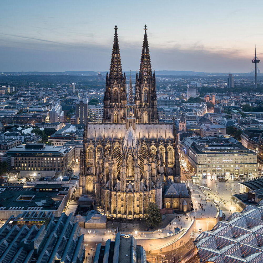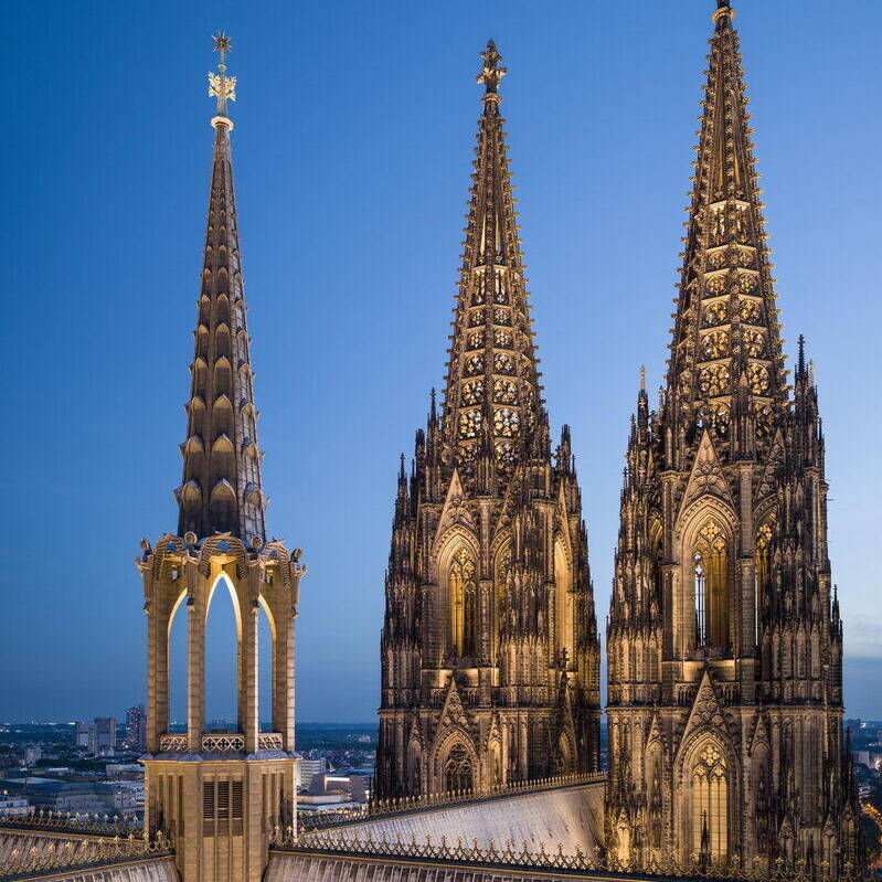 Eine neue Außenbeleuchtung am Kölner Dom setzt das Bauwerk eindrucksvoll in Szene und reduziert die Lichtverschmutzung sowie den Energieverbrauch signifikant. Das für das Konzept verantwortlich zeichnende Lichtplanungsbüro Licht Kunst Licht (LKL) arbeitete nach dem Konzept, das Medium Licht als integralen Bestandteil der Architektur zu betrachten. Ziel war eine sichtbare, aber zurückhaltende Präsenz, die die architektonische Vielfalt auch aus der Ferne wahrnehmbar macht. Das Fehlen architektonischer Unterlagen erforderte eine langwierige analytische Untersuchung der Fassade und der gotischen Elemente. In enger Abstimmung mit der Dombauhütte, RheinEnergie und dem Außenleuchtenhersteller WE-EF entstand ein System von über 700 Leuchten, dezent platziert und so konzipiert, dass sie als Objekte nicht sichtbar sind. Spotlighting betont Fialen, Strebepfeiler und Türme, besonders die markanten 157 Meter hohen Türme. Filigranes Innenlicht lässt das Maßwerk durchscheinen und verankert den Dom als nächtliches Wahrzeichen im Stadtbild. Lichtstelen auf der Domplatte erhellen Verkehrszonen, ohne zu blenden. Die Anlage ist durchgängig dimmbar, die Farbtemperatur bis 2.700 K kompatibel mit dem Sandstein, und entspricht modernen ökologischen Vorgaben. Die neuinstallierten Leuchten von WE-EF sind vollständig reversibel und nicht-invasiv montiert: Klemmsysteme statt Bohrungen, druckverteilende Halterungen schützen die Substanz. Zwei zentrale Schaltzentralen – am Boden und im Vierungsturm – sowie eine Fernsteuerung ermöglichen individuelle Lichtstimmungen. Der Energieverbrauch sank durch den Verzicht auf gebäudeferne Leuchten von 80 auf 10 Prozent, während die Lichtqualität deutlich zunahm.