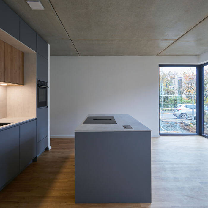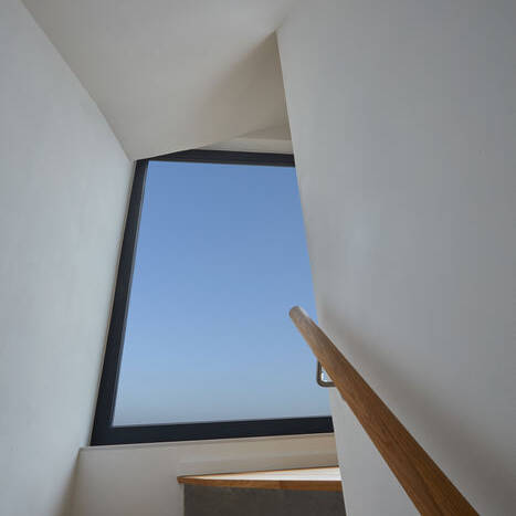 Das Erdgeschoss ist geprägt von der Idee eines offenen Raumes für Wohnen, Essen und Kochen als Mittelpunkt des Familienlebens. Nahezu alle Räume im Haus sind bodentief verglast und sehr hell. Die einläufige, leicht gewendelte Treppe erschließt das Obergeschoss, das die Kinderzimmer samt Duschbad beherbergt und führt weiter bis ins Dachgeschoss. Hier oben haben die Eltern mit Masterbedroom und Ensuite-Bad ihr abgeschlossenes Reich. Der Raum mit freigelegtem Dachstuhl ist bis zur Spitze 5,60 Meter hoch und erlaubt mit großzügigem, bodentief verglastem Erker einen Blick über die Dächer und in die Baumkronen der 200 Jahre alten Eichen. Helle Materialien wie Sichtbeton an den Deckenuntersichten und Eichenholz im Innenbereich kontrastieren mit den anthrazitfarbenen Fenstern.