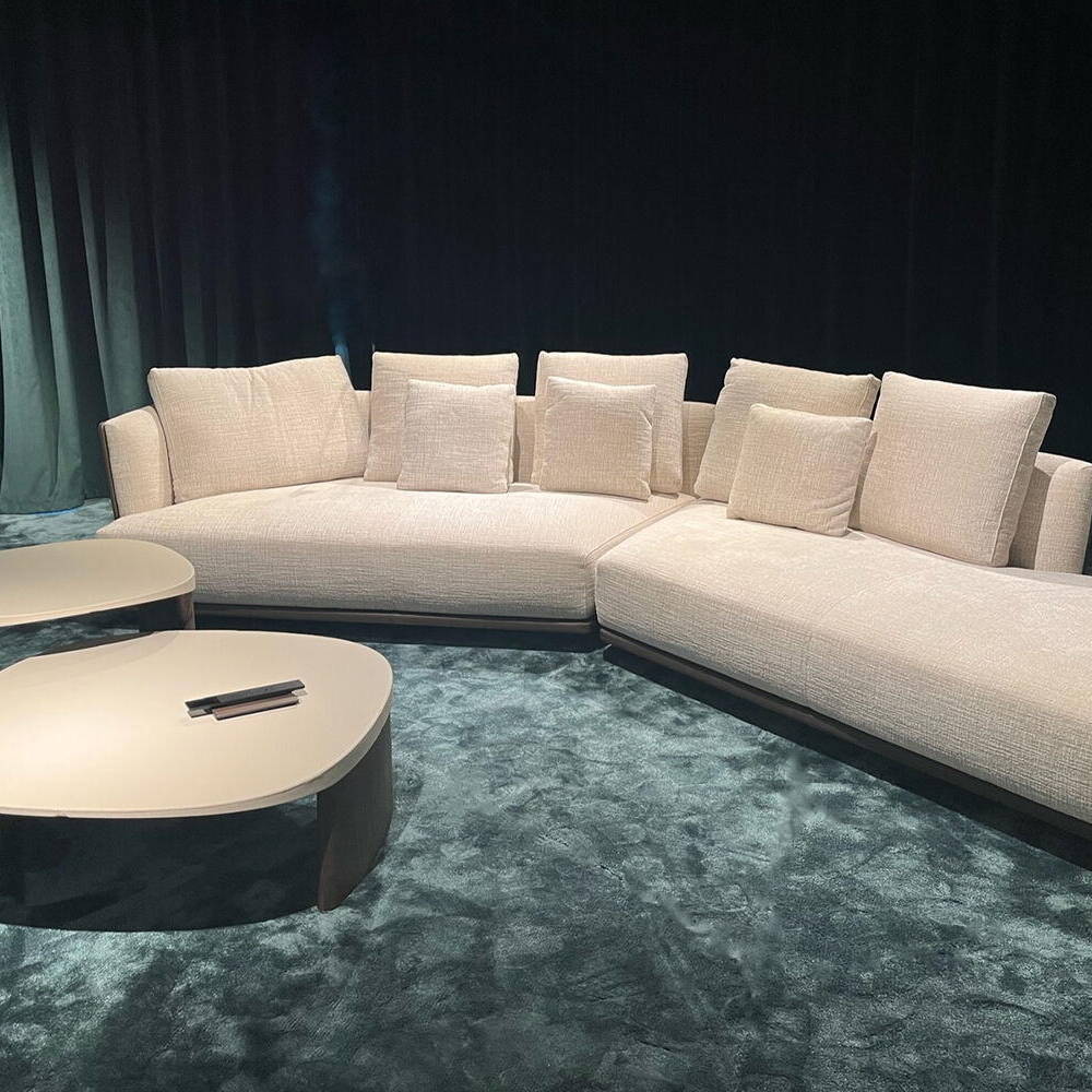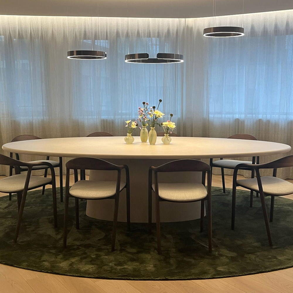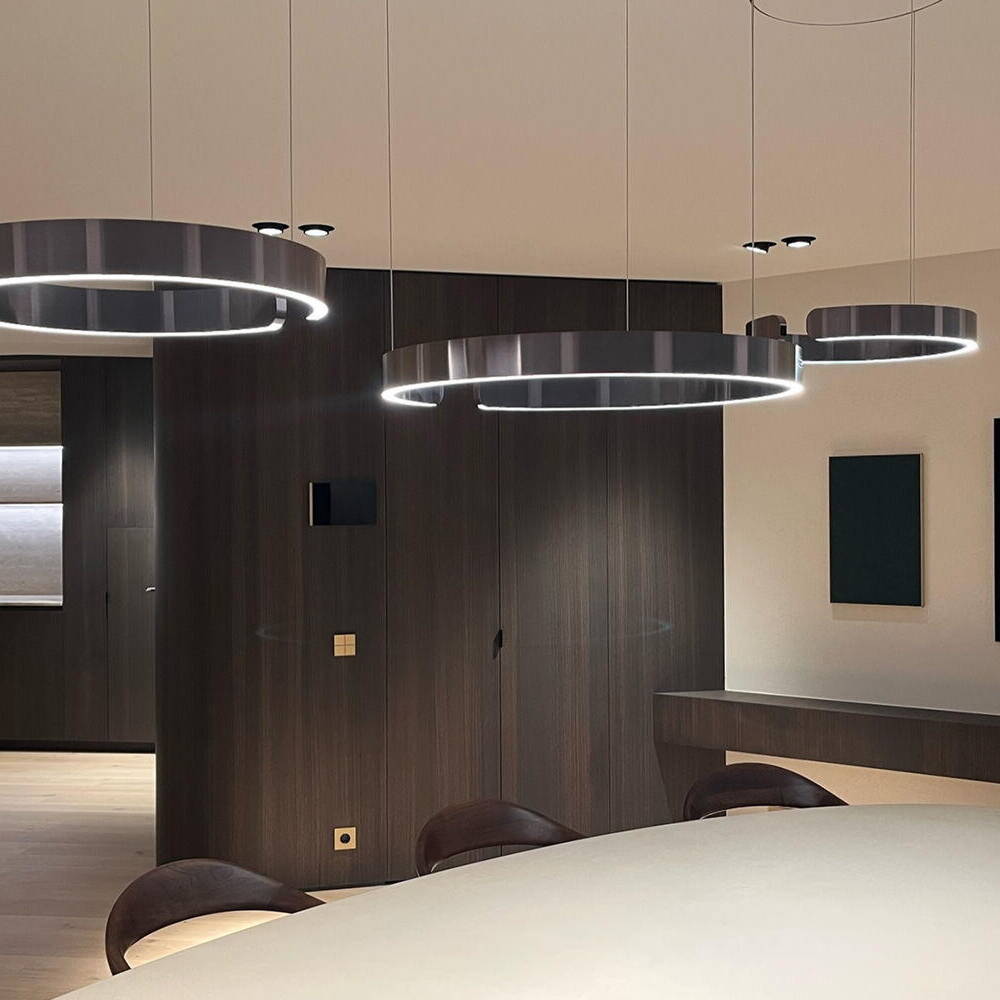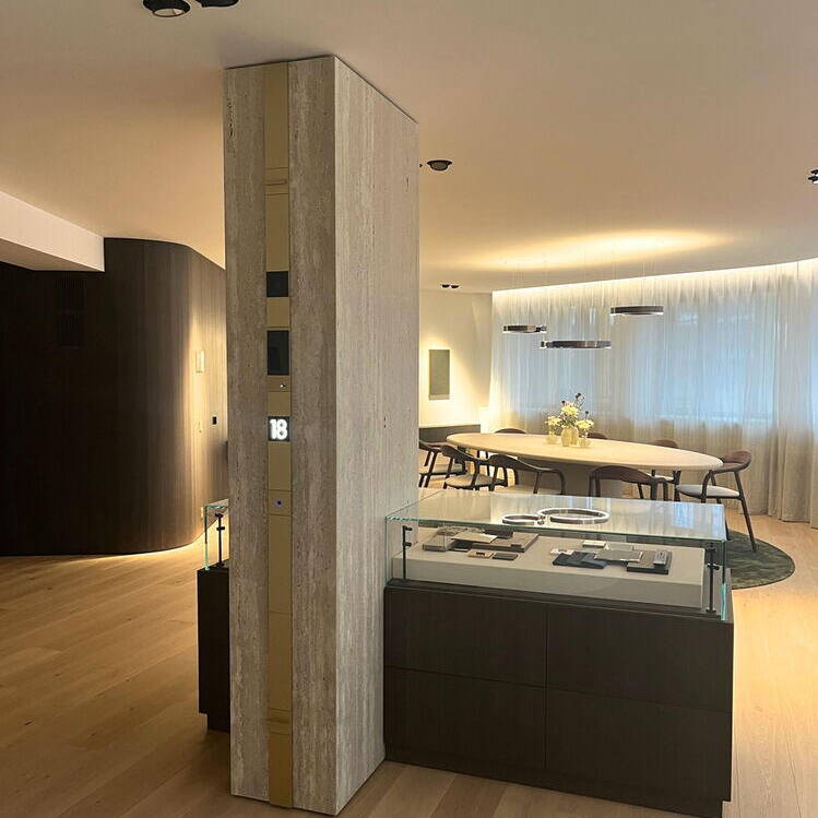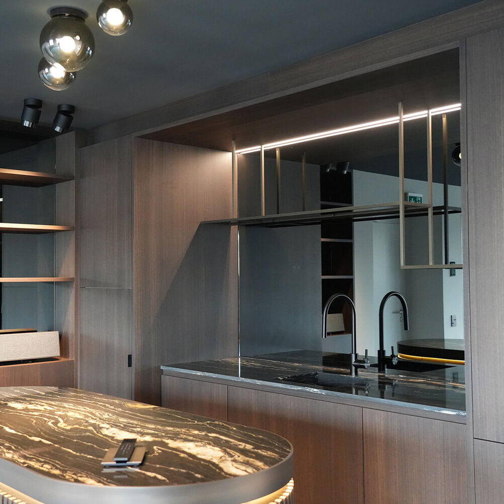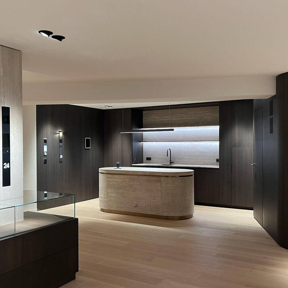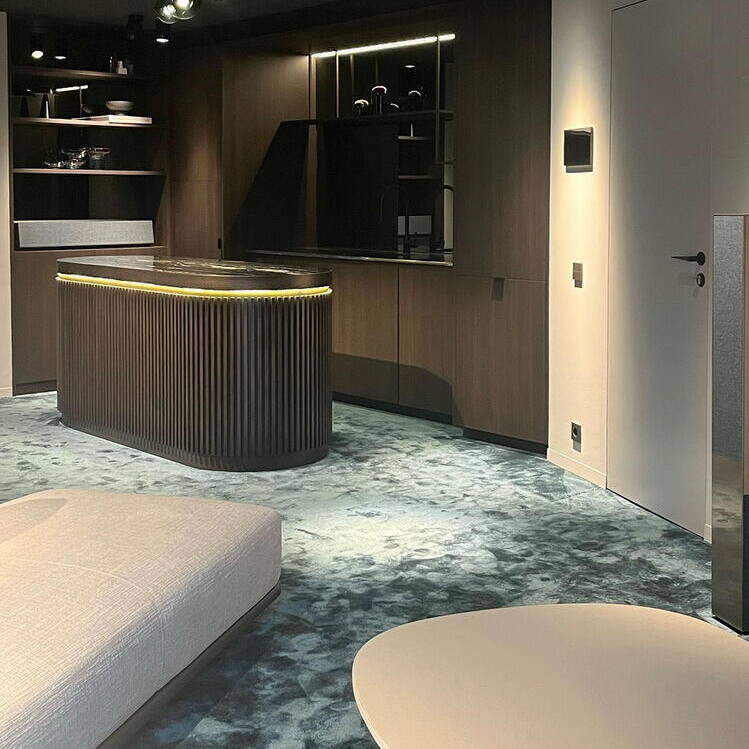 Das Unternehmen aus der Umgebung von Gent wünschte sich ein gleichermaßen gemütlich-warmes wie intelligentes Interior auf den beiden obersten Etagen in einem erst kürzlich sanierten Geschäftshaus am Schadowplatz. Wie am belgischen Mutterstandort sollten hochwertiger Naturstein, elegante Holzfurniere und verschiedene Grüntöne mit Bezug zum skandinavischen Design zum Einsatz kommen. Die Innenarchitekt:innen fanden die Herausforderung bei der Planung – wie so oft bei Ausbauten – im vorhandenen Gebäudebestand: Einerseits mussten in dem Fußboden mit geringer Aufbauhöhe die gesamte Verkabelung und Bodentanks untergebracht werden. Zum anderen war die gesamte Elektro- und Klimatechnik platzsparend auf kleinstmöglichem Raum und unsichtbar unterzubringen. Entsprechend wurde ein moderner fließender Grundriss auf der fünften Etage realisiert, der die verschiedenen Bereiche des Basalte Homes miteinander platzsparend verbindet. In dem Küchenbereich mit Kochinsel und einem kommunikativen Essbereich können die verschiedenen Schalter, Steuerungen und Sensoren besonders hautnah erlebt werden. Der Kunde kann hier die smarten Technologien direkt in Verbindung mit einem harmonisch gestalteten und luxuriösen Wohnambiente erleben. Die warme Wandverkleidung in Eukalyptusfurnier wird dabei dekorativ mit einem besonders haptischen, zu 100 Prozent natürlichem Argille-Lehmputz in „Warmwhite“ und hellem italienischem Travertin kombiniert. Auf den gespachtelten Putzflächen wird das Licht der Lichtringe von Occhio besonders warm gebrochen und diffus gestreut. Auf der sechsten Etage können Bauherren dagegen einem Heimkino-Erlebnis der besonderen Art beiwohnen. Auch hier kommt eine Wandverkleidung in Eukalyptus zum Einsatz, wird aber mit Bronze-Farbtönen kombiniert, die dem Raum einen Touch von Art Déco Style verleiht. Perfekt in Szene gesetzt wird das durch einen Hochflor-Teppich und den Velours-Vorhang in Petrol. Es entsteht glamouröses „Kinogefühl“ – natürlich auch durch die Bar mit grauem Rauchglas und einem Tresen aus Naturstein. Dessen lackierte Lamellenoberfläche aus Flüssigmetall und auch seine integrierte, indirekte Beleuchtung runden das Gesamtkonzept im Detail ab.
