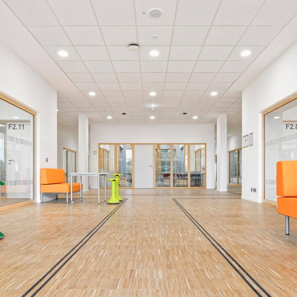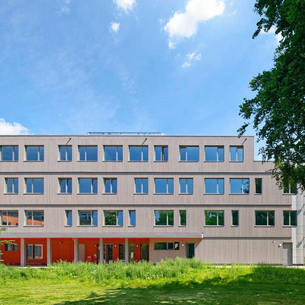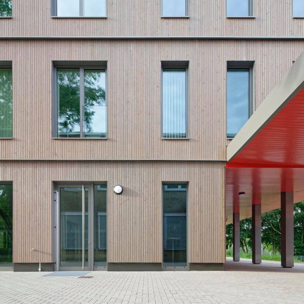 In nur 40 Wochen Bauzeit konnte das Erweiterungsgebäude des Max-Planck-Gymnasiums seinen Nutzenden übergeben werden. Bei der Planung der Cluster-Schule stand im Fokus, die neu bebaute Fläche zugunsten des Schulhofs so klein wie möglich zu halten. Auf lediglich 1.130 m² Fläche entstand ein Neubau, dessen Verbindungsdach sowie breit angelegte Treppen- und barrierefreie Rampenanlage eine bauliche Brücke zum Bestandsgebäude bilden. Das neue Gebäude öffnet sich mit einem zurückspringenden Eingangsbereich, der durch einen kräftigen Farbakzent markiert ist, sowohl zum Schulhof als auch zum Bestandsgebäude. Vertikale Holzlatten, die teilweise über die Fenster und Balkone geführt werden, lockern in Kombination mit einer Grünfassade das Gebäude mit seinem naturnahen Charakter optisch auf. Mehr noch: Es strahlt wohltuende Ruhe und Entschleunigung aus. Durch den zentralen Innenhof dringt Tageslicht zudem tief ins Gebäude hinein. Das helle, offene Forum mit Kiosk-Café verbindet als Eingangsbereich das Atrium mit der Haupttreppe. Hier finden Lernen, Entspannung und Kommunikation auf großzügigen Flächen statt. Hinzu kommen im Erdgeschoss die Mediathek, Räume für die Streitschlichtung und die Schülerfirma sowie Beraterbüros. Im zweiten Obergeschoss befinden sich zwei Cluster, die unterschiedliche Klassenräume und Lernnischen umfassen. Einbauten aus Glas und Holz verbinden die Räume miteinander, stellen Sichtbeziehungen her und vermitteln in dem lichtdurchfluteten Gebäude eine angenehme Lernatmosphäre.