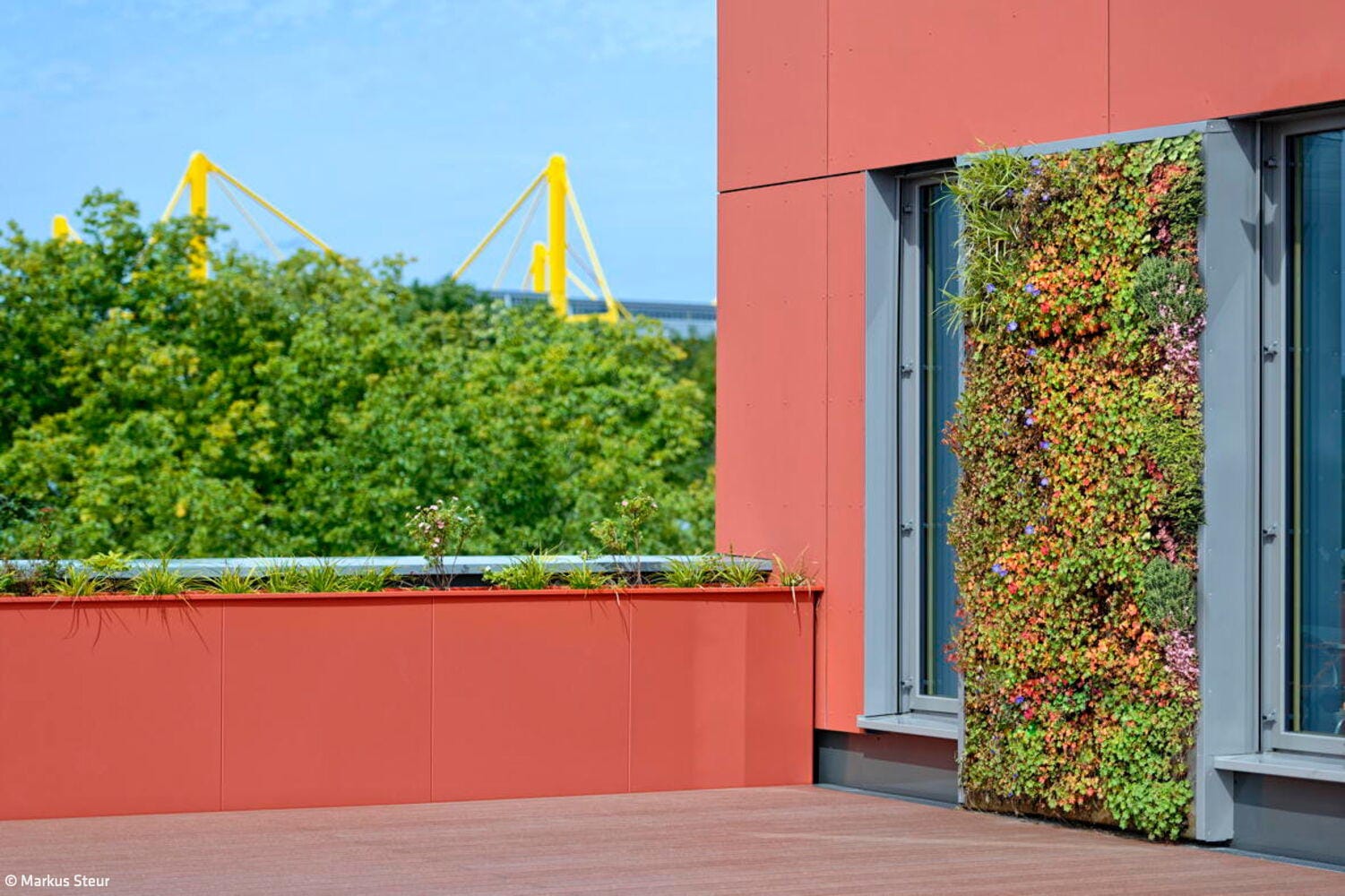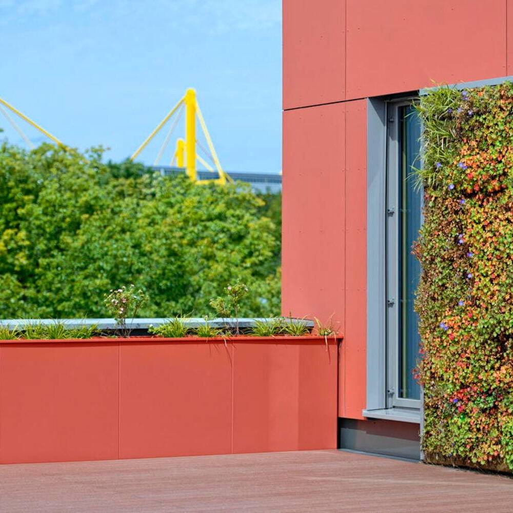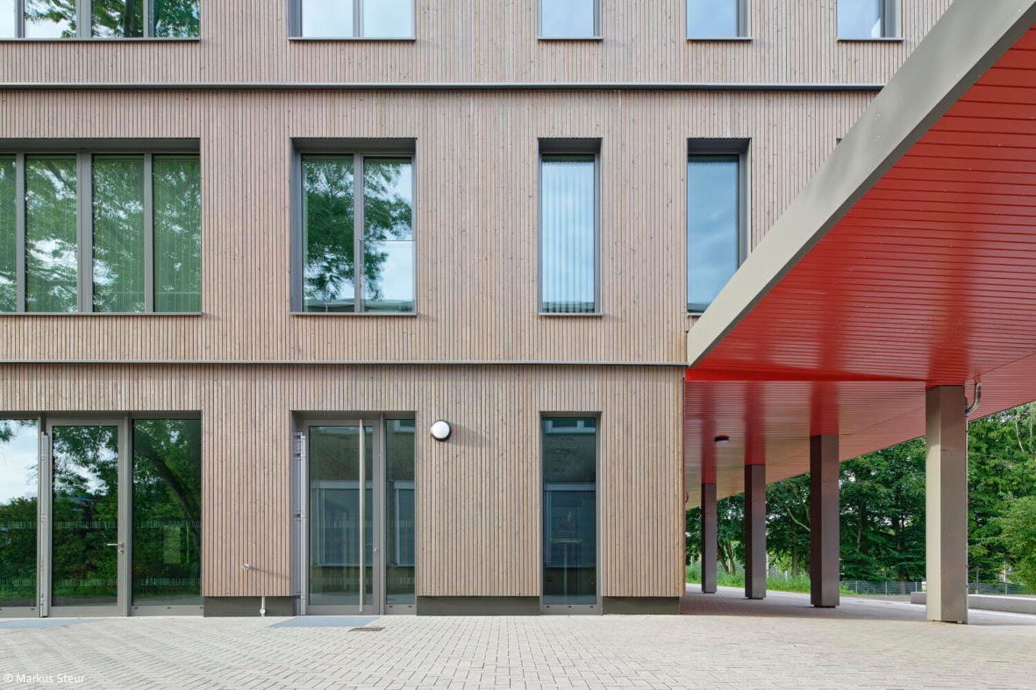 In nur 40 Wochen Bauzeit konnte das Erweiterungsgebäude des Max-Planck-Gymnasiums seinen Nutzenden übergeben werden. Bei der Planung der Cluster-Schule stand im Fokus, die neu bebaute Fläche zugunsten des Schulhofs so klein wie möglich zu halten. Auf lediglich 1.130 m² Fläche entstand ein Neubau, dessen Verbindungsdach sowie breit angelegte Treppen- und barrierefreie Rampenanlage eine bauliche Brücke zum Bestandsgebäude bilden. Das neue Gebäude öffnet sich mit einem zurückspringenden Eingangsbereich, der durch einen kräftigen Farbakzent markiert ist, sowohl zum Schulhof als auch zum Bestandsgebäude. Vertikale Holzlatten, die teilweise über die Fenster und Balkone geführt werden, lockern in Kombination mit einer Grünfassade das Gebäude mit seinem naturnahen Charakter optisch auf. Mehr noch: Es strahlt wohltuende Ruhe und Entschleunigung aus. Durch den zentralen Innenhof dringt Tageslicht zudem tief ins Gebäude hinein. Das helle, offene Forum mit Kiosk-Café verbindet als Eingangsbereich das Atrium mit der Haupttreppe. Hier finden Lernen, Entspannung und Kommunikation auf großzügigen Flächen statt. Hinzu kommen im Erdgeschoss die Mediathek, Räume für die Streitschlichtung und die Schülerfirma sowie Beraterbüros. Im zweiten Obergeschoss befinden sich zwei Cluster, die unterschiedliche Klassenräume und Lernnischen umfassen. Einbauten aus Glas und Holz verbinden die Räume miteinander, stellen Sichtbeziehungen her und vermitteln in dem lichtdurchfluteten Gebäude eine angenehme Lernatmosphäre.