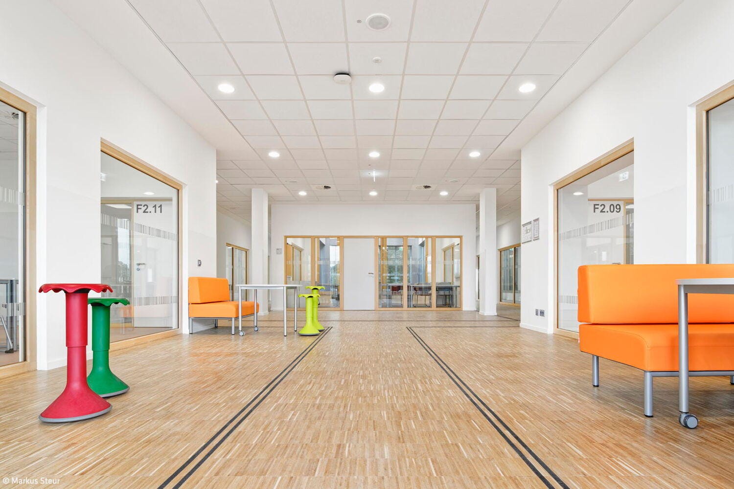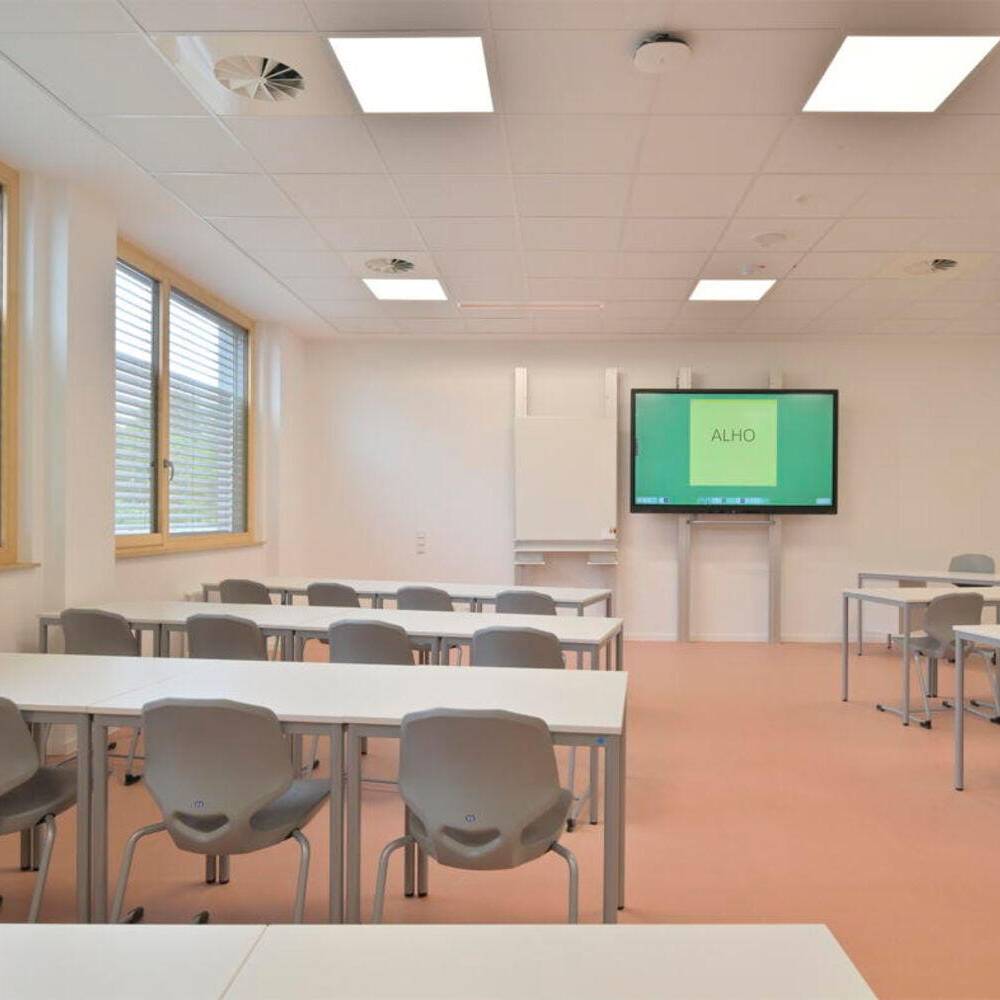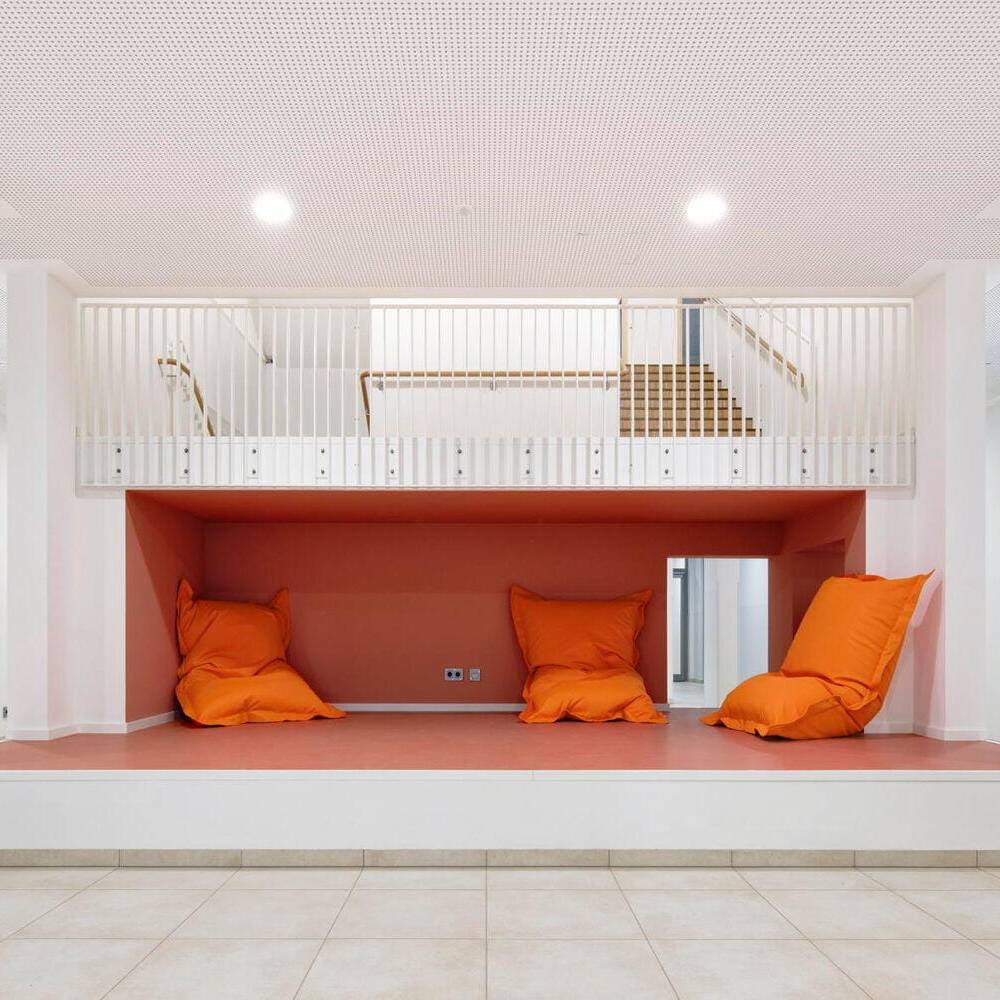 Das helle und zurückhaltende Ambiente wird durch Farbtupfer ergänzt, die sich vor allem in der Möblierung wiederfinden. Ein heller Blauton und strahlendes Weiß wiederum kennzeichnen die Sanitärräume, die sich durch ein freundliches und helles Erscheinungsbild auszeichnen. Im dritten und obersten Geschoss befinden sich die Fachräume für Kunst, Musik und Technik samt davor verorteter Ausstellungsflächen sowie Nebenräume und Lager. Jedes Detail ist durchdacht und folgt einem Zweck: So fördern Differenzierungsräume und Team-Stationen den intensiven Austausch zwischen Lehrer- und Schülerschaft. Balkone werden ebenso zu erweiterten Lernorten, während die Dachterrasse Raum zum Gärtnern, für Zeichenkurse oder zum Proben im Freien bietet.