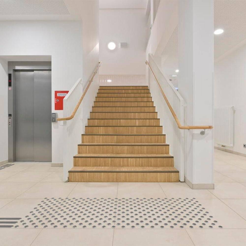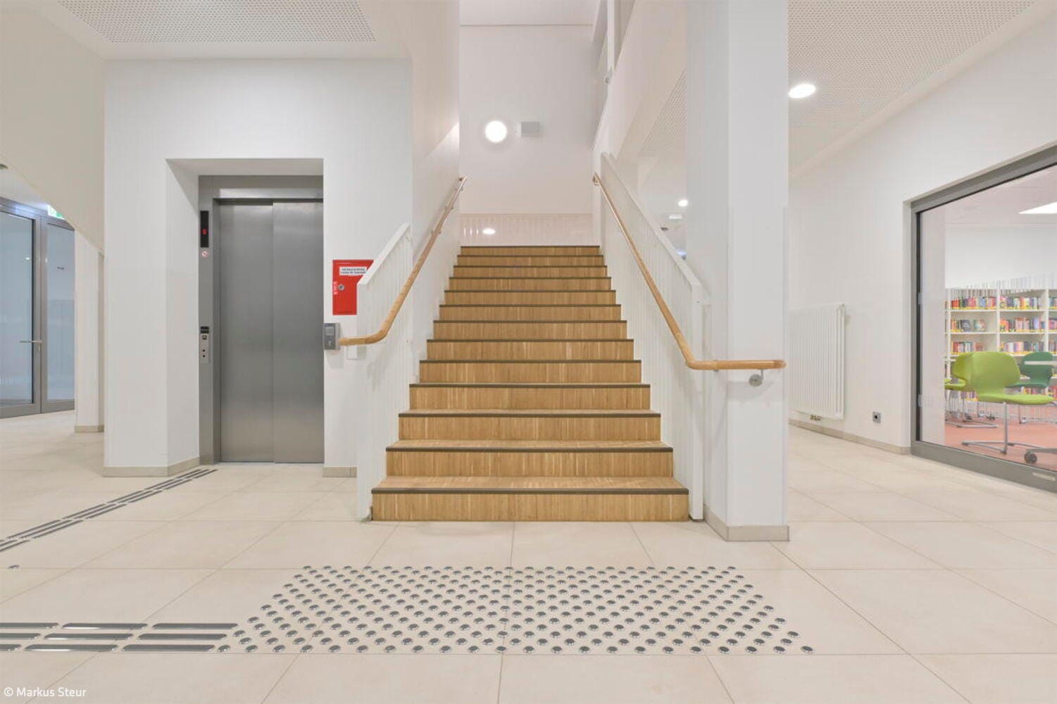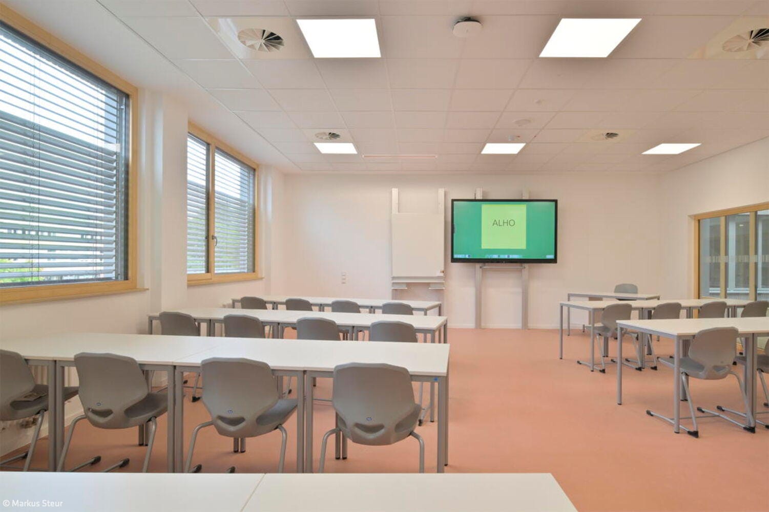 Das helle und zurückhaltende Ambiente wird durch Farbtupfer ergänzt, die sich vor allem in der Möblierung wiederfinden. Ein heller Blauton und strahlendes Weiß wiederum kennzeichnen die Sanitärräume, die sich durch ein freundliches und helles Erscheinungsbild auszeichnen. Im dritten und obersten Geschoss befinden sich die Fachräume für Kunst, Musik und Technik samt davor verorteter Ausstellungsflächen sowie Nebenräume und Lager. Jedes Detail ist durchdacht und folgt einem Zweck: So fördern Differenzierungsräume und Team-Stationen den intensiven Austausch zwischen Lehrer- und Schülerschaft. Balkone werden ebenso zu erweiterten Lernorten, während die Dachterrasse Raum zum Gärtnern, für Zeichenkurse oder zum Proben im Freien bietet.