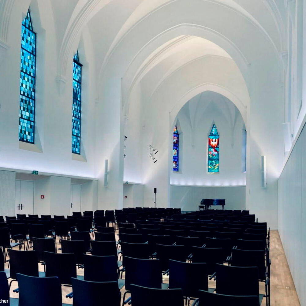 Um die Gebäude energetisch zu ertüchtigen, wurden die Außenwände mit einem speziellen Aerogel-Dämmputz verkleidet, der sie effizienter macht, während die typischen Fenster des Klosters erhalten blieben. Die Attika im Kreuzgang wurde erhöht und das Gesims auf das Hotelgebäude abgestimmt. Hier wurden Fensterelemente aus energetischen Gründen erneuert und vereinheitlicht, sodass ein homogenes Gesamtbild entstand. Kultureller Mittelpunkt des Klosters ist die Kirche: Ihre frisch geweißten Wände lassen einerseits die leuchtend bunten Farben der Kirchenfenster besonders zur Geltung kommen und bieten andererseits Raum für die Installation von akustisch wirksamen Holzlamellen, die die Heiztechnik verbergen. So entstand in dem erweiterbaren Raum eine Atmosphäre, die den kirchlichen Charakter des Raumes bewahrt und für Konzerte ebenso wie für Seminare geeignet ist.