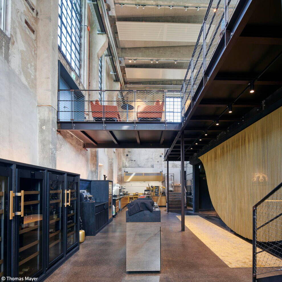 Unter Tage, sprich im Untergeschoss, befindet sich das elegante Restaurant „Schwarzgold“, in das kein Tageslicht fällt. Alles, einschließlich der offen einsehbaren Kochwerkstatt, ist in den namensgebenden Farben gehalten. In puncto Lichtgestaltung war dies herausfordernd. Im Untergeschoss befinden sich außerdem die WC-Anlage, Kühlraum und Technikräume. Der gedämmte Neubau wurde mit Trapezblech ummantelt und mit einem begrünten Dach versehen. Hier befindet sich die Produktion der Gastronomie mit Räumen wie Küche, Spülküche, Konditorei sowie Logistikflächen und Sozialräumen. Die An- und Auslieferung mit praktischen Rolltoren erfolgt über eine neue Zuwegung in der Nordfassade.