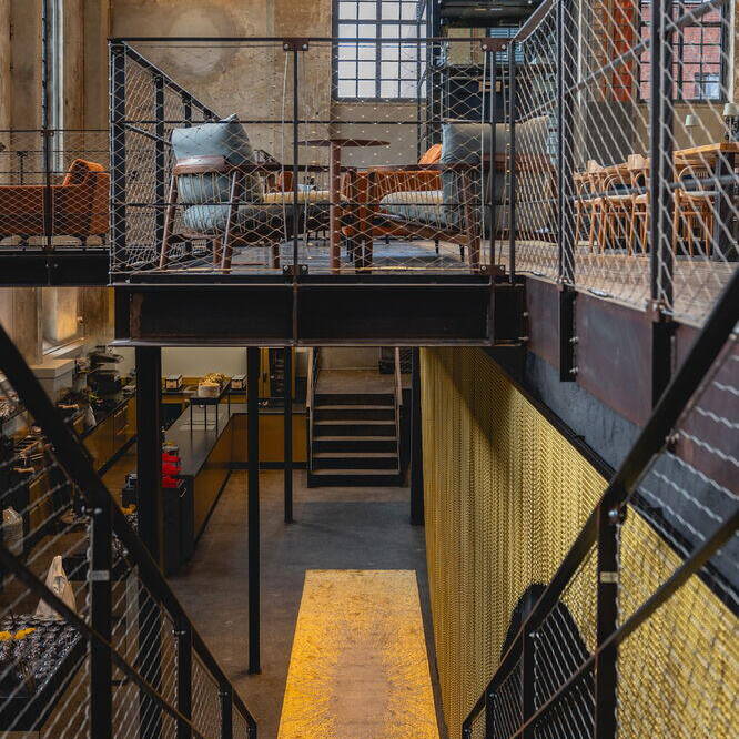 Die Verwaltung des Gastronomen wurde wiederum in dem Gebäude der ehemaligen Anthracenölregenerierungsanlage untergebracht. Um genügend Platz für die geforderten Arbeitsplätze zu schaffen, wurde in die kleine Halle eine zusätzliche Geschossdecke eingezogen. Eine loftartige Bürofläche ist entstanden.