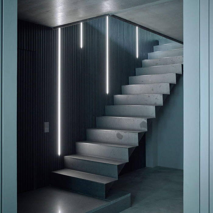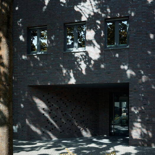 Unweit des Bottroper Rathauses hat Less Plus Architektur ein Mehrfamilienhaus mit vier Wohnungen und einer Büroeinheit geplant und gebaut. Das miteinander verbundene Erd- und Untergeschoss werden von den Architekten Philipp Valente, Nils Martens und deren Team selbst genutzt. Die Räume orientieren sich am ästhetischen Verständnis der Architekten, die in ihrer Kreativschmiede die Industrieästhetik des Ruhrgebiets mit japanischen Einflüssen verknüpfen. „Entsprechend der japanischen Philosopie gibt ein dunkles Interior Raum für Schatten“, erläutert Philipp Valente.