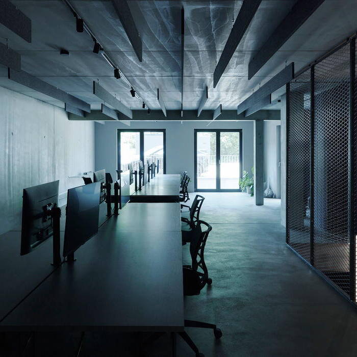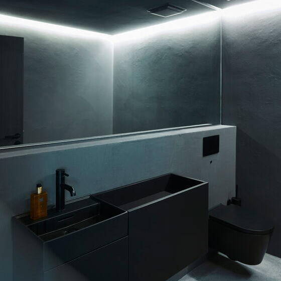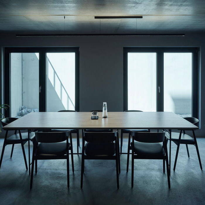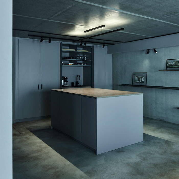 Besonders hervorzuheben sind in Bezug auf die Wirkung des Lichts die transluzenten Elemente der Fassade. Das Filtermauerkwerk schafft in Verbindung mit einer Streckmetallbegrünung ein Spiel von Licht und Schatten und verleiht der Architektur eine einzigartige visuelle Wirkung. Dieses gestalterische Element fügt sich harmonisch in die Umgebung ein und schafft eine Verbindung zur Natur. Ebenso wichtig war den Architekten, dass die Raumgestaltung die Arbeitsweise des Teams widerspiegelt, die durch flache Hierarchien geprägt ist. Die Elemente, die den offenen und großzügigen Raum im Erdgeschoss prägen, sind linear angeordnet und geben dem Raum eine Richtung. Organische Pflanzen und Felsen durchbrechen bewusst diese Struktur. Mittels eines Schienenvorhangsystems können die Räume nach Bedarf geteilt oder geöffnet und somit verschiedene Arbeitsbereiche geschaffen werden. Für eine gute Raumakustik sorgen Akustikpaneele an der Decke und schwere Schallschutzvorhänge. Die minimalistische und aufgeräumte Ästhetik zieht sich durch das gesamte Objekt. Sämtliche Möbel sind Sonderanfertigungen und wurden gemeinsam mit der Schreinerei entworfen: die Tische mit Platten aus Echtholzfurnier, Möbel, die beispielsweise den Fernseher am Stehtisch verbergen oder die Küchenmöbel, in denen nahezu alle Küchengegenstände unsichtbar verschwinden. Dazu wird roher Stahl kombiniert, der sich an der Treppe, an dem Streckmetall der Absturzsicherung und als Material für die Regale wiederfindet. Durch gezielte Beleuchtung werden bestimmte Bereiche und architektonische Details betont, während gleichzeitig eine angenehme Atmosphäre entsteht. Die beleuchtete Schattenfuge in den Bädern, die das dunkle Interior betont, und die schmalen Lichtbänder an der Treppe sind Beispiele dafür. Gab es denn auch Hindernisse auf dem Weg zum stylischen Büro? „Und ob“, wirft Nils Martens ein: „Das Objekt befindet sich in einem Druckwasserbereich und wir mussten große Mühen und Kosten aufwenden, um das Kellergeschoss als Wanne auszubilden.“ Das Objekt ist am Tag der Architektur am 30. Juni zu besichtigen.