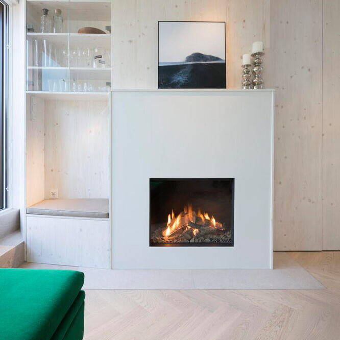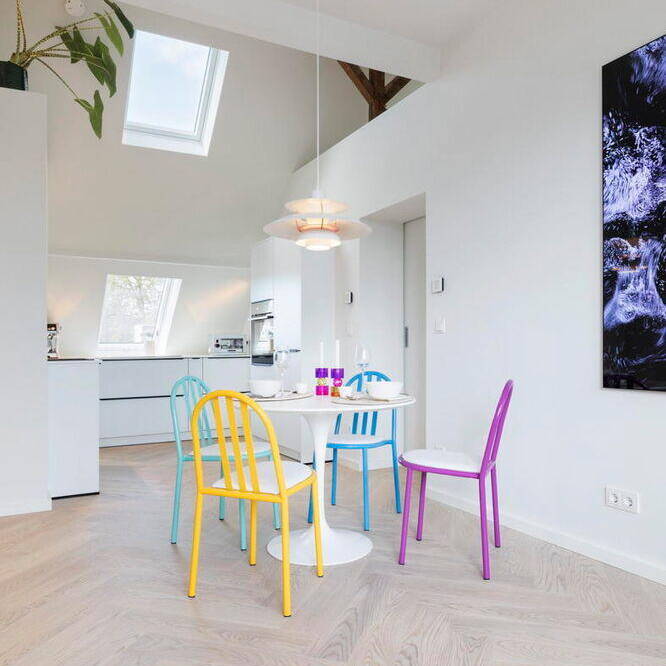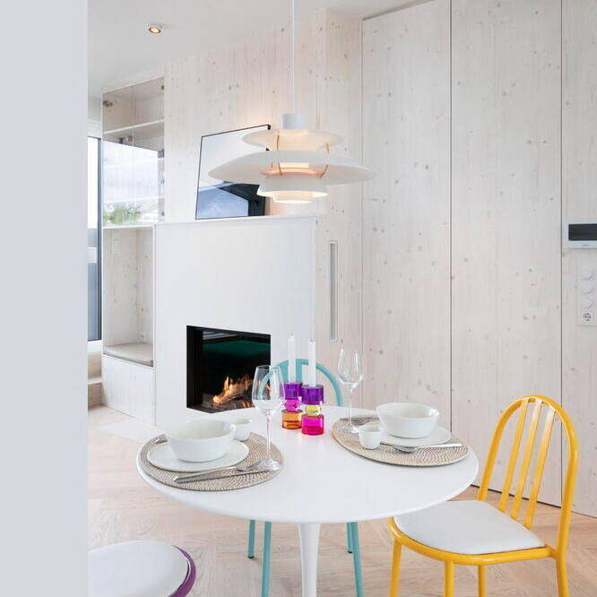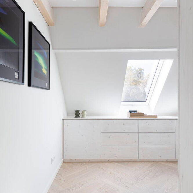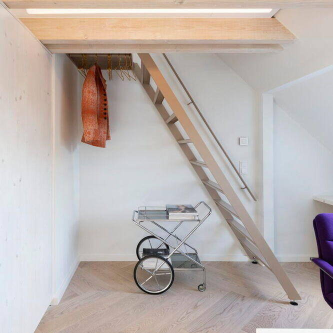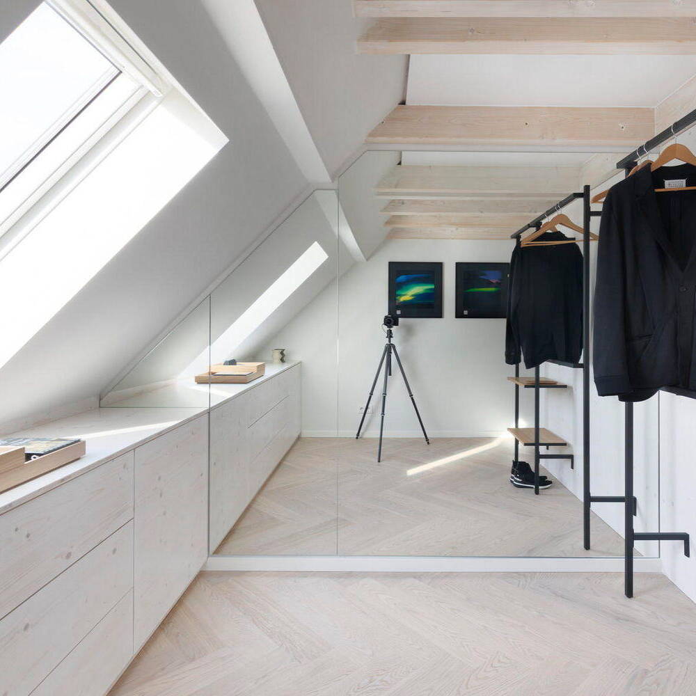 Im Inneren besticht die Wohnung durch ein durchdachtes Konzept: Eine gemütliche Schlafempore ermöglicht einen freien Blick in den Himmel, während warme Materialien wie weiß geöltes Eichen-Fischgrätparkett und maßgefertigte Einbauten vom Tischler für ein stilvolles, luftiges Ambiente sorgen. „Durch die besonderen Dachschrägen war eine klassische Möblierung kaum möglich, weshalb sich der Bauherr für eine maßgeschneiderte, raumbildende Gestaltung entschied“, erklärt Susanna Maslankowski. Die clever integrierten Einbaumöbel nutzen den vorhandenen Platz optimal aus. Um die Wohnung größer wirken zu lassen, entschieden sich Bauherr und Architektin für fließende Übergänge zwischen dem Wohn-, Schlaf- und Küchenbereich. Die Wände sowie die Möbel und Schränke aus geweißter, matt lackierter Lärche verleihen dem Raum eine elegante, warme Note. Für Frische und Lebendigkeit sorgen vereinzelte farbintensive Möbel sowie ikonische Designstücke. Auch technisch ist die Wohnung auf dem neuesten Stand: Eine moderne Fußbodenheizung, eine Klimaanlage für den Sommer sowie ein stilvoll integrierter Gaskamin für kalte Wintertage sorgen für Wohnkomfort an 365 Tagen im Jahr. „Trotz der kompakten Wohnfläche hat dieser Dachgeschossausbau alles, was es für modernes Wohnen braucht“, resümiert die Architektin.
