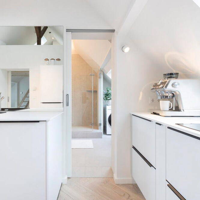 Bei der umfassenden Kernsanierung und stilvollen Modernisierung des charmanten Stadthauses, das um die Jahrhundertwende erbaut wurde, lag der Fokus auf dem Umbau des ehemaligen Dachbodens. Der ungenutzte Speicher wurde von Susanna Maslankowski, Inhaberin des Büros rooom.biz, in eine exklusive Dachgeschosswohnung mit rund 60 m² Wohnfläche verwandelt. Gelungen ist dies durch die Integration einer großzügigen Gaube, die zusätzlichen Raum und Licht in die Wohnung bringt. Das Flachdach des bestehenden Anbaus, der sich über drei Etagen erstreckt, wurde genutzt, um eine großzügige Dachterrasse von fast 30 m² zu realisieren. Auf dieser eröffnet sich ein besonderer Ausblick – mitten in der Stadt. Das Appartement überzeugt nicht nur als urbaner Rückzugsort über den Dächern Düsseldorfs, sondern mit einer cleveren Raumplanung sowie hochwertigen Ausstattungsdetails, die Ferienhaus-Charakter vermitteln.