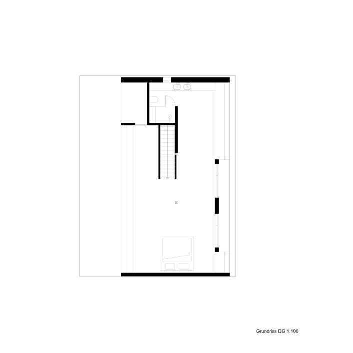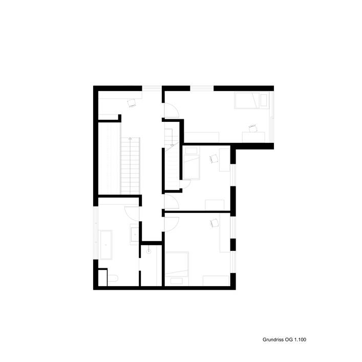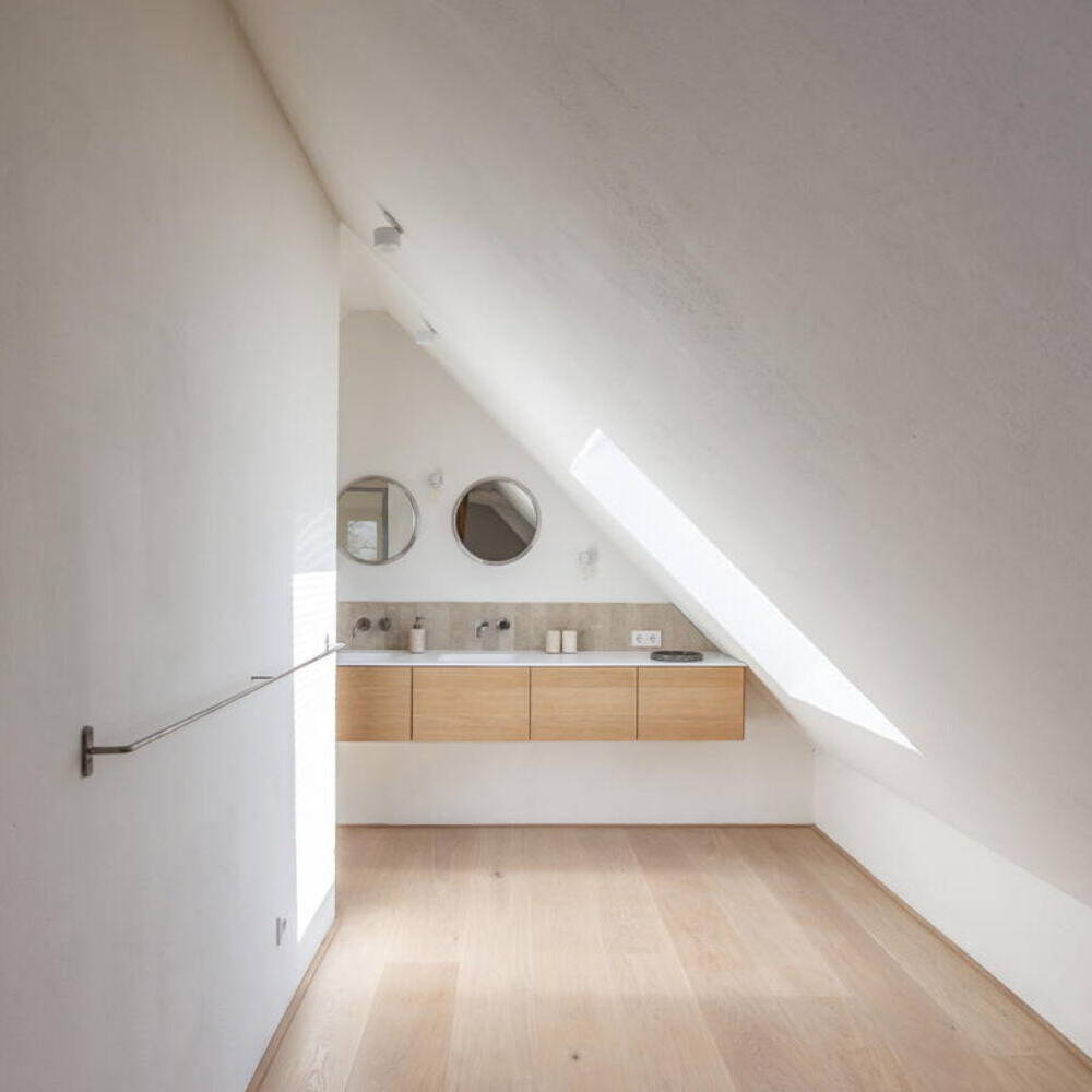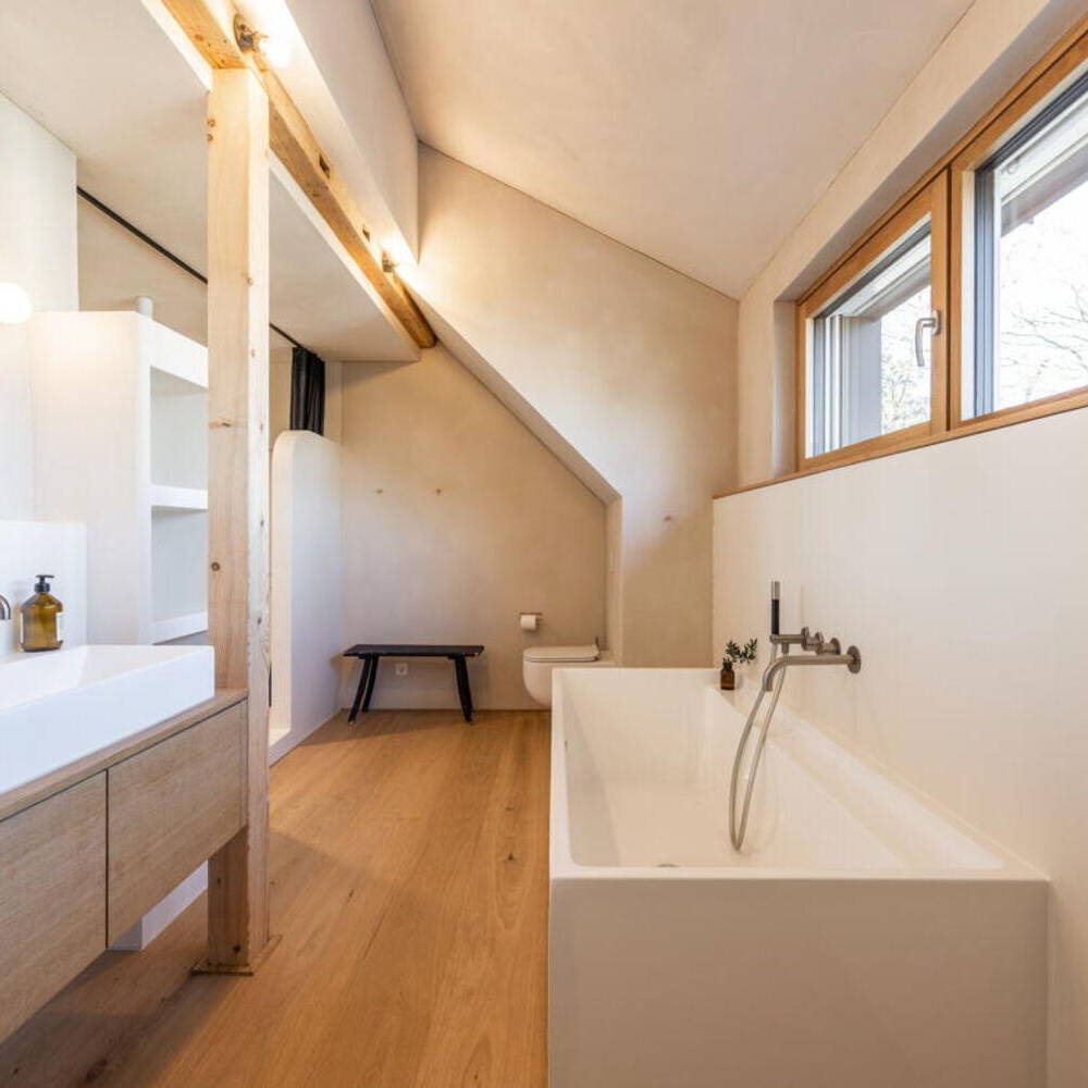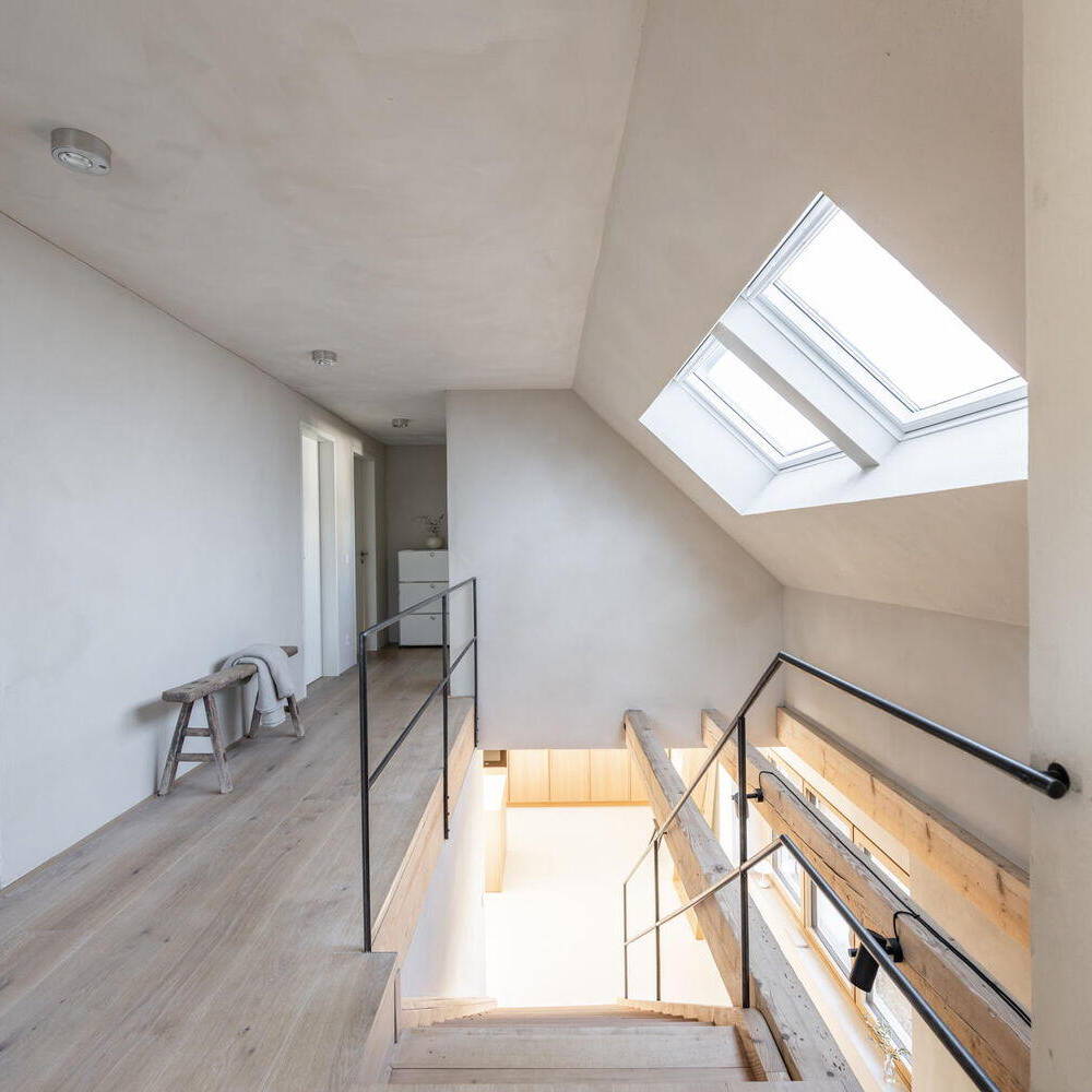 Freigelegte alte Holzbalken und die aufbereitete Holztreppe ins Obergeschoss erzählen von der Geschichte des Hauses. Im Obergeschoss entstanden drei Kinderzimmer, ein großzügiges Badezimmer sowie die neue Erschließung des Dachgeschosses. Eine Falttreppe aus Eichendielen führt hinauf ins ausgebaute Dachgeschoss, dass einen Schlafraum mit offenem Badezimmer beherbergt. Eine breite Dachgaube auf der Südseite öffnet den Raum und sorgt für eine angenehme Raumhöhe.