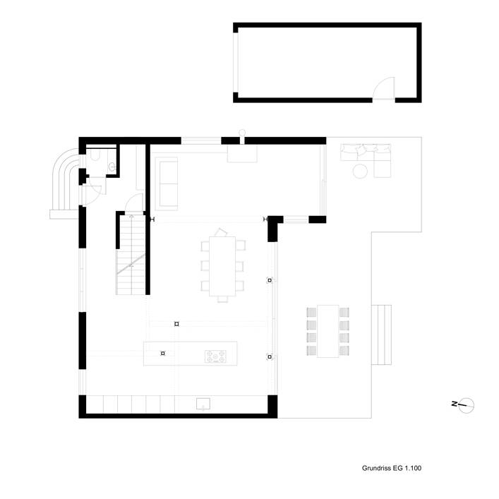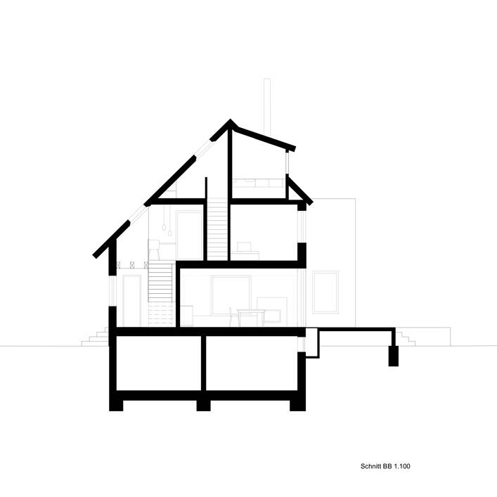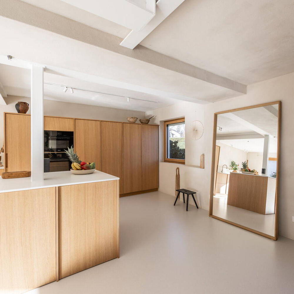 Um die Wohnbedürfnisse und den Raumbedarf der Familie baulich umsetzen zu können, stockten lohrmannarchitekten den Erker im 1. Obergeschoss mit einem Holzständerbau auf, bauten das Dachgeschoss zum Wohnraum aus und erschlossen es über eine neue Treppe. Im Erdgeschoss wurden sämtliche Wände entfernt, die den Wohnraum zuvor in kleine, voneinander getrennte Zimmer unterteilt hatten. Eine neue Stahlkonstruktion ermöglicht eine offene, ineinandergreifende Gestaltung und einen neuen Luftraum, der sich unter die Dachebene zieht. Eine große Glasfront, die reichlich Tageslicht in den Mittelpunkt des Familienlebens bringt, wird im Außenraum von einer erhöhten Terrasse ergänzt, die den Wohnraum in die Natur erweitert. Die große Wohnküche mit weißgeölten Eichenflächen und einer Kücheninsel bildet einen warmen Kontrast zu den hellen, rauen Kalkputzwänden und zum Gussboden aus natürlichen Biopolymeren mit eingearbeiteten Steinchen, der sich durch die gesamte Etage zieht. Der Essbereich als zentraler Punkt im Raum bietet Platz für die ganze Familie. Der neue Einbaukamin und das angrenzende quadratische Panoramasitzfenster werten den Wohnbereich zusätzlich auf und sind vor allem in der kühleren Jahreszeit eine echte Bereicherung. Die schlichten Eichenholz-Aluminiumfenster fassen wie Bilderrahmen den Blick in die umgebende Natur ein. Brüstungselemente aus schwarzem rohem Stahl sowie Griffe und Armaturen aus mattem Edelstahl setzen einen Kontrast zu den hellen Oberflächen.