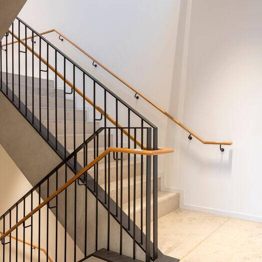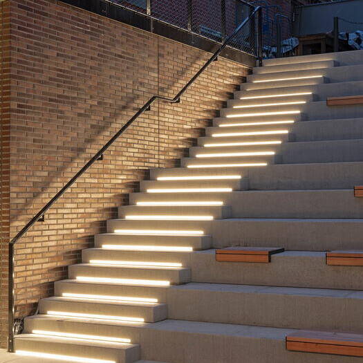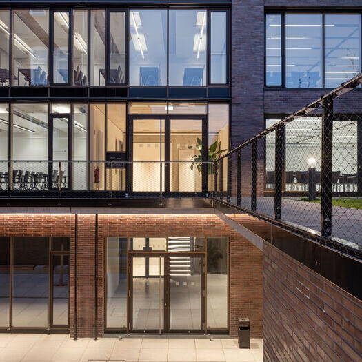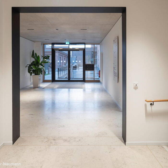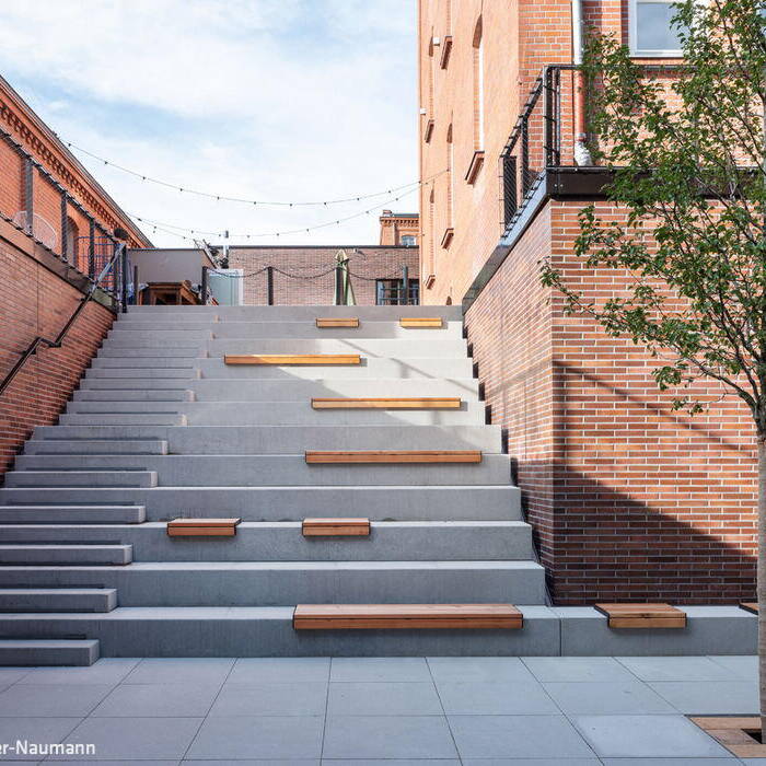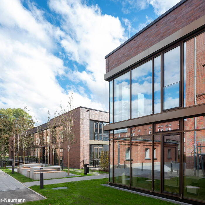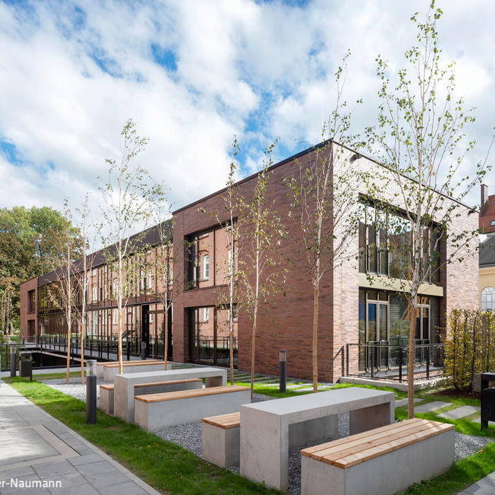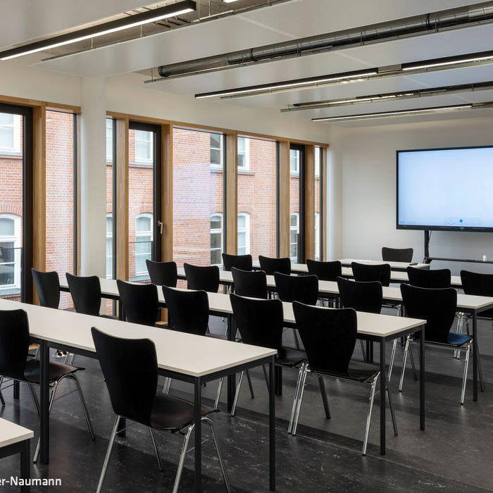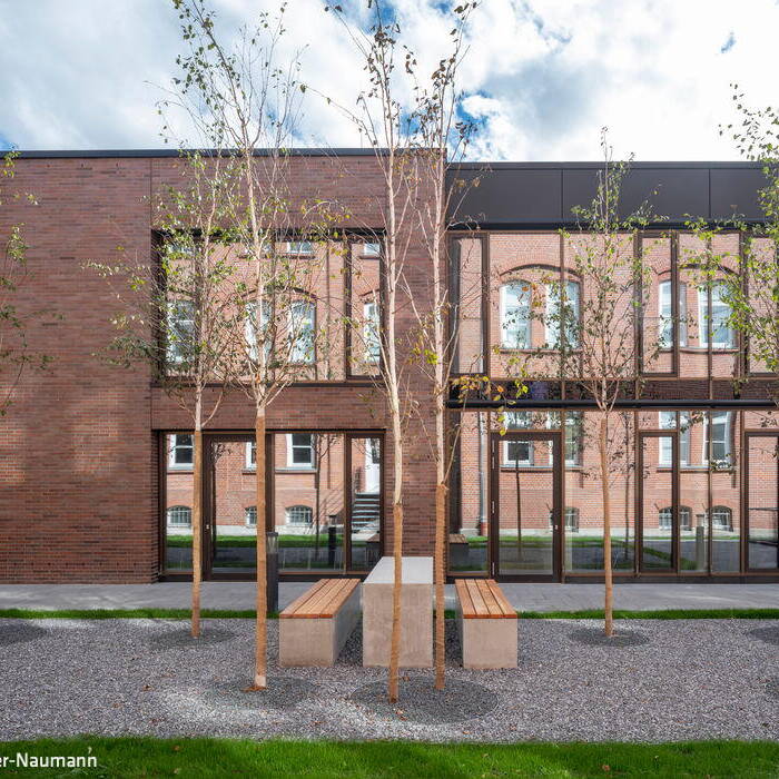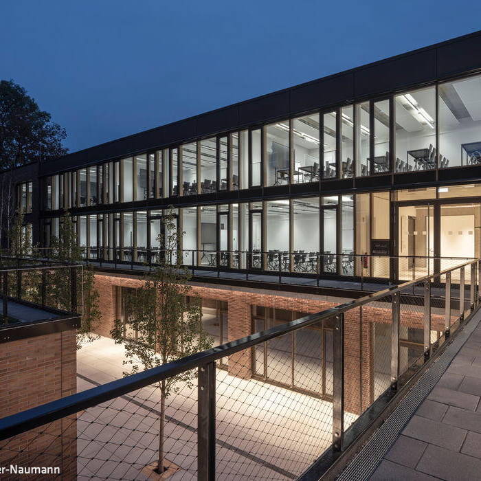 Eine breite, teils mit Sitzflächen ausgestattete Freitreppe führt in den vier Meter tiefer liegenden Hof. Sie bildet den Zugang zur Mensa für den Campus und einem öffentlichen Restaurant. Der Vorplatz bietet in der warmen Jahreszeit genügend Raum, um das Lokal nach draußen zu erweitern – ein idealer Treffpunkt für alle Nutzer:innen des Campus. Das erweiterte Untergeschoss, das die beiden neuen Pavillons verbindet, beherbergt auch noch die Bibliothek für die Studierenden. Die Gestaltung der Fassaden mit Klinker und großzügigen Glasflächen der Holz-Pfosten-Riegel-Fassade, in denen sich die alten Gebäude spiegeln, wird im Innenbereich ergänzt mit einer reduzierten Auswahl an Materialien und Farben: Sichtbeton, schwarzer Stahl, heller Naturstein, dunkles Linoleum oder Industrieparkett. Das Gebäude birgt insgesamt neun Seminarräume für je 30 bis 55 Personen.