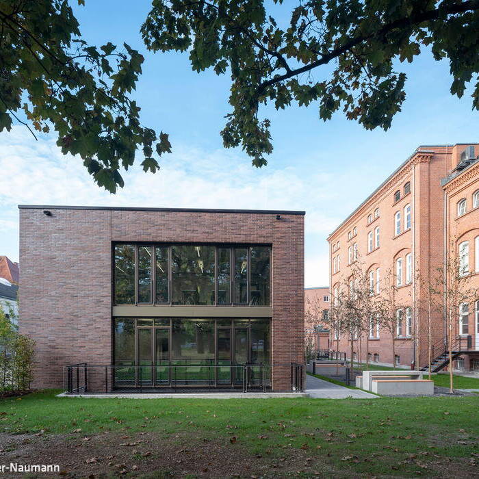 Zwischen den im 19. Jahrhundert erbauten denkmalgeschützten ehemaligen Kasernengebäuden des Campus Infanteriestraße 11 a sind die flachen Neubauten der Pavillons I–VI eingefügt worden. Sie bilden zusammen ein städtebaulich und architektonisch hochwertiges Ensemble. Wachsender Raumbedarf machte eine Erweiterung um weitere Pavillons notwendig. Wie der schon zehn Jahre alte Pavillon IV wurden die neuen Gebäude V und VI vom Münchner Architekturbüro Weickenmeier, Kunz + Partner entworfen und realisiert. Halb versteckt hinter einem der mächtigen Bestandsgebäude liegen die Neubauten des Pavillon V und des kleineren Pavillon VI. Wie ihre Vorgänger verfügen auch diese schlanken doppelgeschossigen Gebäude über eine dunkelrote Klinkerfassade, die sich von den hellroten Ziegeln der ehemaligen Kasernengebäude optisch absetzt. Die dezente Farbigkeit, die großflächigen Fenster und die schlanke schmale Form verleihen den „Lernhäusern“ eine gewisse Eleganz, die in keiner Weise an nüchterne Bürobauten denken lässt. Die Flachdächer sind intensiv begrünt und dienen der klimatischen Verbesserung des Campus-Geländes. Eingebettet in Grünanlagen der Landschaftsarchitekten realgrün, entstand ein sensibler Übergang zu den südlichen Nachbargebäuden der denkmalgeschützten Reithalle und eines künftigen Gebäudes der TUM. Oberirdisch ordnen sich die Pavillons mit ihrer Zweigeschossigkeit den denkmalgeschützten Kasernengebäuden unter, in Analogie zu den restlichen Pavillons. Beim Näherkommen gibt der vordere Pavillon den Blick auf sein durch einen Tiefhof ergänztes Untergeschoss frei.