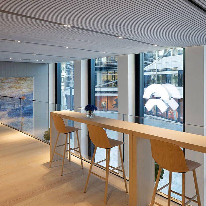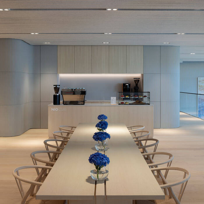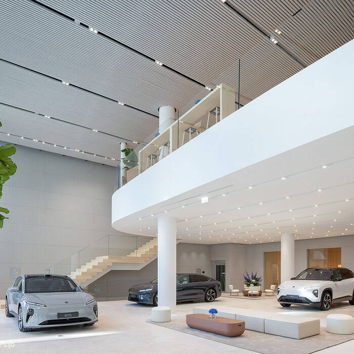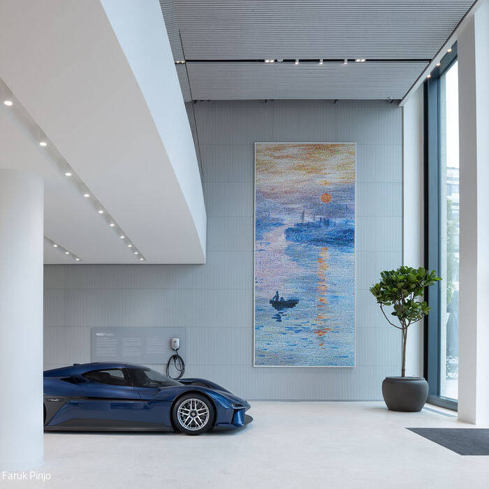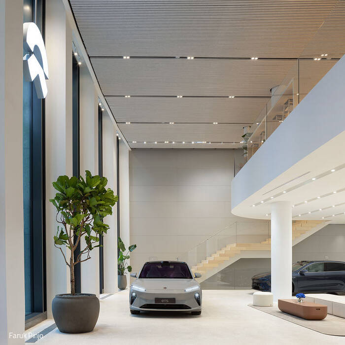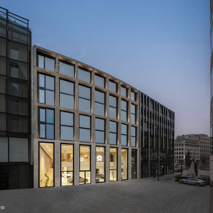 Der siebengeschossige Neubau sieht im Erd- und 1. Obergeschoss sowie im Untergeschoss eine mehrgeschossige Ladennutzung vor – darüber fügen sich fünf weitere Büroetagen und eine Dachterrasse mit urbanem Weitblick. Während es sich in der Traufhöhe und den Baufluchten an dem umliegenden Bestand orientiert, entwickelt das Gebäude in seiner Fassadengestaltung eine besondere Prägnanz. Nicht nur das Doppelgeschoss besticht durch die üppige Transparenz seiner über acht Meter Höhe ausgebildeten Glasfront. Entsprechend konnte auch im Inneren ein neun Meter hoher Luftraum entstehen, den das dänische Architekturbüro Schmidt Hammer Lassen für den chinesischen Elektroautohersteller nio konzipiert und realisiert hat. Aber auch die Fensterformate in den Bürogeschossen sind nicht im klassischen 1,35er-Raster ausgebildet, sondern setzen auf breite, raumhohe Verglasungen, die viel Tageslicht in die Büros lassen. Eingefasst sind die Scheiben in Laibungen aus ungewöhnlich großen Natursteinplatten, in denen die Glaselemente pro Geschoss um eine Handbreite immer weiter nach innen zurückspringen. Dabei ändern sich auch die Texturen des Steins aufsteigend: Sind die Platten aus Wachenzeller Dolomit in der Erdgeschosszone noch rau geschliffen, werden sie in den folgenden Etagen immer weiter gestockt – bis der Stein auf dem obersten Geschoss so grob gehauen ist, dass er wie aus dem Steinblock direkt herausgeschnitten erscheint. Dieses subtile Spiel in der Vertikalen verleiht der Fassade eine lebendige Plastizität, die dafür sorgt, dass sich der Neubau auch gegenüber dem dynamisch bewegten Kö-Bogen von Daniel Libeskind prägnant und elegant behauptet.