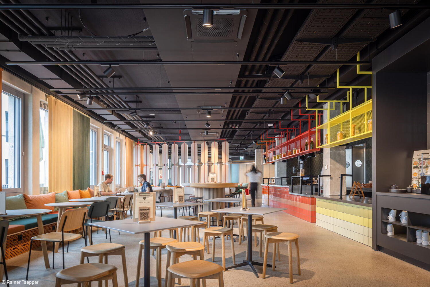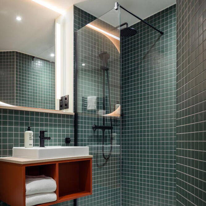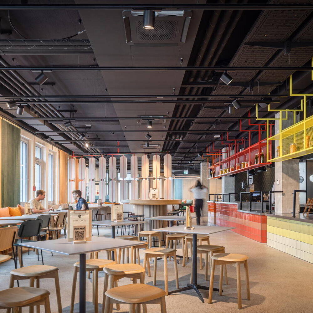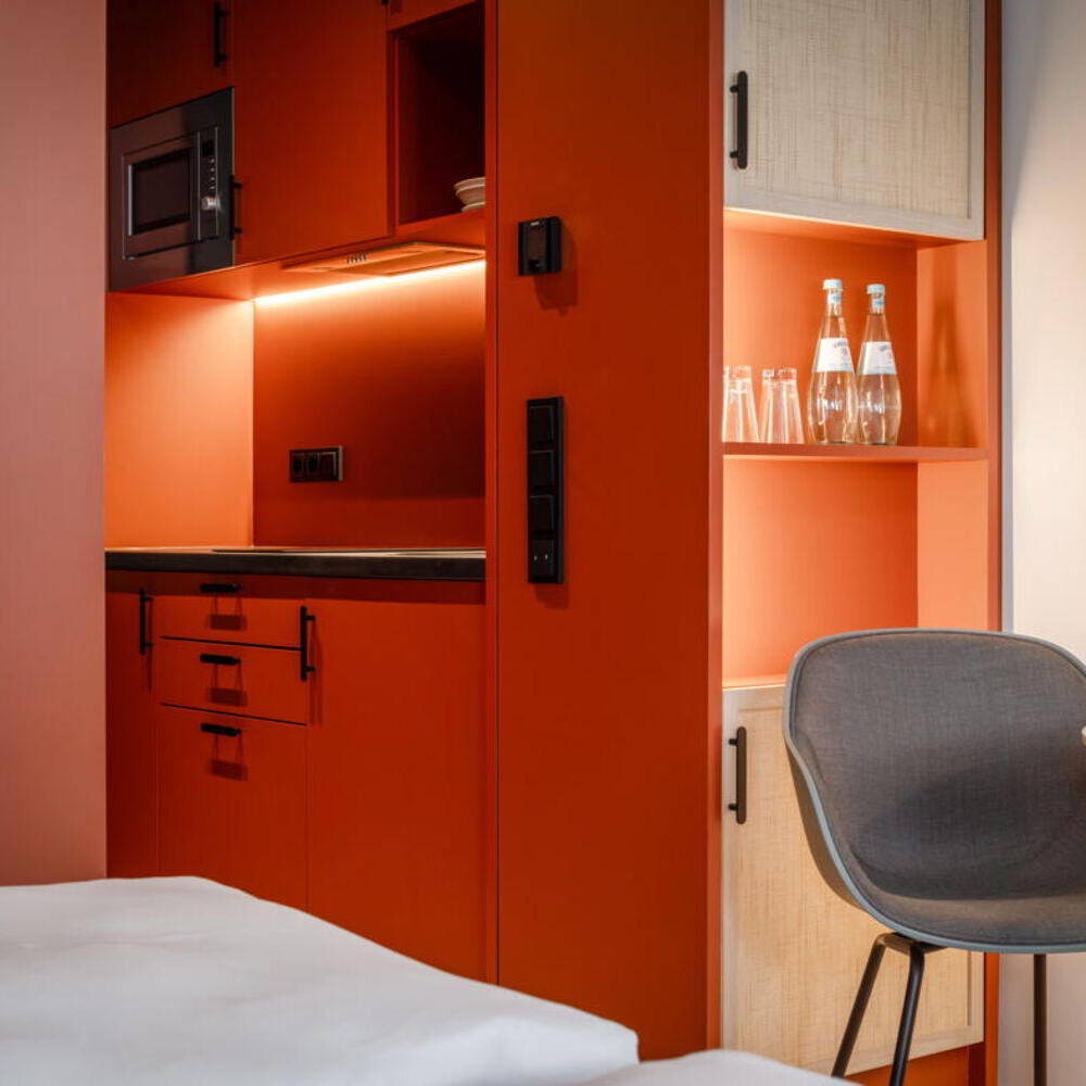 Die 561 Apartments, jeweils mit Kitchenette und eigenem Bad ausgestattet, orientieren sich an den Standards eines gehobenen Hotels, ohne dabei auf Individualität zu verzichten. Als durchgängiges Gestaltungskonzept prägt das Thema „Dschungel“ das moderne, farbenfrohe und lifestyle-orientierte Interieur. Das Interieur zeichnet sich durch warme Materialien, klare Linien und eine reduzierte Farbpalette aus, wodurch die Idee unterstützt wird, dass temporäres Wohnen ein schöner und persönlicher Rückzugsort sein kann. Kräftige Farben wie Rot, Grün, Gewürztöne und Gelb sorgen für exotische Akzente. Verspielte Gestaltungselemente wie ein farbiges Fliesenmosaik an den Aufzugslobbys, hölzerne Shutter sowie filigrane, zweifarbige Dreiecks-Lamellen als Wandverkleidung unterstreichen das besondere Ambiente. Auch bei der Auswahl der Möbel für innen und außen sowie der Oberflächen hatte das Münchner Büro kreative Ideen: In den Serviced-Apartments bildet eine rot lackierte Holzbox – mit integrierter Mini-Küche und Bad – den markanten Eingangsbereich.