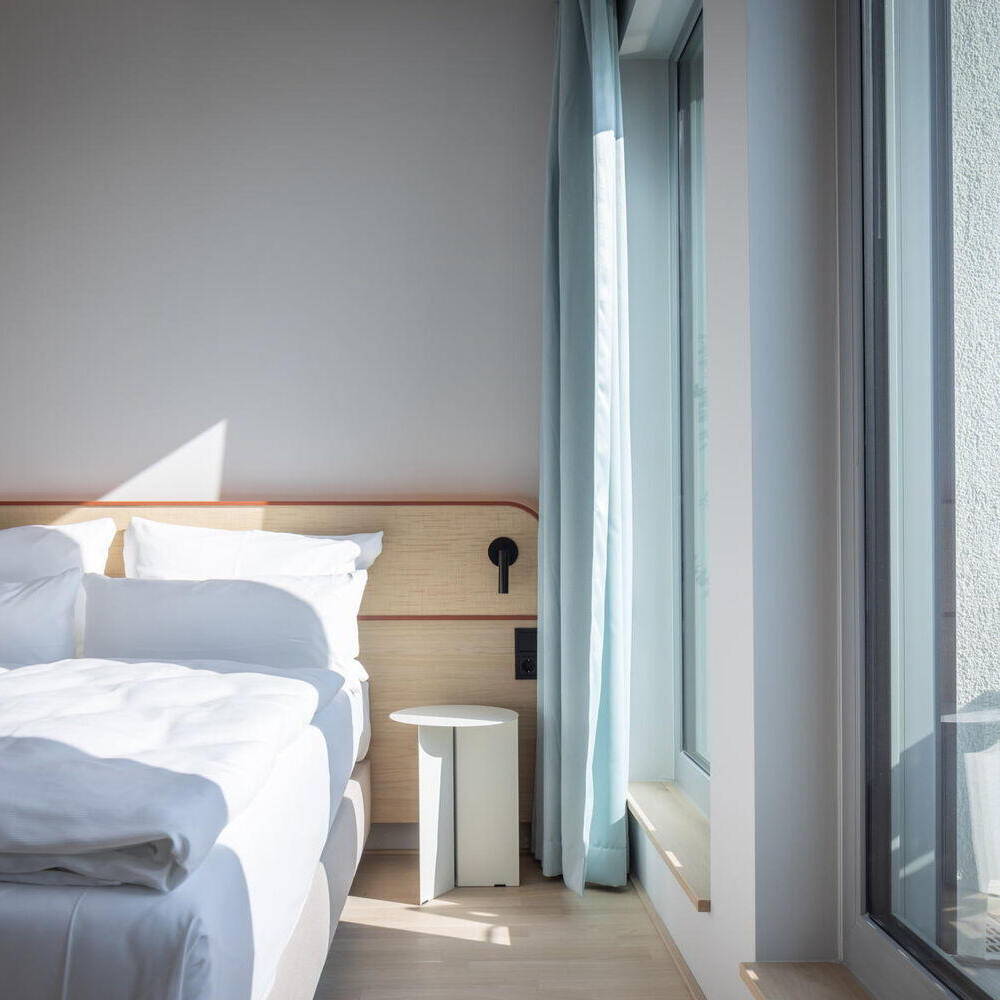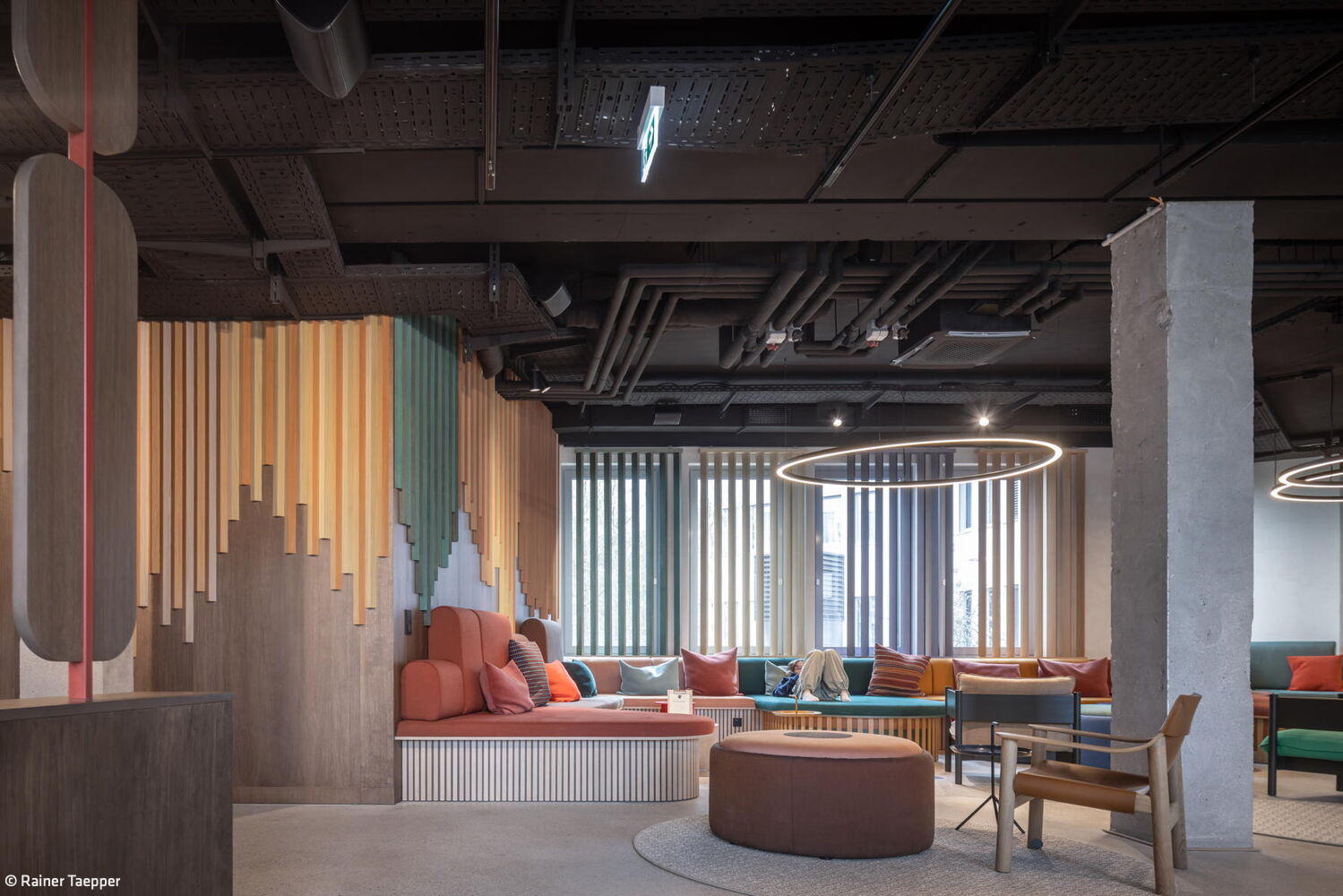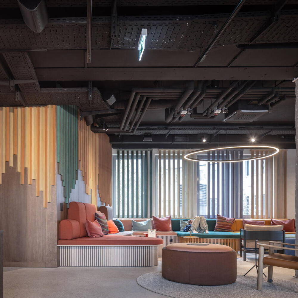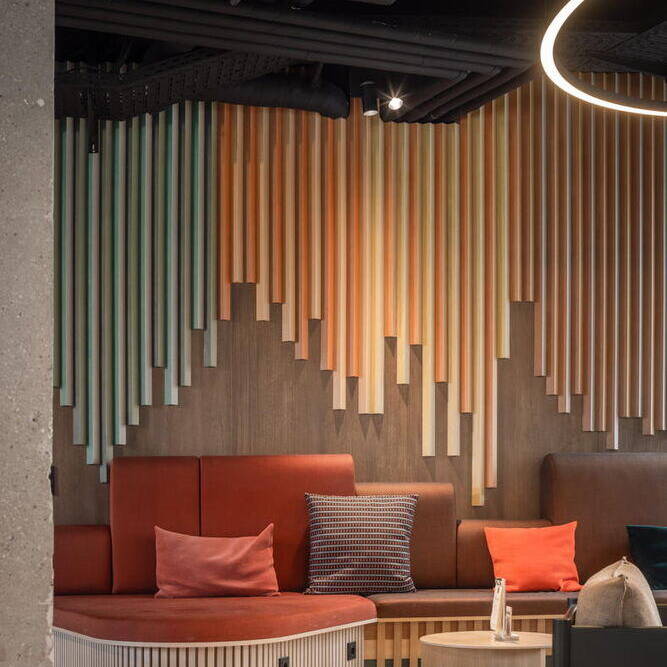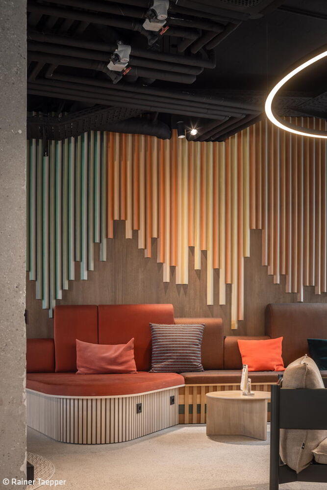 Die in Grüntönen gehaltenen Flure orientieren sich am achteckigen Grundriss der Gebäude und unterstützen durch einen Farbwechsel alle 90 Grad die Orientierung. Im Erdgeschoss des mittleren Hotelturms sowie im verbindenden Untergeschoss der beiden Türme befinden sich sämtliche öffentlichen Bereiche – mit neuen Grundrissen, die das Architekturbüro entworfen hat: Deli, Lounges, Außenterrassen, Self-Check-in, Wasch-Lounges sowie Räume für Massage, Yoga und Fitness. Dank der zweiseitigen Belichtung über Außen- und Innenhoffassaden entsteht in den lichtdurchfluteten Räumen ein direkter Bezug zu den gestalteten Außenbereichen.