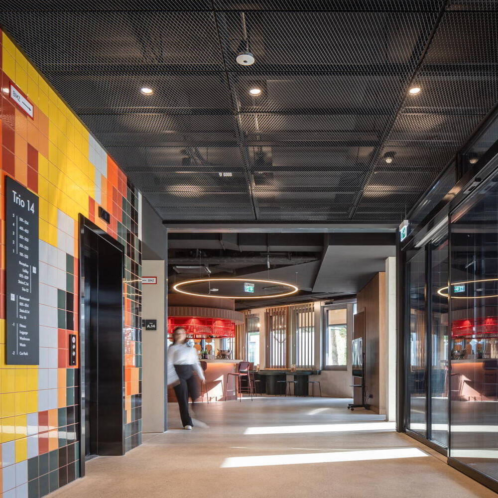 Zwischen Isarauen, Fernsehstudios, großen Unternehmen und urbanem Flair erhebt sich im Unterföhringer Gewerbegebiet ein altes und zugleich neues architektonisches Landmark: das TRI.O Boardinghaus. Die drei oktagonförmigen großen Baukörper waren 1992 unter dem Namen „Oktavian“ als Büroimmobilie errichtet worden. Nun haben sie ein Remake erfahren: Während der nördliche Turm weiterhin für die Office-Nutzung bestehen bleibt, hat die Eigentümerin Grundkontor mit ihrer Objektgesellschaft PG Münchner Straße zwei Türme durch das Münchner Architekturbüro Olufemi Moser in ein Boarding House samt Hotel umgestalten lassen. Das Projekt reagiert auf die wachsende Nachfrage nach temporärem Wohnen in der Metropolregion München und zeigt beispielhaft, wie Wohnen auf Zeit zu einem wundervollen Ort der Begegnung, der Ruhe und des Ankommens werden kann.