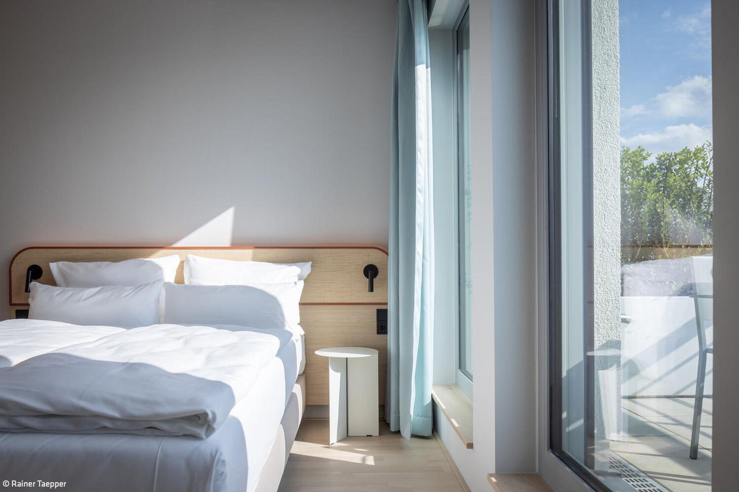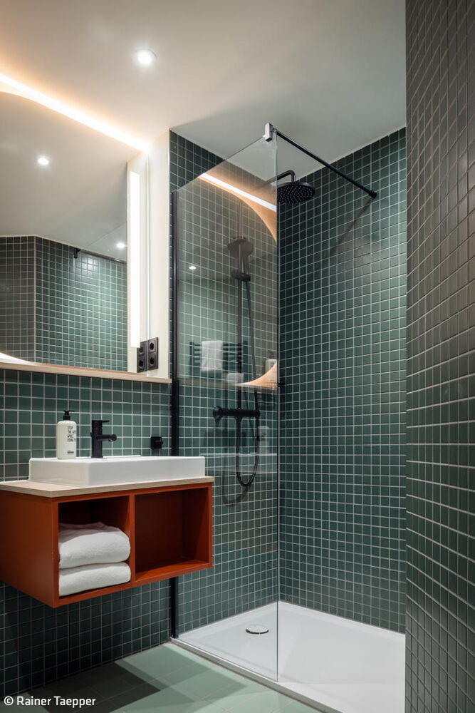 Die in Grüntönen gehaltenen Flure orientieren sich am achteckigen Grundriss der Gebäude und unterstützen durch einen Farbwechsel alle 90 Grad die Orientierung. Im Erdgeschoss des mittleren Hotelturms sowie im verbindenden Untergeschoss der beiden Türme befinden sich sämtliche öffentlichen Bereiche – mit neuen Grundrissen, die das Architekturbüro entworfen hat: Deli, Lounges, Außenterrassen, Self-Check-in, Wasch-Lounges sowie Räume für Massage, Yoga und Fitness. Dank der zweiseitigen Belichtung über Außen- und Innenhoffassaden entsteht in den lichtdurchfluteten Räumen ein direkter Bezug zu den gestalteten Außenbereichen.