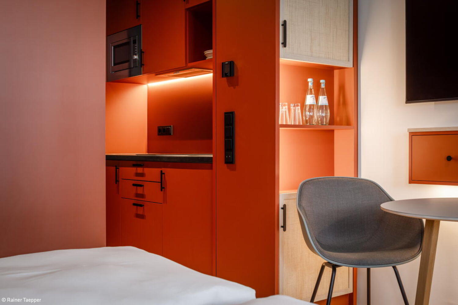 Die 561 Apartments, jeweils mit Kitchenette und eigenem Bad ausgestattet, orientieren sich an den Standards eines gehobenen Hotels, ohne dabei auf Individualität zu verzichten. Als durchgängiges Gestaltungskonzept prägt das Thema „Dschungel“ das moderne, farbenfrohe und lifestyle-orientierte Interieur. Das Interieur zeichnet sich durch warme Materialien, klare Linien und eine reduzierte Farbpalette aus, wodurch die Idee unterstützt wird, dass temporäres Wohnen ein schöner und persönlicher Rückzugsort sein kann. Kräftige Farben wie Rot, Grün, Gewürztöne und Gelb sorgen für exotische Akzente. Verspielte Gestaltungselemente wie ein farbiges Fliesenmosaik an den Aufzugslobbys, hölzerne Shutter sowie filigrane, zweifarbige Dreiecks-Lamellen als Wandverkleidung unterstreichen das besondere Ambiente. Auch bei der Auswahl der Möbel für innen und außen sowie der Oberflächen hatte das Münchner Büro kreative Ideen: In den Serviced-Apartments bildet eine rot lackierte Holzbox – mit integrierter Mini-Küche und Bad – den markanten Eingangsbereich.