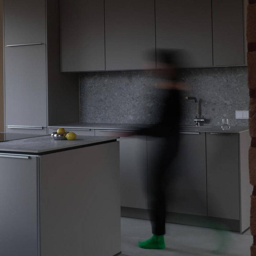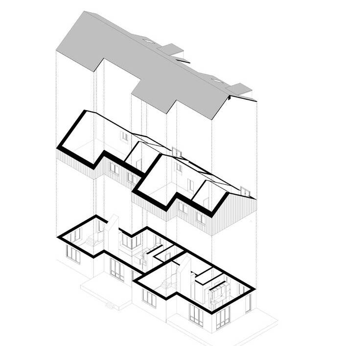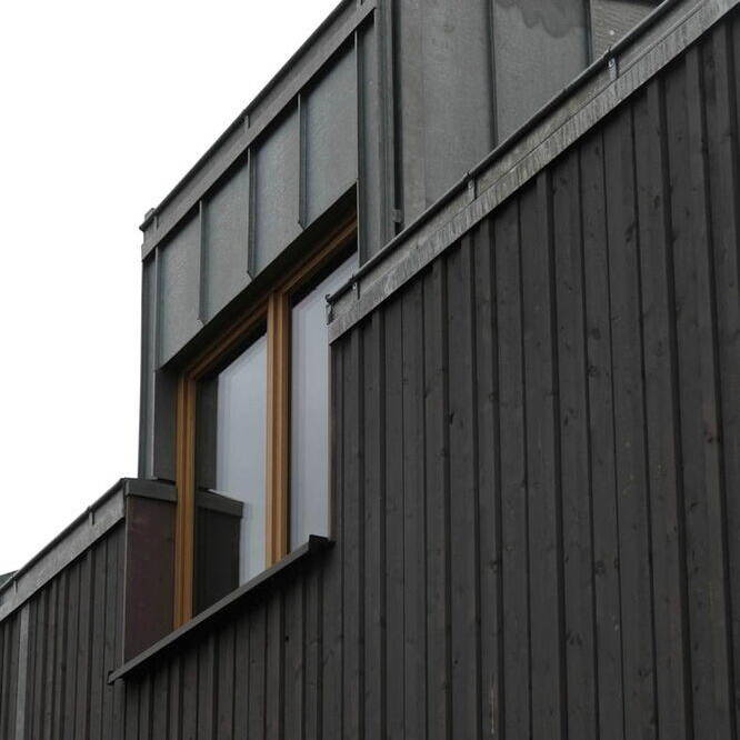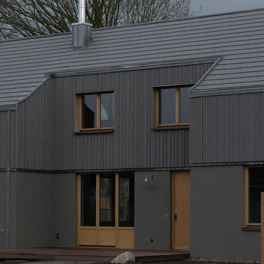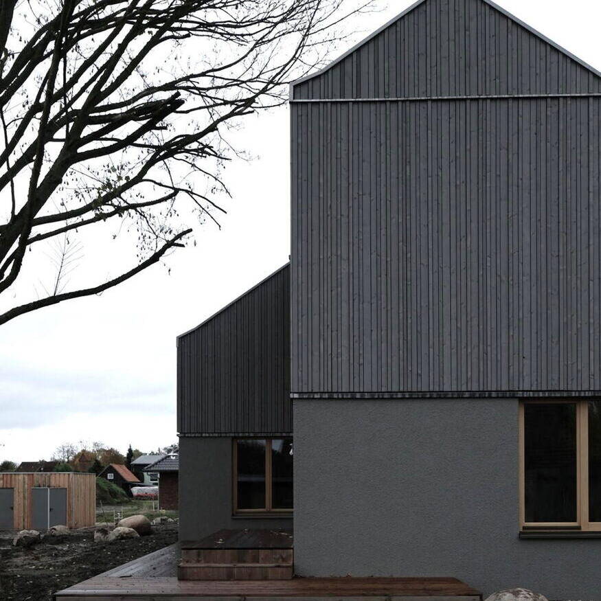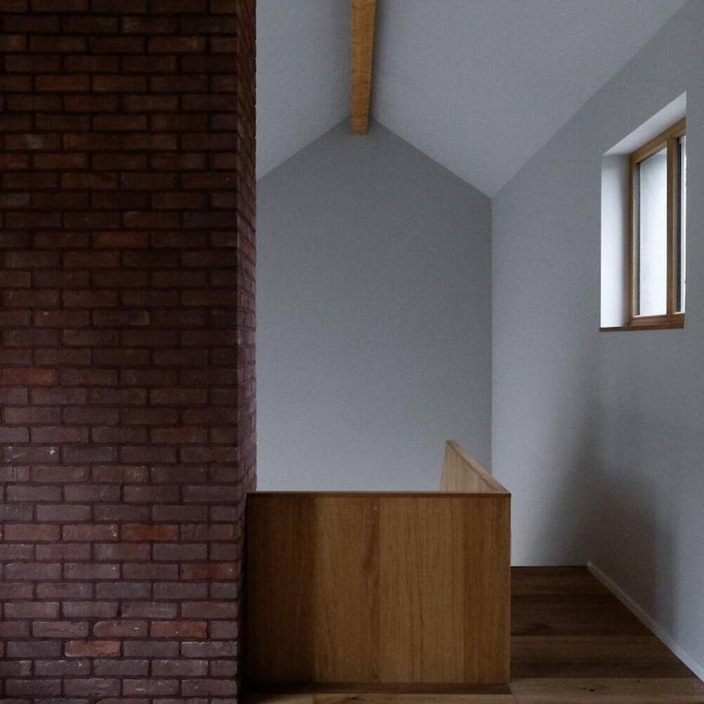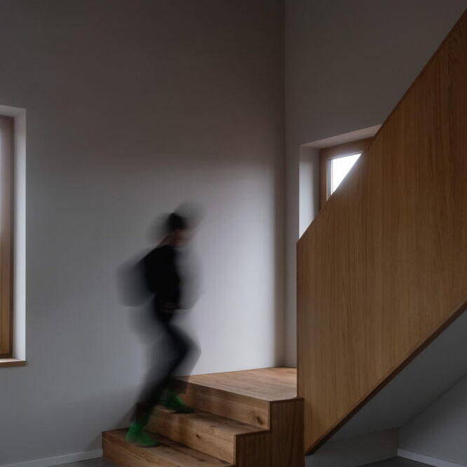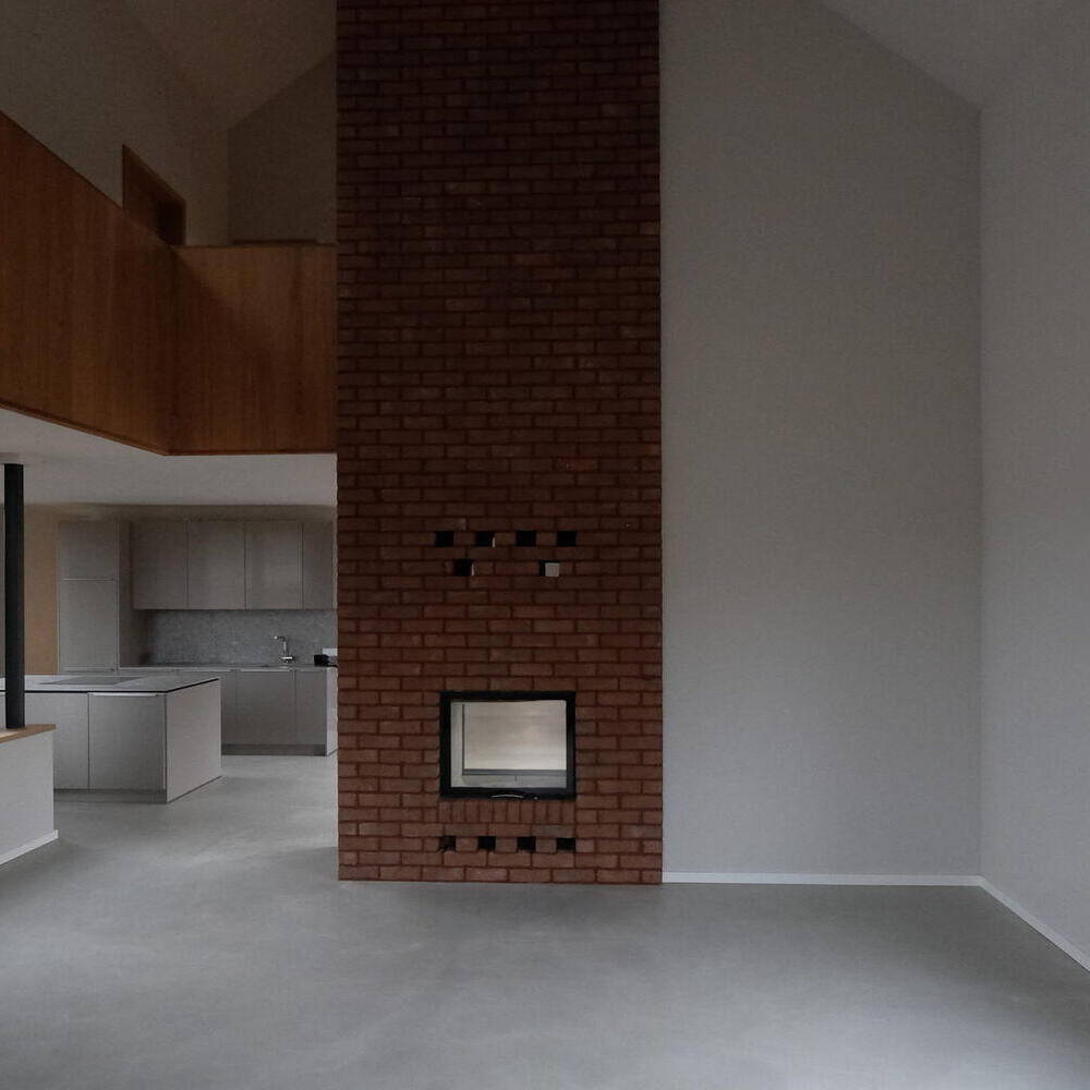 Inmitten dieser idyllischen Landschaft, umgeben von mächtigen Ahornbäumen und sanften Hügeln, ist auf einem 835 m² großen Grundstück dieses Doppelhaus entstanden – die Eulenburg. Das Konzept von Studio Labs übersetzt regionale Bauweisen und Materialien in eine zeitgemäße, reduzierte Architektursprache. Form und Proportionen leiten sich von einer traditionellen Scheune ab, die sich früher auf diesem Gelände befand. So greift der minimalistische Neubau die ursprüngliche Dorfstruktur auf und fügt sich harmonisch ein. Durch die offene Gestaltung und den fließenden Übergang von Innen und Außen entsteht ein geschützter Rückzugsort, der vertraut wirkt und dennoch modern ist. Jede Einheit umfasst eine großzügige Wohnküche mit offenem Kamin und Gartenzugang im Erdgeschoss sowie zwei Schlafzimmer mit Bädern und einen Arbeitsbereich auf der Galerie. Ergänzt wird das Raumkonzept durch einen „Schuppen“, der als Sauna dient. Besonderes Augenmerk legte das Team auf die Ausrichtung des Gebäudes, die auf die spezifischen Qualitäten des Grundstücks reagiert: Durch gezielte Einschnitte nach Norden und Süden, die zugleich Sichtschutz und Verschattung bieten, entsteht sowohl ein sensibler Dialog zwischen Architektur und Landschaft als auch eine hohe Aufenthaltsqualität und Privatsphäre in den Gärten. Die Fassade kombiniert regional inspirierten Grobputz im Sockelbereich mit einer vertikalen Holzlattung im oberen Bereich, die dem Haus Struktur und Leichtigkeit verleiht. Der warme Farbton der Fenster, Türen, Treppen, Brüstungen und Einbauschränke aus Holz harmoniert mit den weichen Grautönen von Böden, Wänden und Küche, akzentuiert von der lebendigen Struktur des erdig-roten Ziegels des bis in den First reichenden Schornsteins mit dem verglasten Kamin.