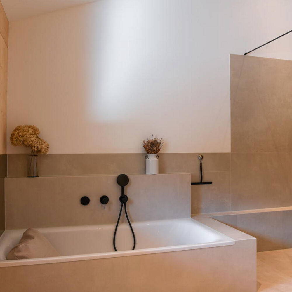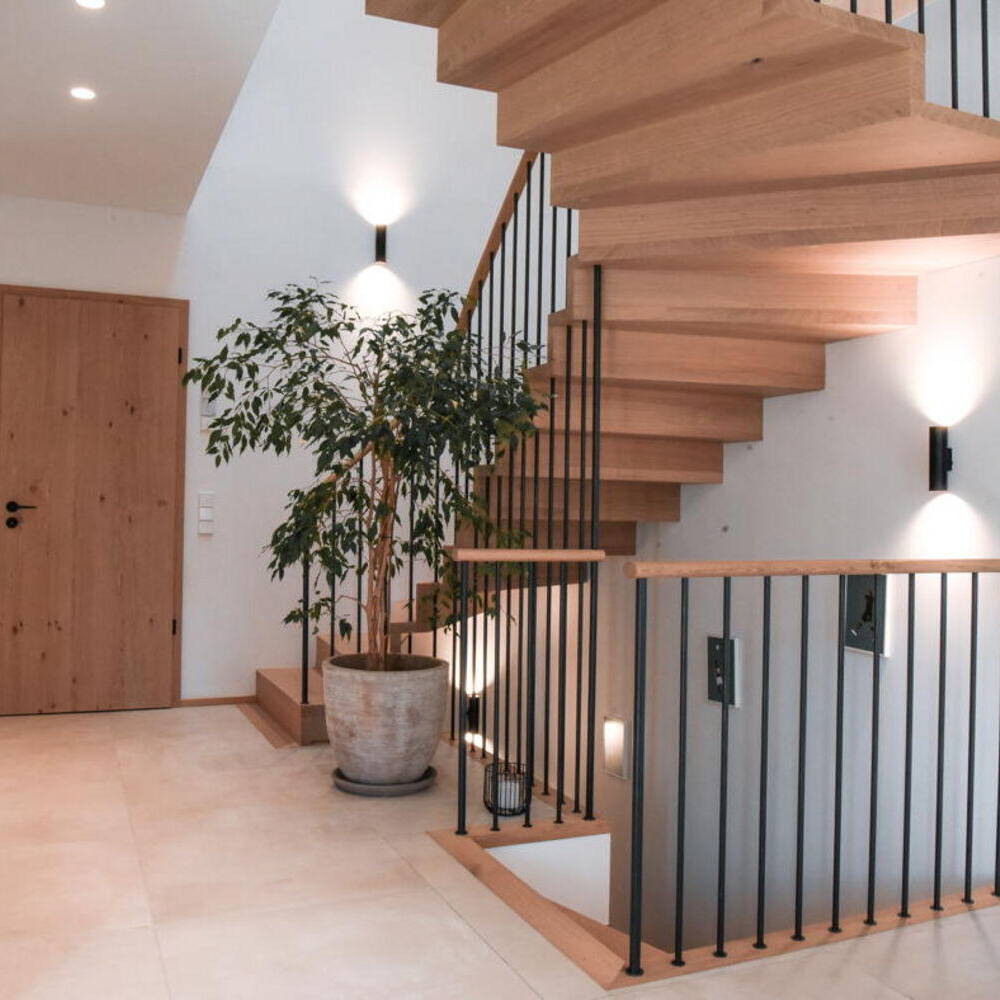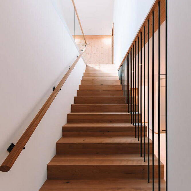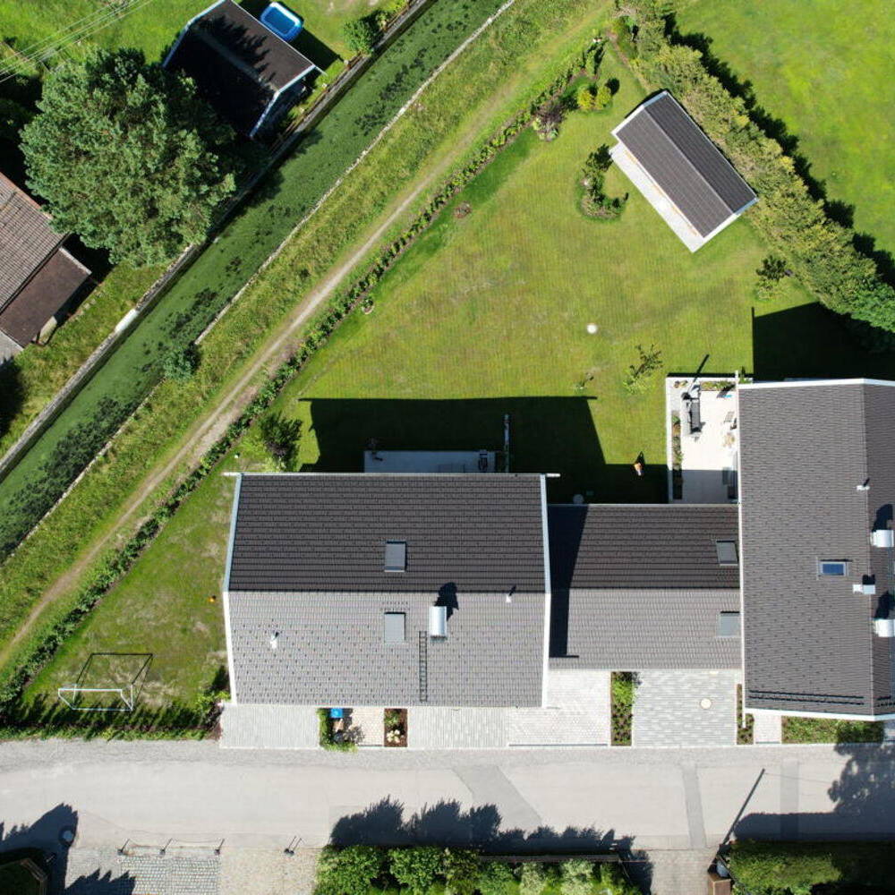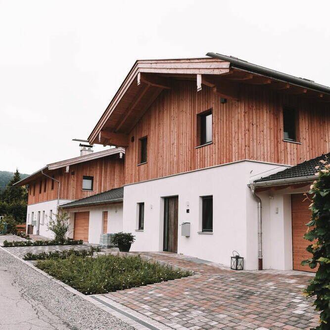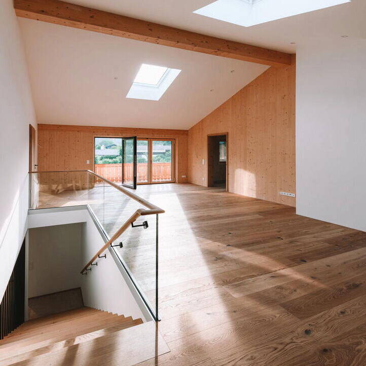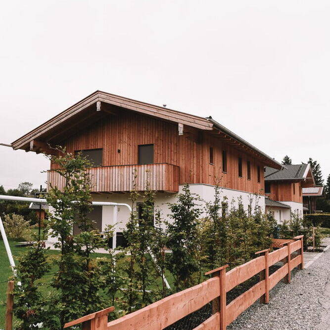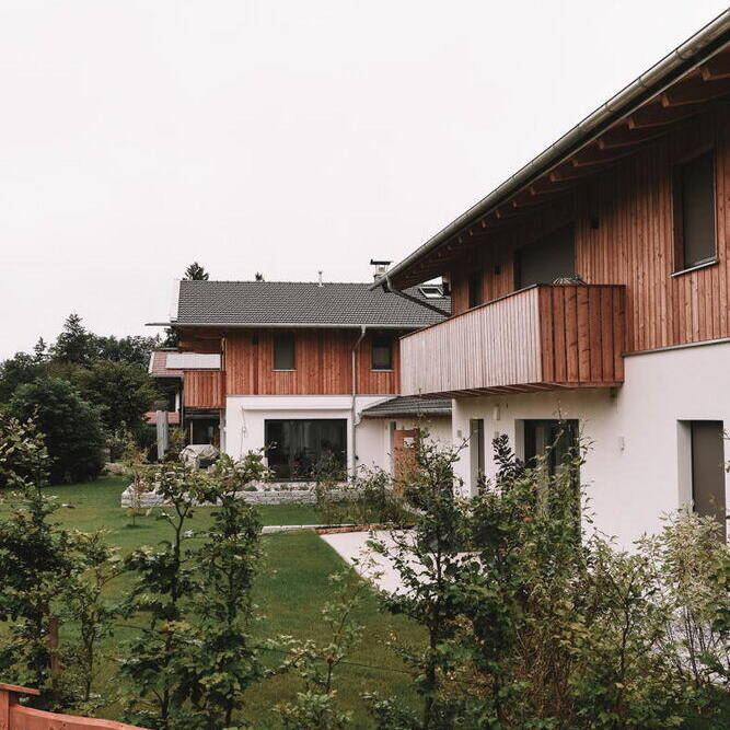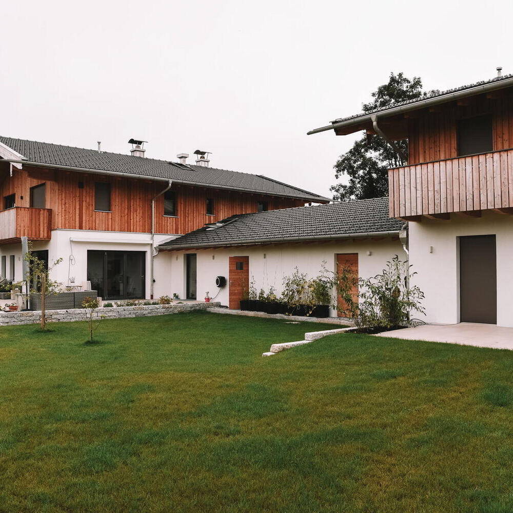 Sabrina Bongartz und ihr Bruder Maximilian Appel lösen bei Bauaufgaben in der Region den Konflikt „traditionell versus Modern“ derart, dass sie im Rahmen der Möglichkeiten eine Neuinterpretation des ländlichen Baustils anstreben. Bei diesem Projekt ging es um den Neubau eines Ensembles bestehend aus einem Einfamilienhaus mit Büro und eines Zweifamilienhauses für langfristiges Mehrgenerationenwohnen. Damit musste der Entwurf so beschaffen sein, dass „über den Tag hinaus“ andere Nutzungen möglich sind, bei gleichzeitiger Beibehaltung der Optik bayerischer Bauernhäuser. Es entstanden zwei zueinander gedrehte Wohnhäuser mit einem Verbindungsbau, der Gemeinschaftsflächen und Privatheit sowie Wohnen und Arbeiten an einem Ort für bis zu drei Familien vereint. Dieser Ansatz war die einzige Chance, eine Nutzung über mehrere Generationen hinaus zu sichern. Das Grundstück gab eine Anordnung der Häuser in einer Reihe von Nord nach Süd vor. „Haus Nord“ ist das Einfamilienhaus mit einem großen Gemeinschaftsbüro, das bei Bedarf in eine Einliegerwohnung umgewandelt werden kann. „Haus Süd“ ist gegenwärtig für den Raumbedarf zweier Familien ausgelegt. Im Erdgeschoss gibt es eine barrierefreie, für rollstuhlgerechte Nutzung vorgerüstete Wohnung und einen Wohn-Ess-Bereich, der zu der zweiten Wohneinheit gehört, die sich über das gesamte Obergeschoss fortsetzt. Bei Bedarf kann das gesamte Haus zu einer Einheit zusammengelegt werden. Eine Pelletheizung in „Haus Nord“ sorgt für Wärme in beiden Häusern. Die Eingänge liegen auf der Ostseite, im Westen schließt sich ein großer gemeinschaftlicher Garten an. Zur Sorgfalt der Planung und der qualitätvollen und nachhaltigen Ausführung der Häuser gehörte auch, der traditionellen Bauweise aus Ziegel und massiver Holzbauweise treu zu bleiben. Hier ist aber die Besonderheit, dass das Obergeschoss in Massivholzbauweise erstellt und dies innen sichtbar belassen wurde. Typisch für die Region wäre Ziegel mit vorgesetzter Verschalung gewesen. Durch eine intensive Grundlagenermittlung war bereits zu Beginn der Planungsphase klar, dass das Grundstück hohes Grundwasser hat und damit eine aufwändige, kosten- und zeitintensive Baugrube nötig war.