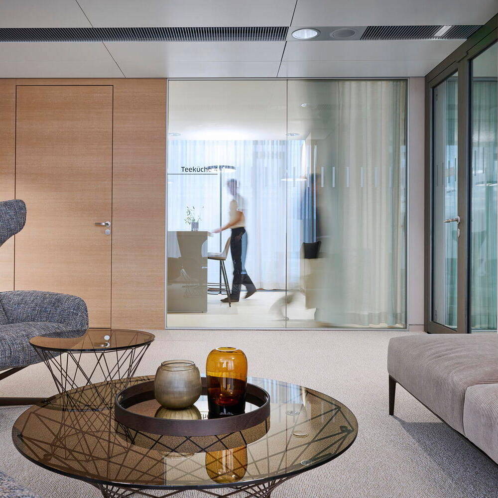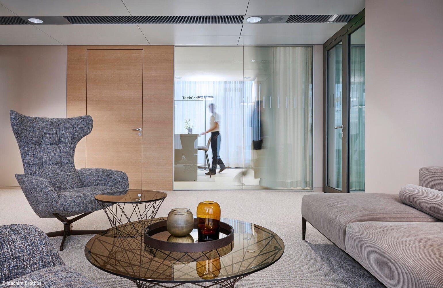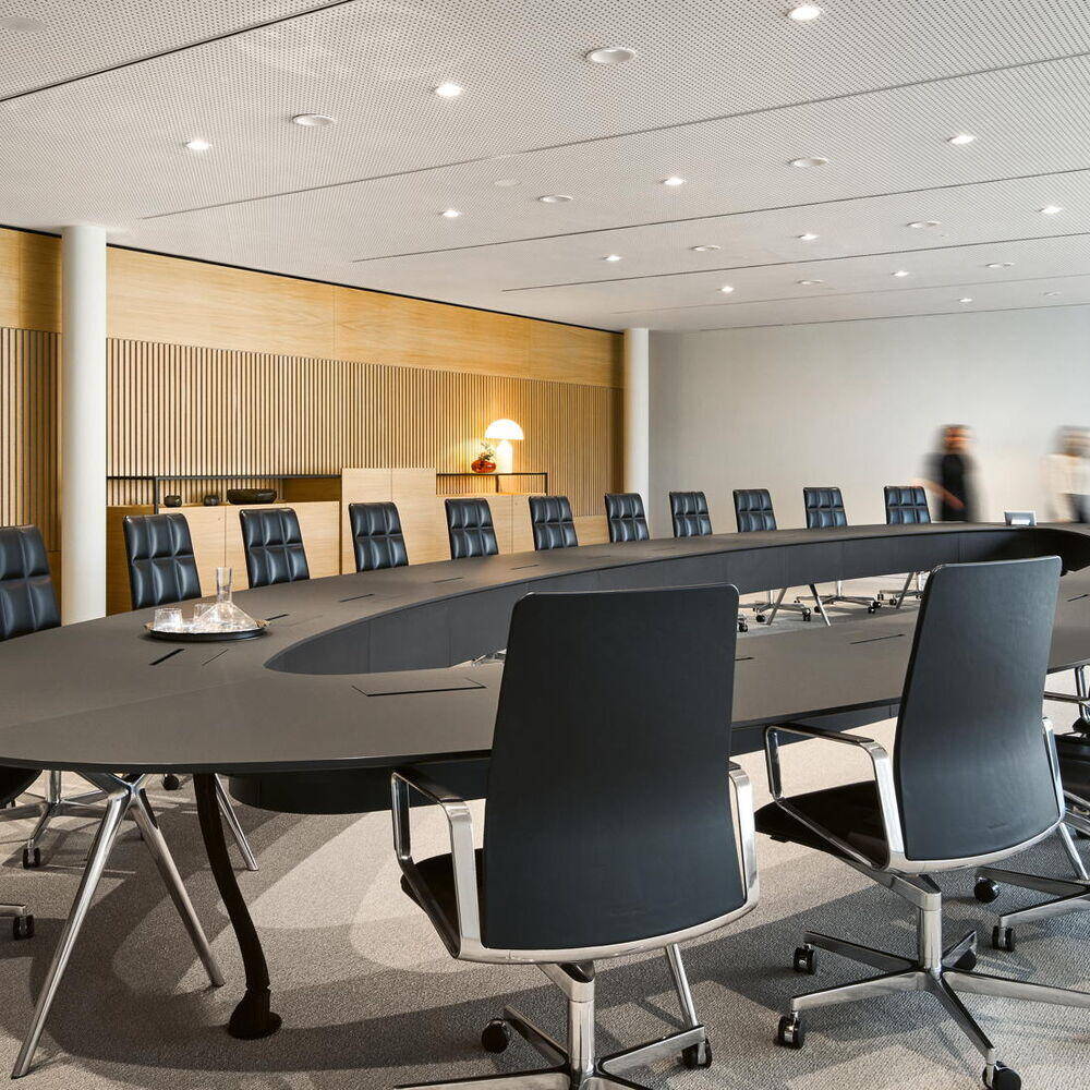 Der Umsetzung, die im laufenden Betrieb und unter Zeitdruck stattfinden musste, ging eine viermonatige Planungsphase voraus, in der die Innenarchitekten ein Konzept entwickelten, das repräsentative, funktionale Räume mit individueller Prägung als Ergebnis hatten. Insgesamt wurden rund 3.200 m² Fläche in ein Arbeitsumfeld verwandelt, das den vielfältigen Ansprüchen der heutigen Arbeitswelt gerecht wird, weil Konzentration, Austausch und diskrete Begegnungen ermöglicht werden. Neben dem großzügigen Empfang mit Sitzbereich sind ein Sitzungssaal für 22 Personen, vier Konferenzräume sowie separate Büroeinheiten die zentralen Elemente. Ergänzt werden sie von modernisierten WC-Einheiten und Teeküchen. Eine planerische Zusatzaufgabe, von den Innenarchitekten flexibel und pragmatisch gelöst, war die Integration einer Gastronomieküche im laufenden Projekt. Auch mit Blick auf eine langfristige Nutzung, die Umgestaltungen zulässt, waren Langlebigkeit und hohe Qualität die oberste Prämisse für das Gestaltungskonzept. Und so prägt eine ansprechende Kombination aus weiß pigmentierter Eiche, schwarzem und weißem Marmor sowie eine fein ausgewählte und abgestimmte Textilpalette in Grau-, Schwarz- und Blautönen das Gesamtbild. Die Formensprache bleibt dabei bewusst zurückhaltend unterstreicht damit die Atmosphäre von Ruhe und Konzentration. Dazu tragen auch die gewählten Sichtachsen, die Lichtführung und die Materialkombinationen bei. Um die Auswahl der Möbel und Oberflächen zu erleichtern und um Entscheidungen greifbar zu machen, entwickelten die Innenarchitekten für die einzelnen Büros individuelle Materialboards und Entwurfsbroschüren. Durch diese Visualisierungen vereinfachten die Innenarchitekten die Orientierung und ermöglichten, individuelle Vorstellungen besser zu konkretisieren. So konnte eine Gestaltung entstehen, die persönliche Ansprüche berücksichtigt, ohne die räumliche Gesamtidee aus dem Blick zu verlieren. Mit großflächigen Monitoren, akustisch wirksamen Wandflächen sowie High-End-Kamera- und Lautsprechersystemen ist die Etage auch technisch auf dem neuesten Stand – und die Grundlagen sind bereits gelegt für die spätere Nutzung als Konferenzzentrum. Insgesamt konnte eine funktionale, hochwertige und flexible Büroetage realisiert werden – und damit ein Projekt, das zeigt, wie sich gegenwärtige und künftige Nutzungen auf hohem gestalterischen Niveau verbinden lassen.