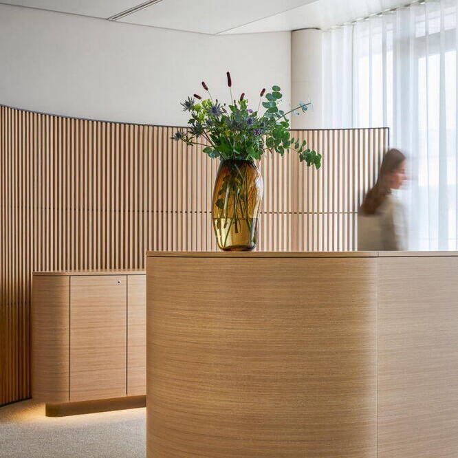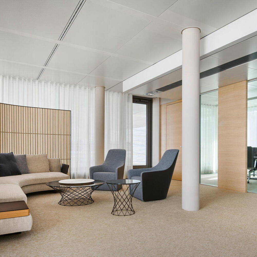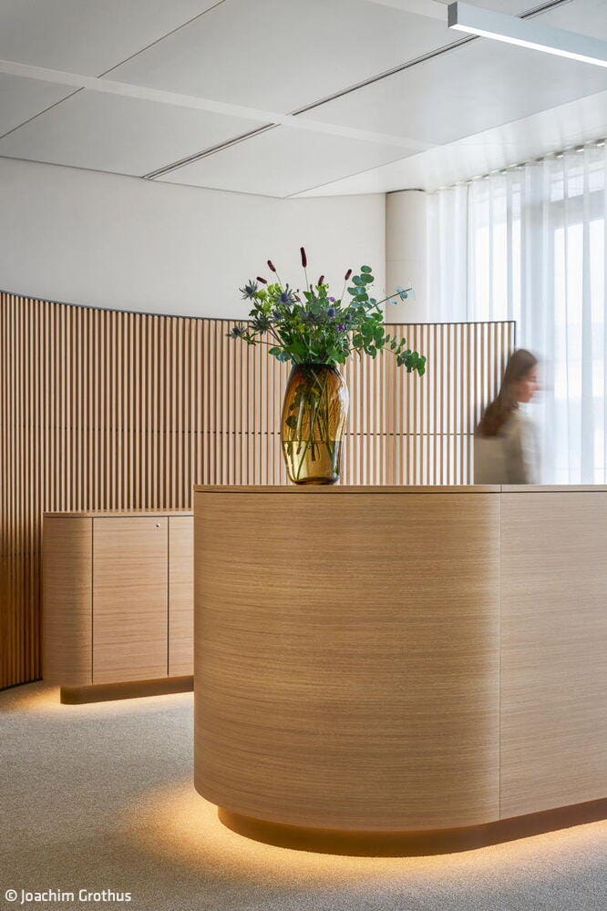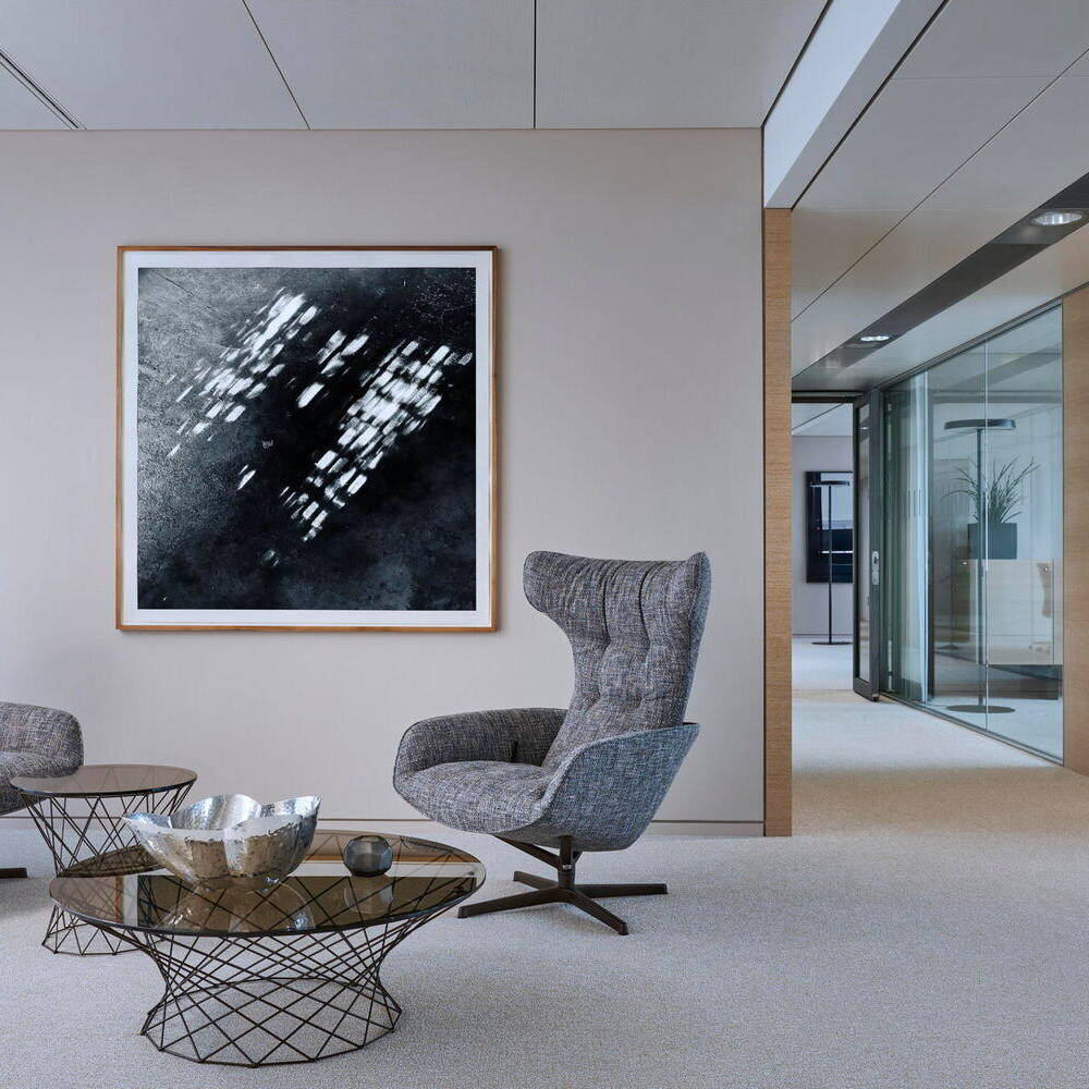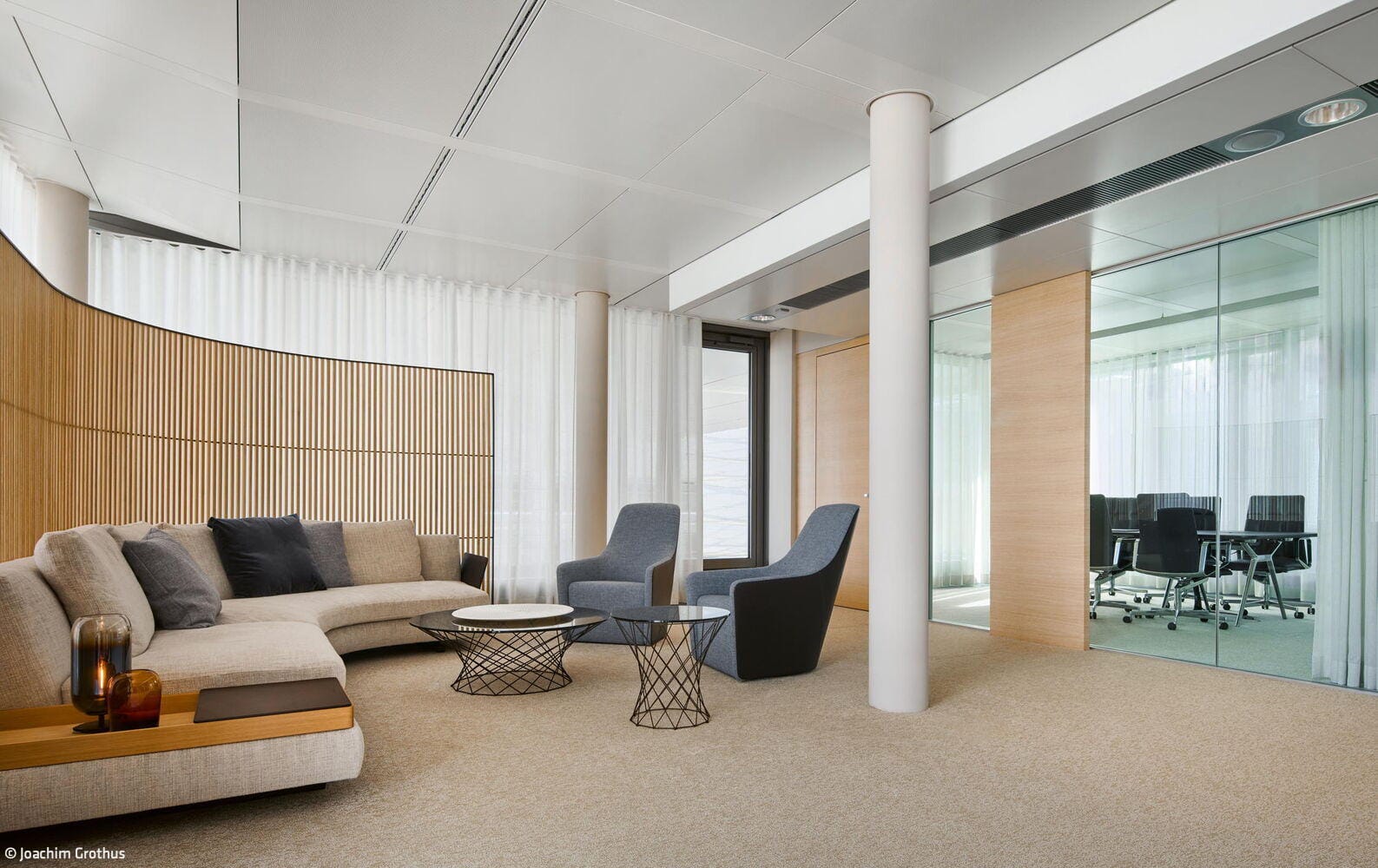 Der Umsetzung, die im laufenden Betrieb und unter Zeitdruck stattfinden musste, ging eine viermonatige Planungsphase voraus, in der die Innenarchitekten ein Konzept entwickelten, das repräsentative, funktionale Räume mit individueller Prägung als Ergebnis hatten. Insgesamt wurden rund 3.200 m² Fläche in ein Arbeitsumfeld verwandelt, das den vielfältigen Ansprüchen der heutigen Arbeitswelt gerecht wird, weil Konzentration, Austausch und diskrete Begegnungen ermöglicht werden. Neben dem großzügigen Empfang mit Sitzbereich sind ein Sitzungssaal für 22 Personen, vier Konferenzräume sowie separate Büroeinheiten die zentralen Elemente. Ergänzt werden sie von modernisierten WC-Einheiten und Teeküchen. Eine planerische Zusatzaufgabe, von den Innenarchitekten flexibel und pragmatisch gelöst, war die Integration einer Gastronomieküche im laufenden Projekt. Auch mit Blick auf eine langfristige Nutzung, die Umgestaltungen zulässt, waren Langlebigkeit und hohe Qualität die oberste Prämisse für das Gestaltungskonzept. Und so prägt eine ansprechende Kombination aus weiß pigmentierter Eiche, schwarzem und weißem Marmor sowie eine fein ausgewählte und abgestimmte Textilpalette in Grau-, Schwarz- und Blautönen das Gesamtbild. Die Formensprache bleibt dabei bewusst zurückhaltend unterstreicht damit die Atmosphäre von Ruhe und Konzentration. Dazu tragen auch die gewählten Sichtachsen, die Lichtführung und die Materialkombinationen bei. Um die Auswahl der Möbel und Oberflächen zu erleichtern und um Entscheidungen greifbar zu machen, entwickelten die Innenarchitekten für die einzelnen Büros individuelle Materialboards und Entwurfsbroschüren. Durch diese Visualisierungen vereinfachten die Innenarchitekten die Orientierung und ermöglichten, individuelle Vorstellungen besser zu konkretisieren. So konnte eine Gestaltung entstehen, die persönliche Ansprüche berücksichtigt, ohne die räumliche Gesamtidee aus dem Blick zu verlieren. Mit großflächigen Monitoren, akustisch wirksamen Wandflächen sowie High-End-Kamera- und Lautsprechersystemen ist die Etage auch technisch auf dem neuesten Stand – und die Grundlagen sind bereits gelegt für die spätere Nutzung als Konferenzzentrum. Insgesamt konnte eine funktionale, hochwertige und flexible Büroetage realisiert werden – und damit ein Projekt, das zeigt, wie sich gegenwärtige und künftige Nutzungen auf hohem gestalterischen Niveau verbinden lassen.