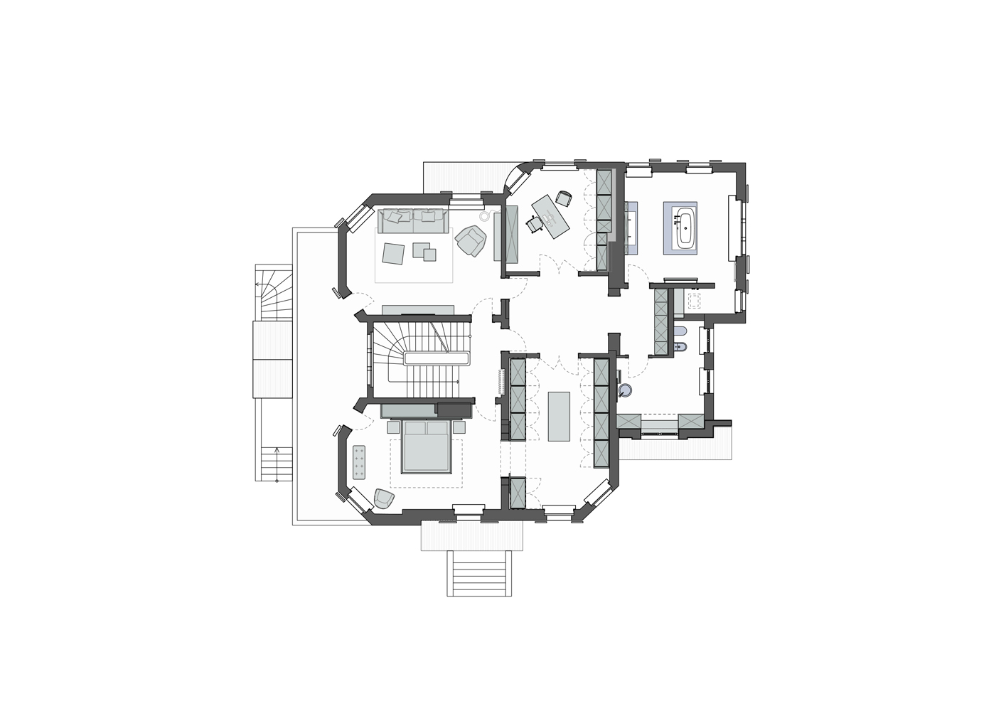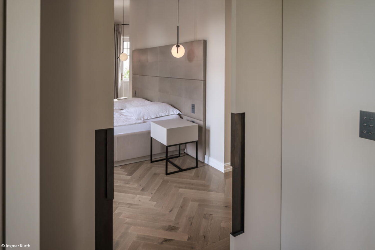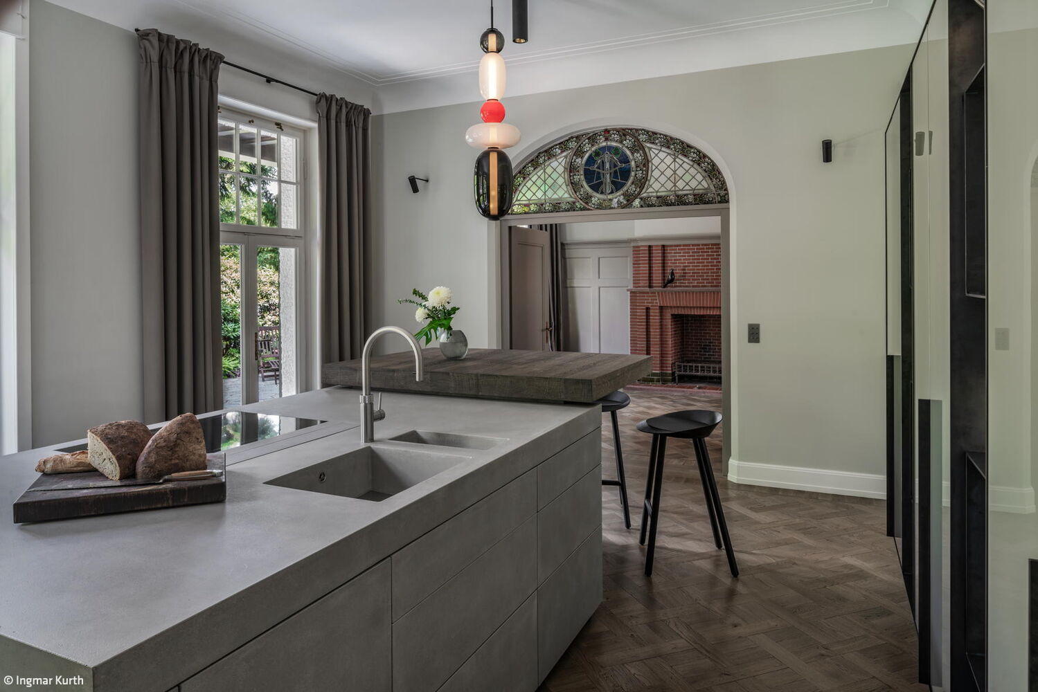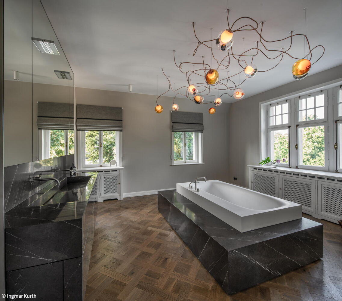 Die Vision der Innenarchitekten war klar: Die Seele des Hauses sollte bewahrt, sein Raumprogramm aber behutsam transformiert werden. So wurden Türen, Fenster, Stuckelemente und die historische Treppe restauriert oder originalgetreu nachgebildet. Das Entrée mit dem wieder freigelegten Kamin zeigt heute das rote Klinkermauerwerk, das Jahrzehnte unter Farbschichten verborgen war. Daran anschließend entfaltet sich ein repräsentatives Raumgefüge: Bibliothek, Esszimmer, Kaminzimmer und Küche reihen sich aneinander, verbunden durch präzise gesetzte Blickachsen. Im zentralen Wohnraum fällt rechts die Kochinsel ins Auge, eingerahmt von historischen Bildmotiven; links öffnet sich der Durchgang ins Esszimmer, wo der große Tisch wie ein ruhender Pol wirkt.Die größte Herausforderung bestand darin, modernste Technik zu integrieren, die man nicht sieht, aber spürt. So verbirgt sich beispielsweise die Klimaanlage des Schlafzimmers unscheinbar hinter einer lederbezogenen Bettrückwand mit abnehmbaren Polsterkassetten. Auch die Lichtlösungen, Einbaumöbel von Studio Holzinger und ein abgestimmtes Farbkonzept verschmelzen Historismus und Moderne zu einem harmonischen Ganzen. Die Materialwahl trägt ebenfalls zu dieser Verbindung bei: Eiche-Tafelparkett trifft auf Naturstein mit deutlich sichtbaren Sedimentstrukturen, während Farbakzente – tintenblau in der Bibliothek, fuchsia hinter dem Regal, tiefrot in einer Leuchte über der Kochinsel – den Räumen eine zeitgenössische Handschrift verleihen. Oder auch das Bad: Die Badewanne aus Mineralwerkstoff ist zur Hälfte in ein Podest aus dunkelgrauem Naturstein eingelassen. Weiße Calcit-Adern durchziehen den Stein und lassen ihn auf der Vorderseite des Podests wie einen massiven Gesteinsblock erscheinen.
