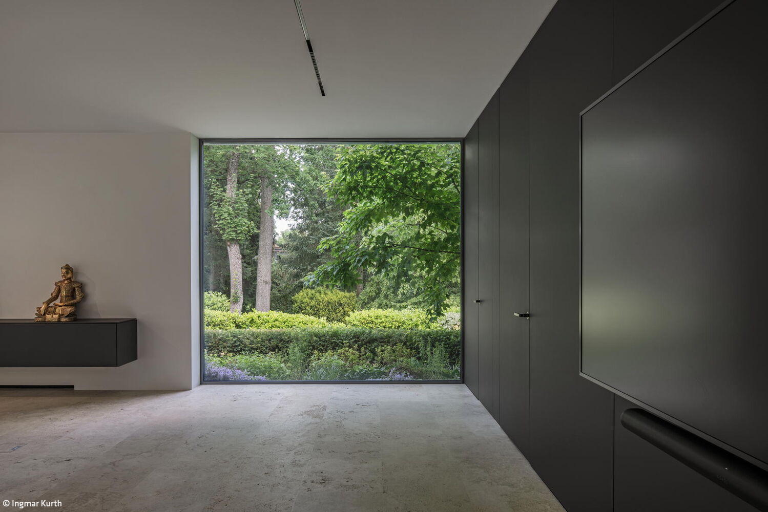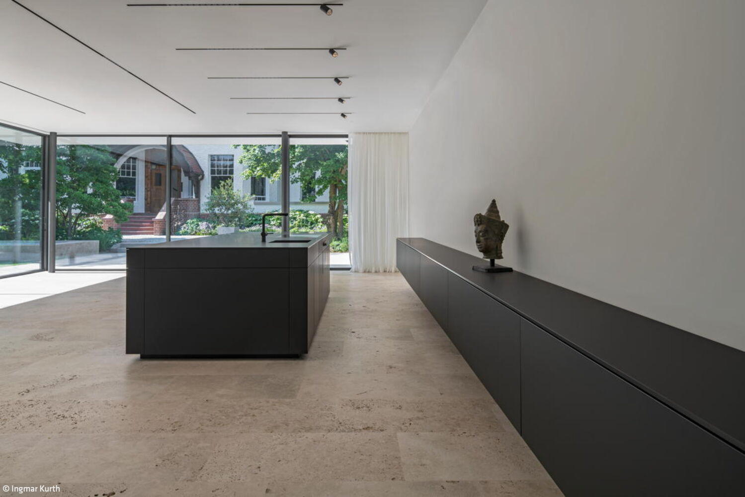 Auch der Garten erhielt eine neue Rolle. Ein zweiseitig verglaster Pavillon mit Flachdach erweitert das Ensemble – puristisch, fast skulptural (auch hier Bauleitung: Architekt Joachim Strauss, Dreieich). Er dient den Bewohner:innen als Ausstellungsfläche für ihre alten Fahrzeuge, kann aber ebenso als Eventraum genutzt werden. Hier kontrastieren glatte, graphitfarbene Oberflächen mit dem offenporigen Travertinboden, dessen Platten ohne Mörtelfugen verlegt wurden. Ein stiller Dialog zwischen Natur und Konstruktion, Vergangenheit und Zukunft. Mit einer Wohnfläche von 685 m² auf insgesamt 1.142 m² Gesamtfläche entstand so ein Familienhaus, das Großzügigkeit und Intimität zugleich ermöglicht. Der historische Charme bleibt spürbar, ist jedoch von einer klaren Haltung zur Gegenwart durchdrungen. Das Haus zeigt, wie sensibel restaurierte Architektur zur Bühne eines modernen Lebensgefühls wird – ohne die eigene Geschichte zu verleugnen.