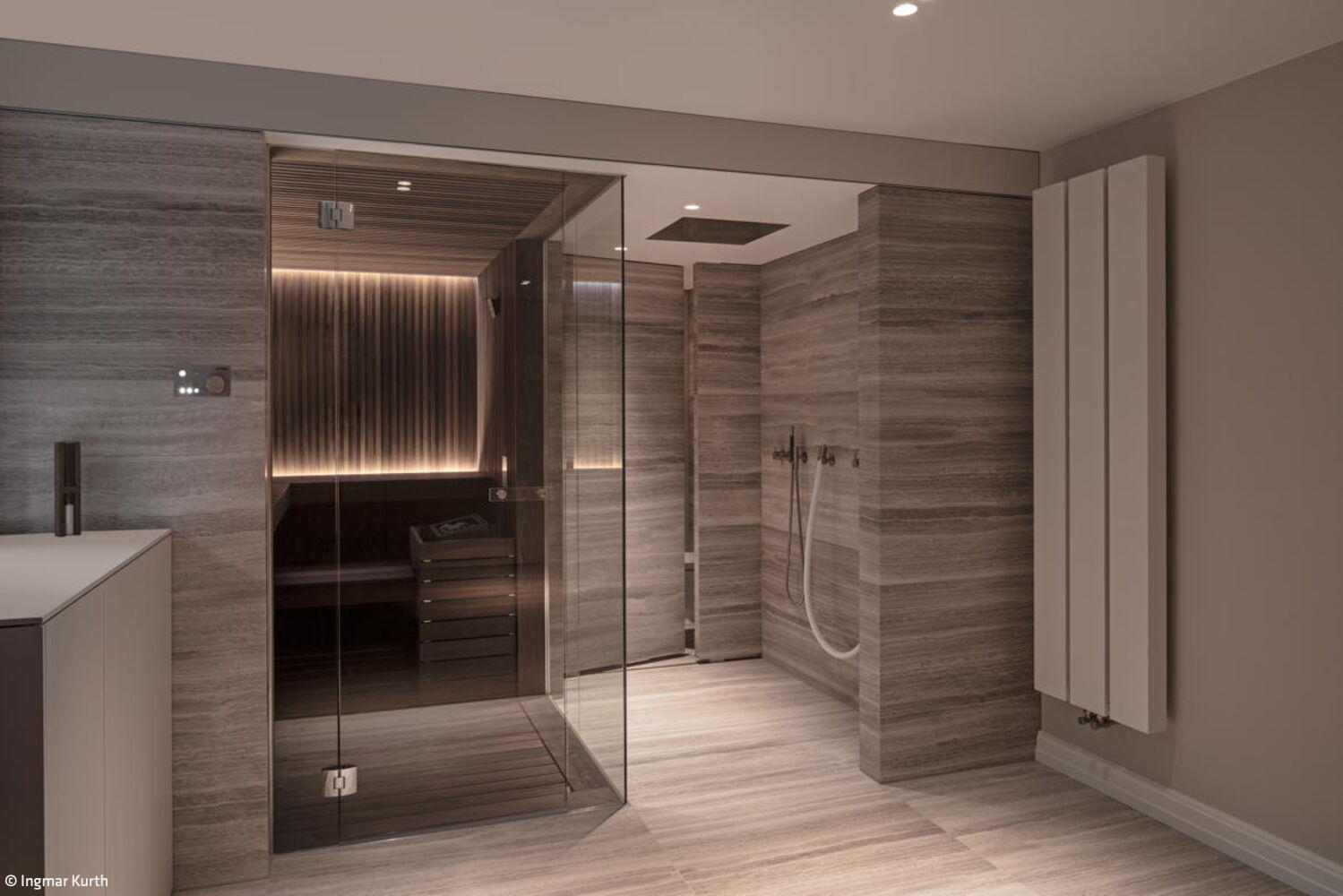 Der vielleicht entscheidendste Eingriff fand dort statt, wo man ihn von außen nicht vermutet: im Keller. Ursprünglich niedrig und kaum nutzbar, wurden die Böden um 30 Zentimeter abgesenkt. Aus Abstell- und Lagerräumen wurden so Wohnzonen. Heute beherbergt das Untergeschoss einen Wellnessbereich, in dem Natursteinwände und geschickt kaschierte Türen den Eindruck einer zeitlosen Ruheoase erzeugen. Für die Familie bedeutet das mehr Wohnfläche, mehr Raum für Rückzug, mehr Großzügigkeit im Alltag.