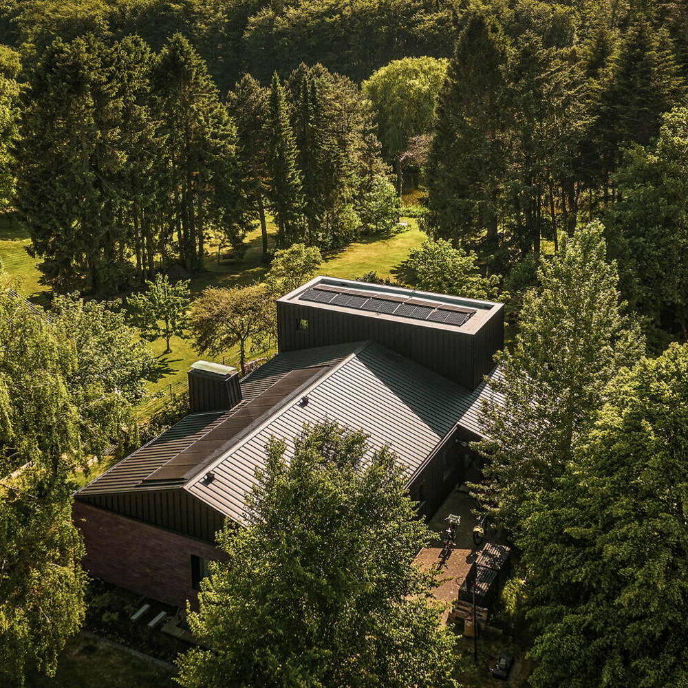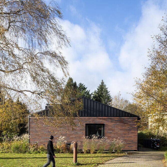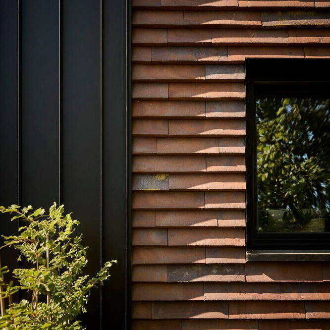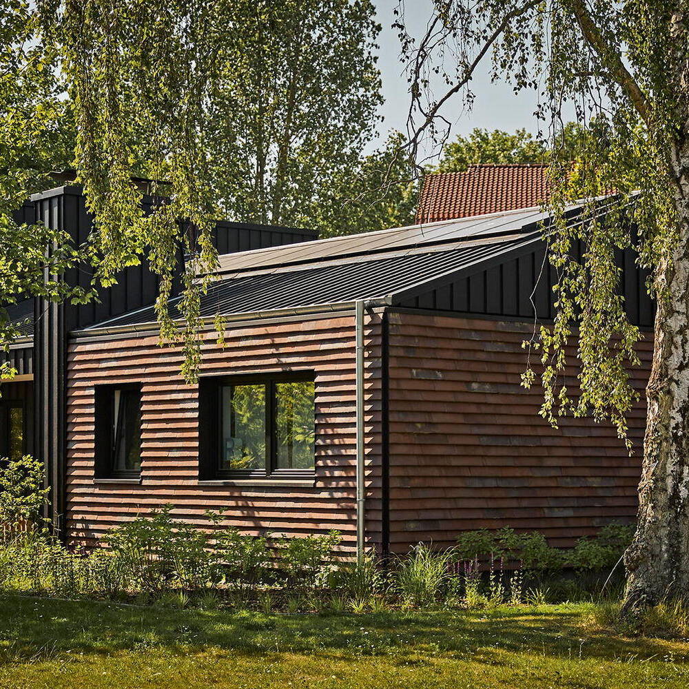Leitidee des Architekten war, das eingeschossige Siedlungshaus für die heutigen Bedürfnisse umzubauen und durch einen rückwärtigen zweigeschossigen Anbau in Form eines Querriegels zu erweitern. Im Inneren entstand durch die Zusammenlegung von ehemaliger Küche und Esszimmer eine große Wohnküche als Mittelpunkt des Familienlebens. Bestand und Erweiterung ergänzen einander harmonisch und machen die Bäume sowie die wunderschöne Aussicht auf den See von überall erlebbar. Das jetzige Haus bewahrt die Tradition des Siedlungshauses und inszeniert den Außenraum auf moderne Weise. Zusammengehalten wird das Ganze von einer hochwertigen Hülle, die sich zurückhaltend, aber selbstbewusst präsentiert. Die gleichermaßen ästhetische wie funktionale Fassade kombiniert zwei Materialitäten auf raffinierte Weise. Was auf den ersten Blick wie eine Holzverschalung wirkt, handelt sich jedoch um Vorhangziegel. Diese erinnern an traditionelle Hohlpfannen, sind in Holzformen aus verschiedenen Tonarten handgefertigt und bei hohen Temperaturen gebrannt. Die markante strukturierte Oberfläche verleiht dem Gebäude einen ganzheitlichen Ausdruck, bei dem der Übergang zwischen Fassade und Dach nicht mehr klar abgegrenzt ist.