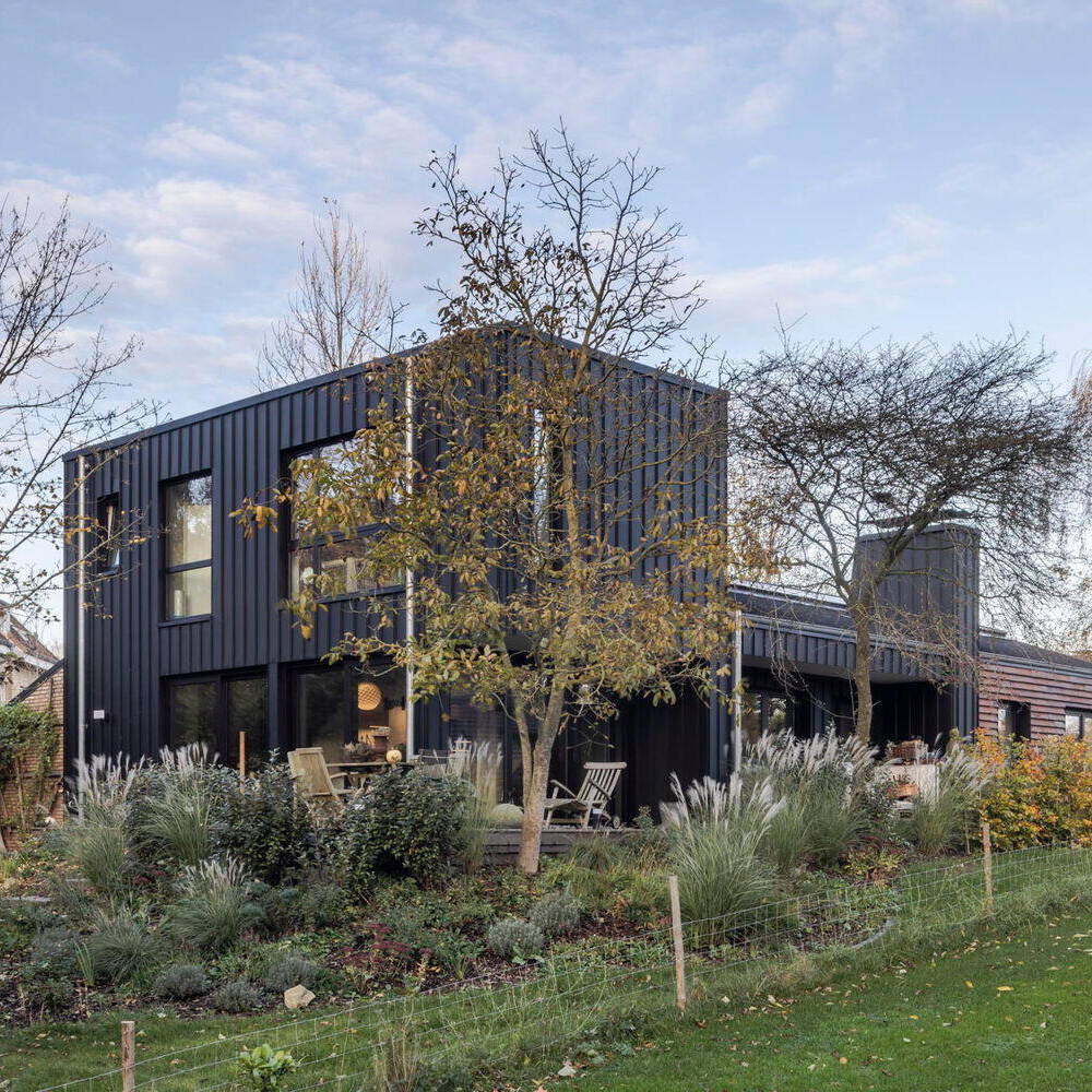 Eine perfekte Ergänzung bilden die kostengünstigen schwarzen, schmal gefalzten Stahlbleche, die die neu hinzugefügten Bauteile markieren. Da der Anbau auf einer Holzkonstruktion basiert, konnte das Bauvorhaben zügig in nur fünf Monaten umgesetzt werden. So konnte die Familie rechtzeitig zum neuen Schuljahr einziehen. Der alte Teil des Siedlungshauses verfügt über 115 m² Wohnfläche, die Erweiterung mit den großen Fensterfronten über weitere 75 m² – ausreichend Platz für die Familie und ihre Gäste.