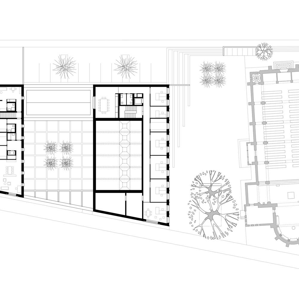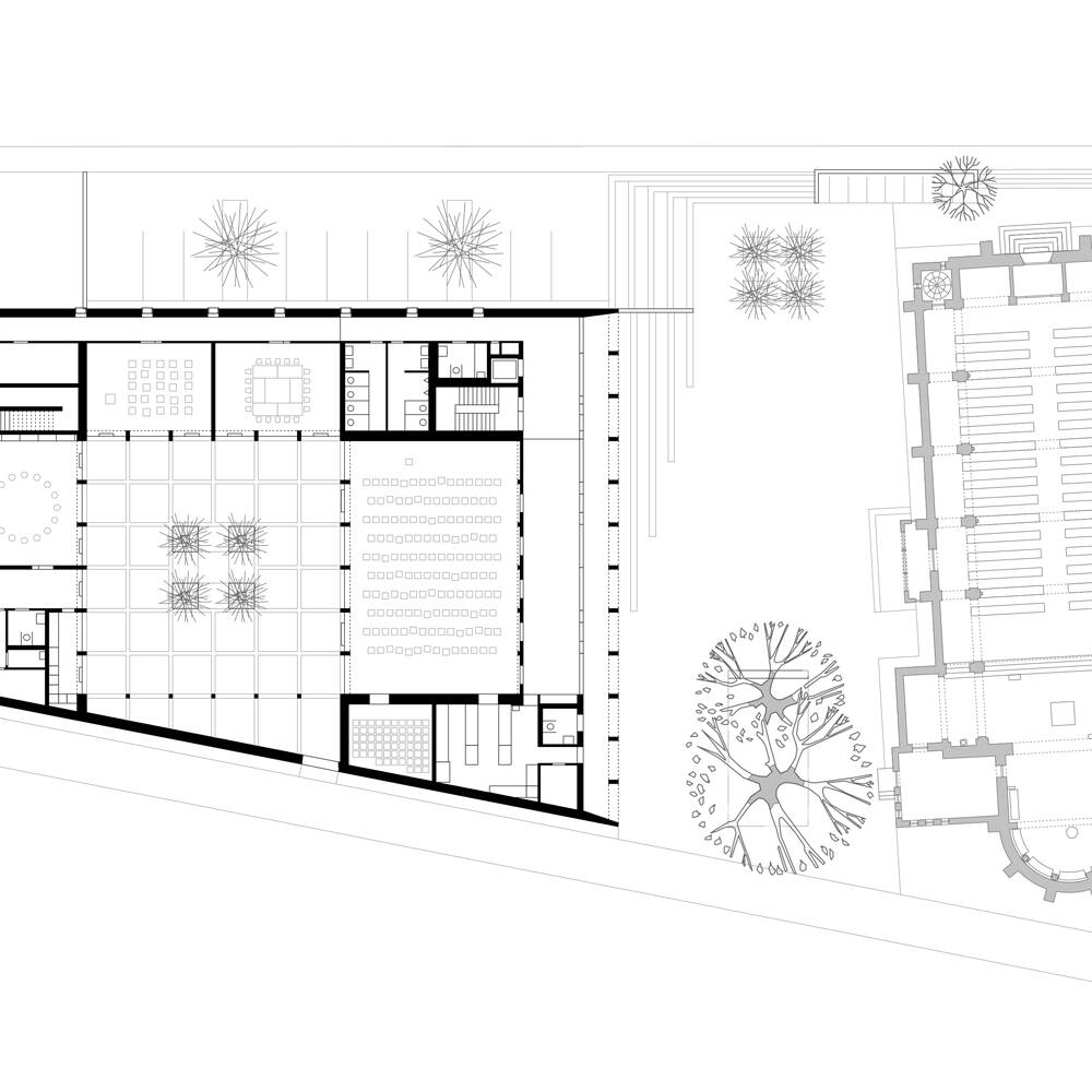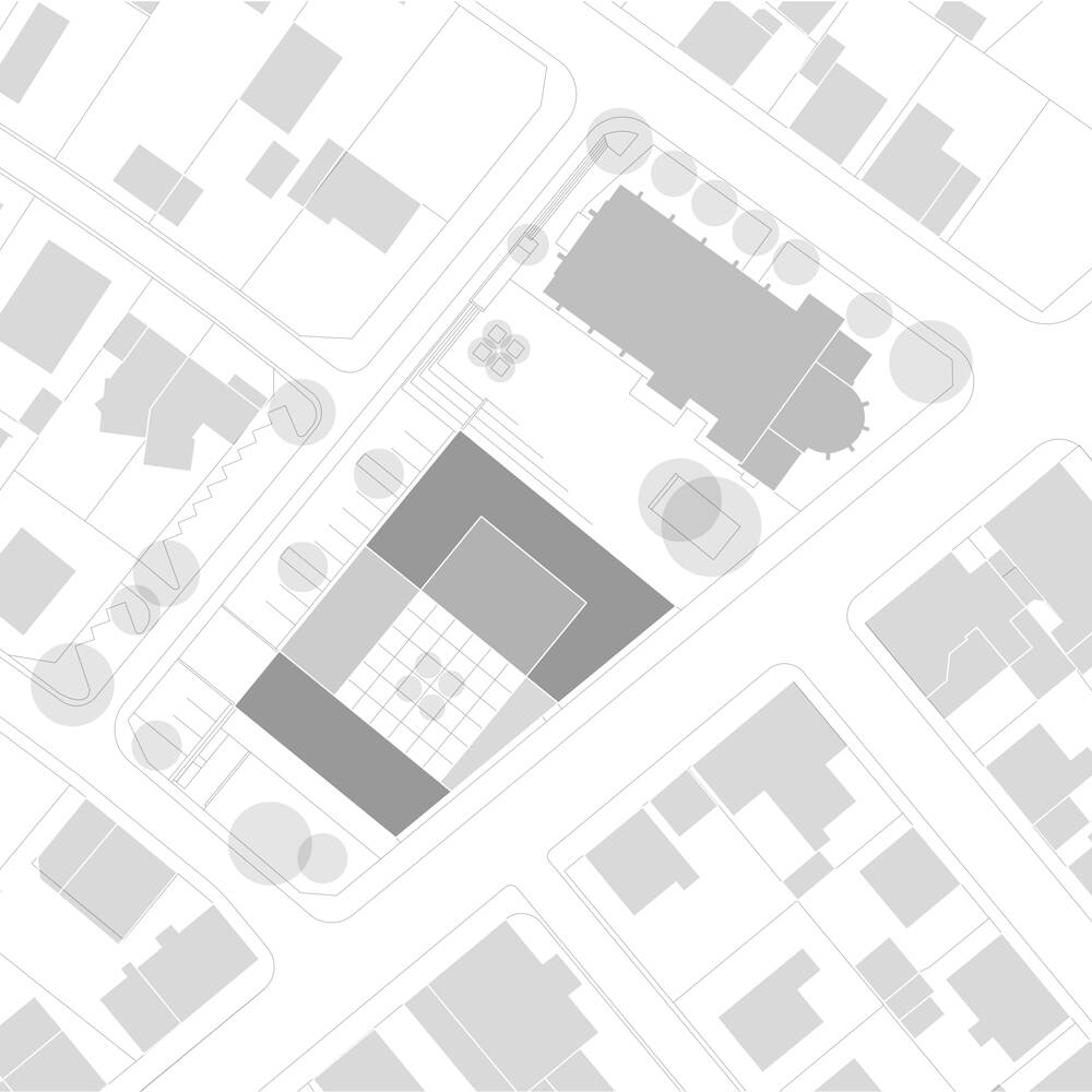 Mit einem wettergeschützten Dach orientiert sich der multifunktionale Neubau zum Vorbereich der benachbarten Kirche und bildet gemeinsam mit dem über 100 Jahr alten Gebäude ein prägnantes Ensemble. Der geschaffene Stadtraum mit Bestandsbäumen und einer neuen Baumgruppe öffnet sich nach Südosten und über eine großzügige Treppe nach Nordwesten. Während die Fassade des zweigeschossigen Gebäudes zur stark frequentierten Straße und den Parkflächen überwiegend geschlossen gestaltet ist, öffnet sie sich großzügig zum Kirchplatz und zur ruhigeren angrenzenden Straße. Das Zentrum der Anlage bildet der Gemeindesaal, der über das Foyer direkten Bezug zum Kirchplatz hat und sich auf der gegenüberliegenden Seite mit großen Fenster- und Türelementen zum zentralen Innenhof orientiert. Zusätzlich erhält er Tageslicht über plastisch ausgeformte Oberlichtöffnungen, die den über zwei Geschosse reichenden Raum dominieren. Auch alle weiteren essentiellen Funktionsbereiche des Erdgeschosses, darunter die Gruppenräume und der Jugendbereich, öffnen sich zum ruhigen Innenhof, der mit seiner streng geometrischen Ausformung einen stimmigen Kontrast zur heterogenen Umgebung bildet. Im Obergeschoss ist der Verwaltungsbereich inklusive Pfarrbüro, die Pfarrwohnung sowie zwei kleinere Wohneinheiten untergebracht. Einzelne Räume im Erdgeschoss und die Treppenräume sind farblich akzentuiert, was dem jeweiligen Funktionsbereich eine eigene Identität verleiht.