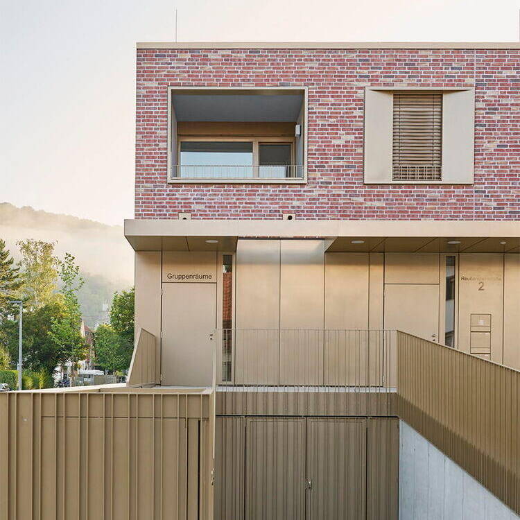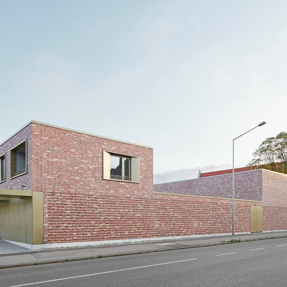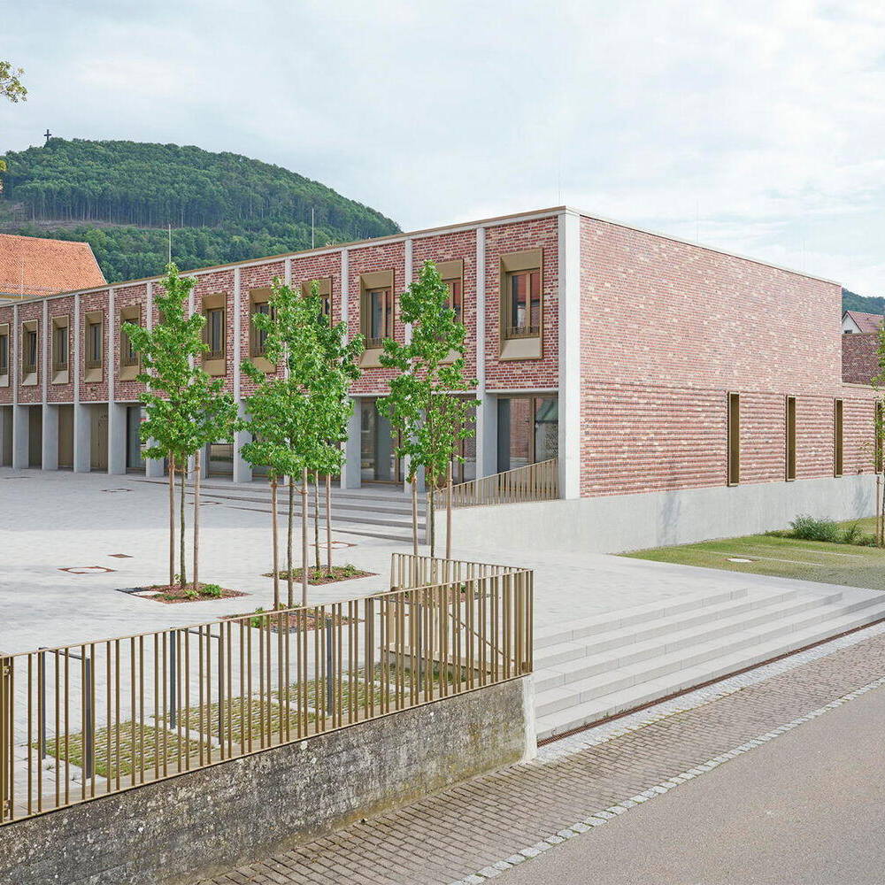 Optisch vom Kirchengebäude inspiriert, treffen an den Fassadenflächen rötliches Verblendmauerwerk und Betonfertigteile aufeinander. Vor- und Rücksprünge in der Fassade sowie teils plastisch ausgeformte Oberflächen schaffen ein prägnantes Licht- und Schattenspiel. Obwohl beide Gebäude als Ensemble wahrgenommen werden, vermittelt die moderne Formensprache des Neubaus mit seinen Fensterlaibungen aus Metall einen eigenständigen Charakter.