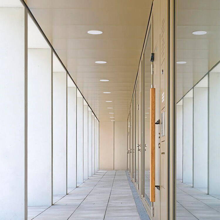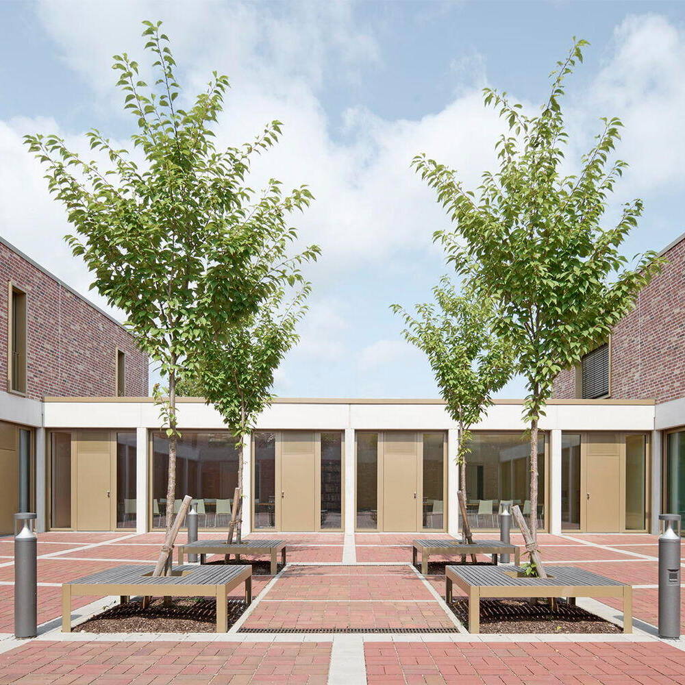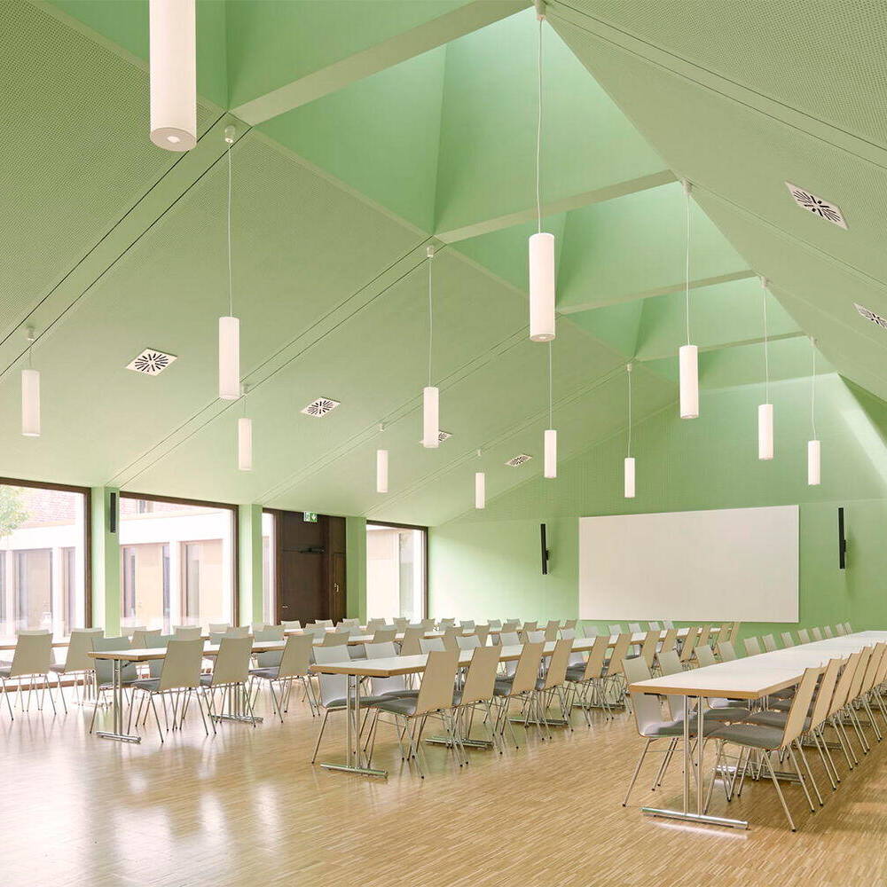 Mit einem wettergeschützten Dach orientiert sich der multifunktionale Neubau zum Vorbereich der benachbarten Kirche und bildet gemeinsam mit dem über 100 Jahr alten Gebäude ein prägnantes Ensemble. Der geschaffene Stadtraum mit Bestandsbäumen und einer neuen Baumgruppe öffnet sich nach Südosten und über eine großzügige Treppe nach Nordwesten. Während die Fassade des zweigeschossigen Gebäudes zur stark frequentierten Straße und den Parkflächen überwiegend geschlossen gestaltet ist, öffnet sie sich großzügig zum Kirchplatz und zur ruhigeren angrenzenden Straße. Das Zentrum der Anlage bildet der Gemeindesaal, der über das Foyer direkten Bezug zum Kirchplatz hat und sich auf der gegenüberliegenden Seite mit großen Fenster- und Türelementen zum zentralen Innenhof orientiert. Zusätzlich erhält er Tageslicht über plastisch ausgeformte Oberlichtöffnungen, die den über zwei Geschosse reichenden Raum dominieren. Auch alle weiteren essentiellen Funktionsbereiche des Erdgeschosses, darunter die Gruppenräume und der Jugendbereich, öffnen sich zum ruhigen Innenhof, der mit seiner streng geometrischen Ausformung einen stimmigen Kontrast zur heterogenen Umgebung bildet. Im Obergeschoss ist der Verwaltungsbereich inklusive Pfarrbüro, die Pfarrwohnung sowie zwei kleinere Wohneinheiten untergebracht. Einzelne Räume im Erdgeschoss und die Treppenräume sind farblich akzentuiert, was dem jeweiligen Funktionsbereich eine eigene Identität verleiht.