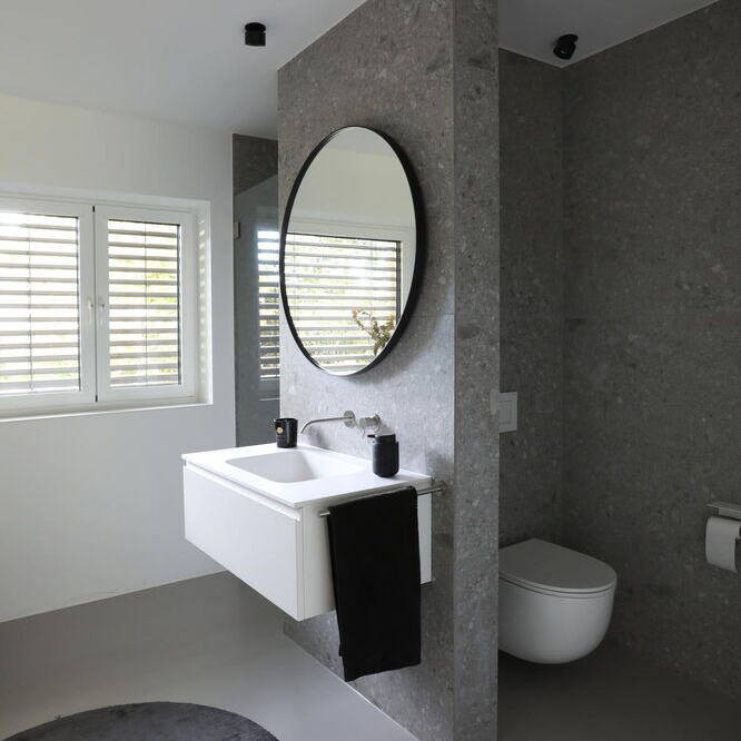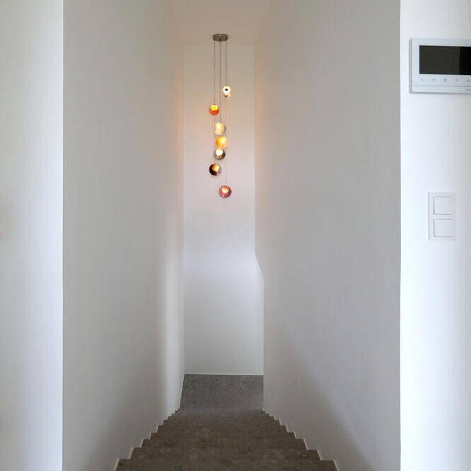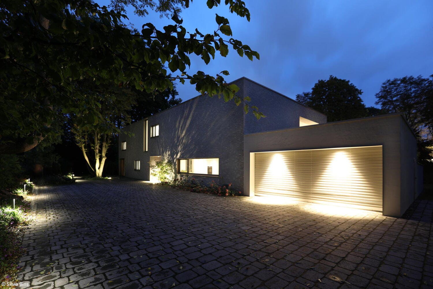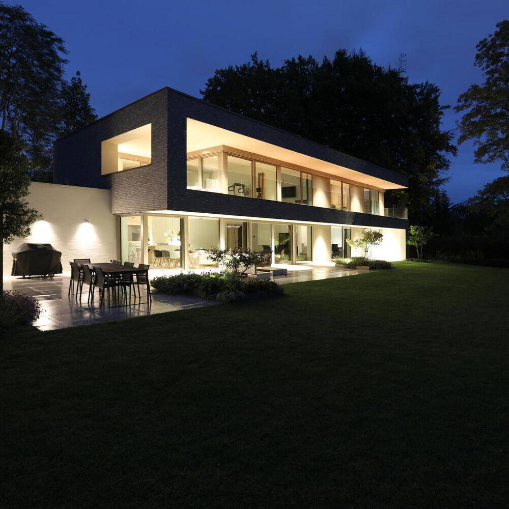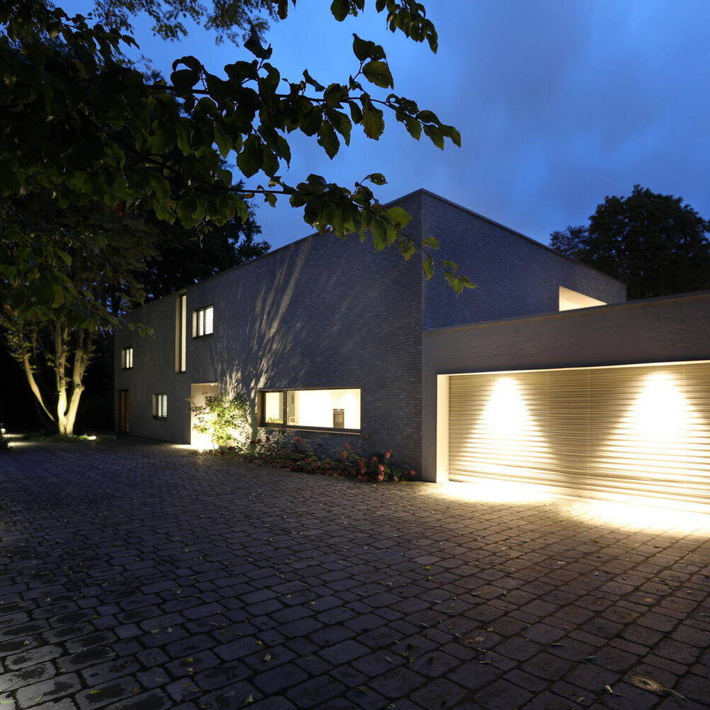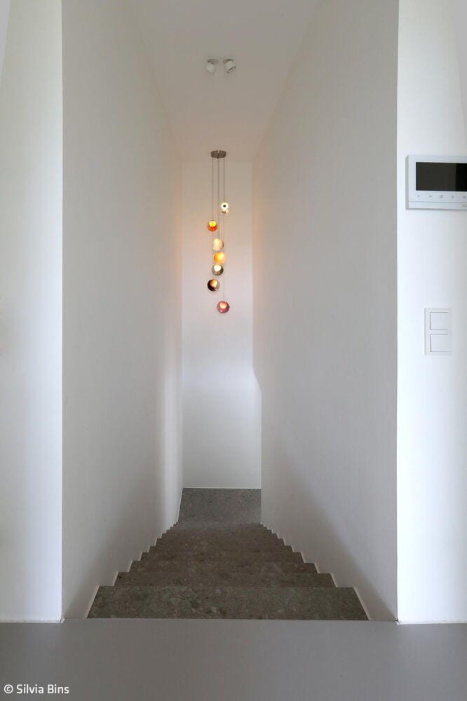 Im Obergeschoss befinden sich die Kinderzimmer mit Bad, der separierte Elterntrakt mit Masterbad und Sauna sowie Ankleide und Fitnessraum. Auch bei der Gestaltung der Innenräume wurde die reduzierte Linienführung konsequent beibehalten. Großzügige Blickachsen und der fugenlose Gussboden aus vollständig recyclefähigem Naturkautschuk unterstreichen auf beiden Geschossen die offene, fließende Architektur. Die ausgeklügelte Beleuchtung erfolgte in Kooperation mit einem Lichtplaner. Nicht zuletzt überzeugt das Gebäude auch energetisch: Eine Erdwärmepumpe sorgt für Heizung, Warmwasser und Kühlung.