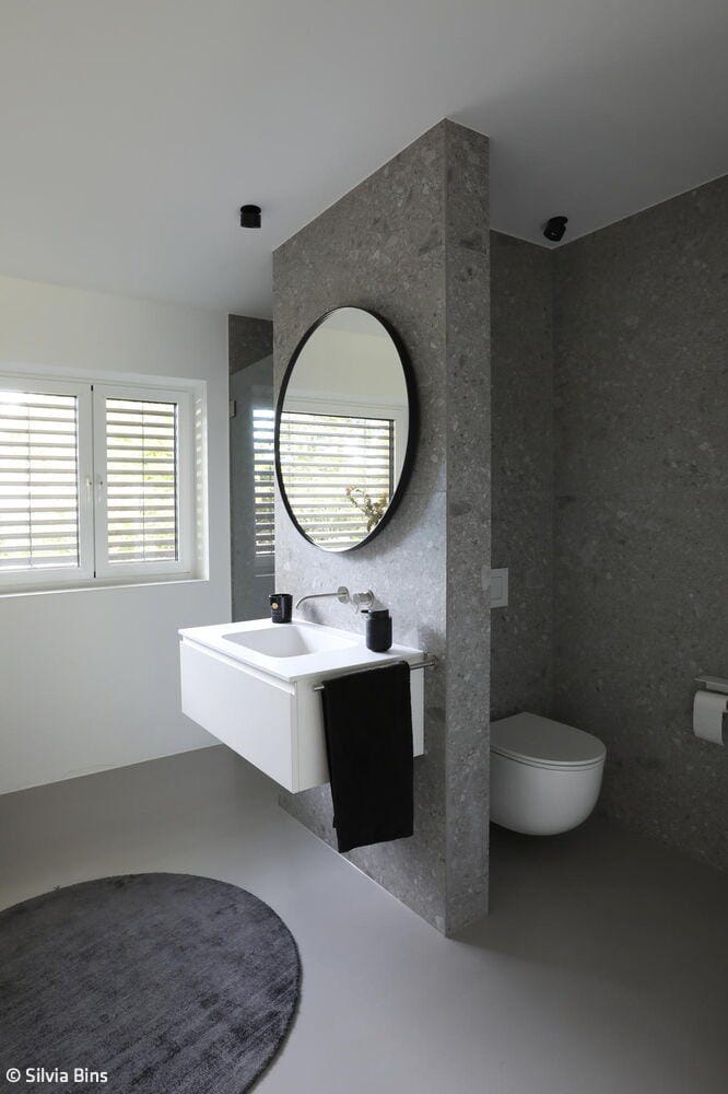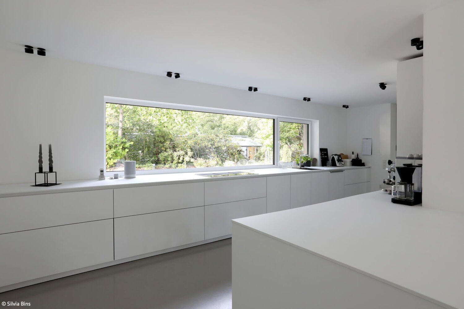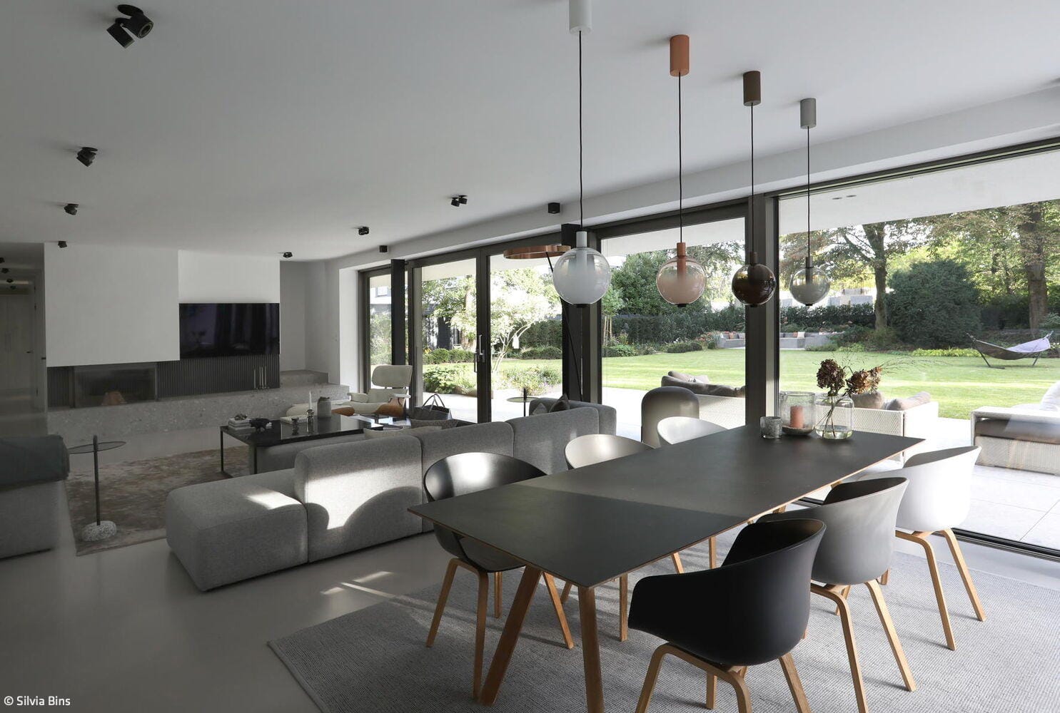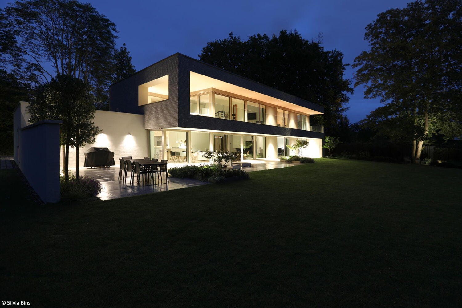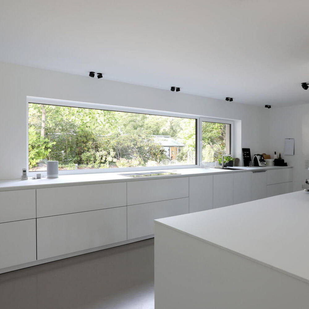 Im Obergeschoss befinden sich die Kinderzimmer mit Bad, der separierte Elterntrakt mit Masterbad und Sauna sowie Ankleide und Fitnessraum. Auch bei der Gestaltung der Innenräume wurde die reduzierte Linienführung konsequent beibehalten. Großzügige Blickachsen und der fugenlose Gussboden aus vollständig recyclefähigem Naturkautschuk unterstreichen auf beiden Geschossen die offene, fließende Architektur. Die ausgeklügelte Beleuchtung erfolgte in Kooperation mit einem Lichtplaner. Nicht zuletzt überzeugt das Gebäude auch energetisch: Eine Erdwärmepumpe sorgt für Heizung, Warmwasser und Kühlung.