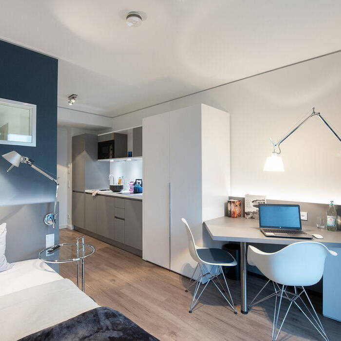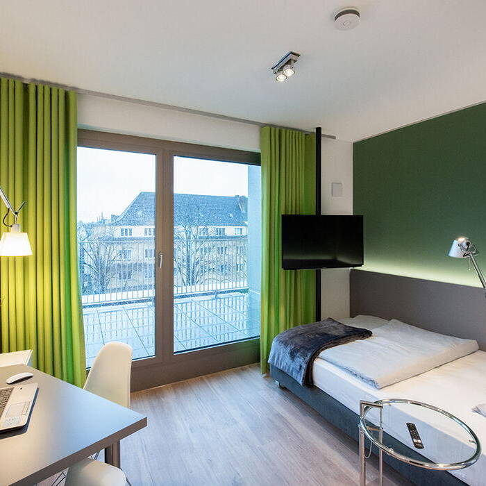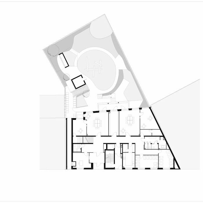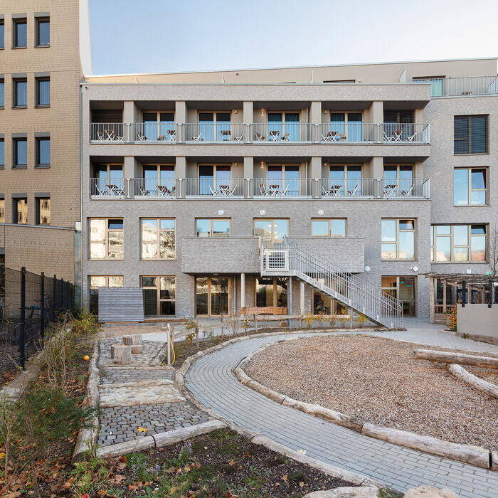 Gerahmt von individueller Wohnbebauung zur linken und dem achtgeschossigen Bezirksrathaus Lindenthal zur rechten Seite, orientiert sich der Neubau nach Süden zur stark vom Verkehr geprägten Aachener Straße. Nach Norden wendet er sich dagegen einem deutlich ruhigeren Blockinnenbereich zu. Der urbanen Lage entsprechend, erhielt das Gebäude eine ruhige, steinerne Fassade in einem warmen Grauton. Kombiniert wird diese mit bodentiefen eloxierten Integralfenstern, deren regelmäßiger Rhythmus von einer zweigeschossigen Loggien-Anlage im 2. und 3. Obergeschoss unterbrochen wird. Im gesamten Erdgeschoss sowie dem ersten Obergeschoss sind die Räume einer Kindertagesstätte mit vier Gruppen angesiedelt – gegliedert in je zwei U3- und zwei Ü3-Gruppen. In den Etagen darüber gruppieren sich 37 möblierte Apartmentwohnungen mit rund 913 m² Gesamtwohnfläche, wobei das 4. Obergeschoss, den Vorgaben im Bebauungsplan entsprechend, zurückgestaffelt wurde. Aufgrund der stark befahrenen Straßensituation konnten die straßenseitig orientierten Apartments nur unter der Berücksichtigung extremer Schallschutzanforderungen realisiert werden. Die Loggien und Terrassen, die den Wohnungen zu beiden Gebäudeseiten vorgelagert sind, erlauben dabei weite Ausblicke über den Kölner Süden. Da die neu errichtete Tiefgarage an eine bestehende Tiefgarage auf dem Nachbargrundstück angeschlossen wurde, konnte auf eine eigene Garagenzufahrt von der Straße aus verzichtet werden. Die beiden Etagen der Kindertagesstätte, die rund 800 m² Fläche umfassen, sind im Foyer durch eine großzügige interne Treppe verbunden. Eine zusätzliche Außentreppe, die den Kindern auch aus dem Obergeschoss den direkten Zugang zur Spielfläche ermöglicht, stellt gleichzeitig den zweiten Rettungsweg dar. Die Außenanlagen stehen der Kita als Spielfläche zur Verfügung. Naturmaterialien, heimische Pflanzen und weiche Oberflächen stellen einen verspielten Kontrapunkt zum städtischen Umfeld dar und bilden einen natürlicher Erlebnisraum zum Spielen und Experimentieren.